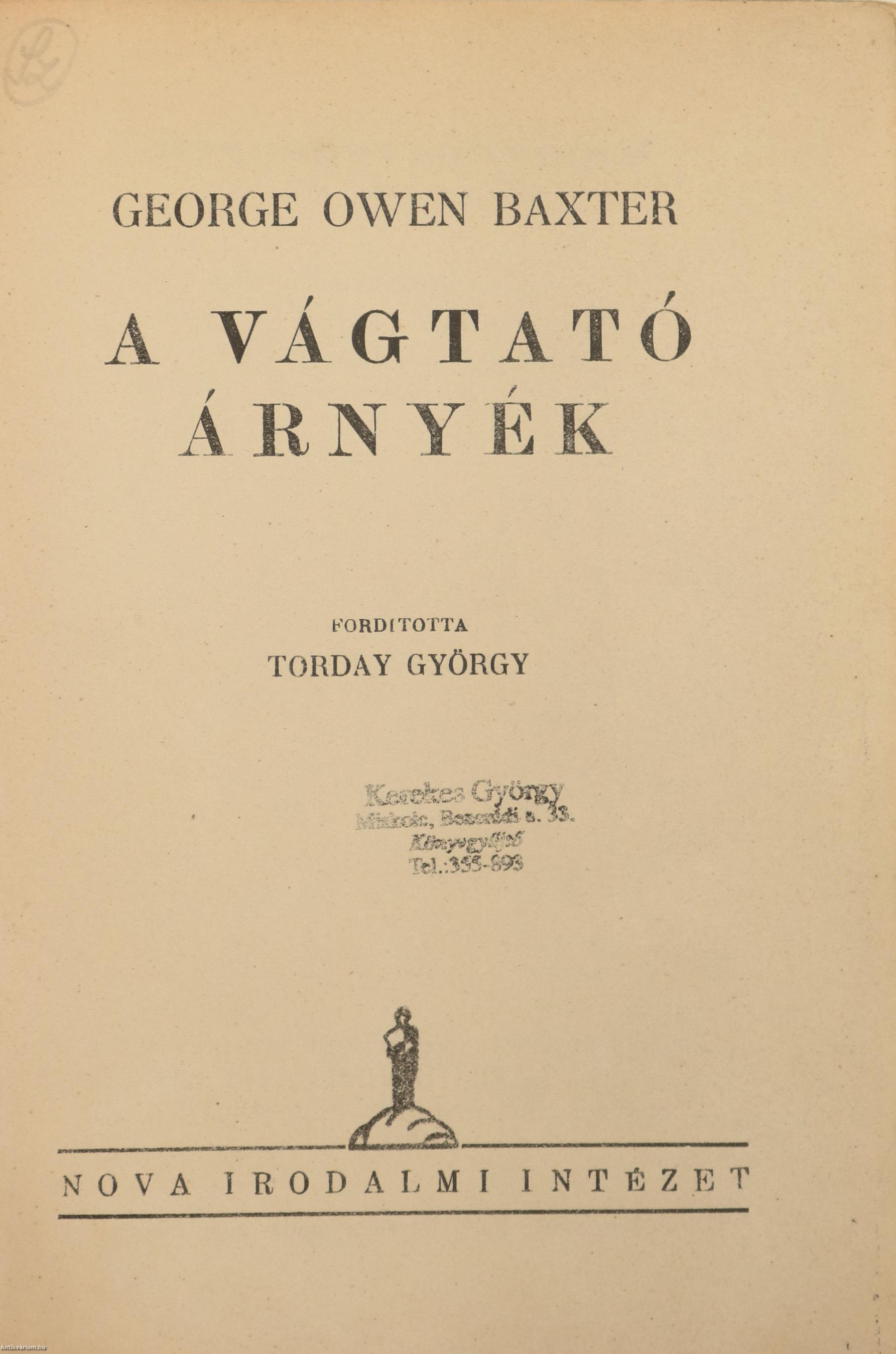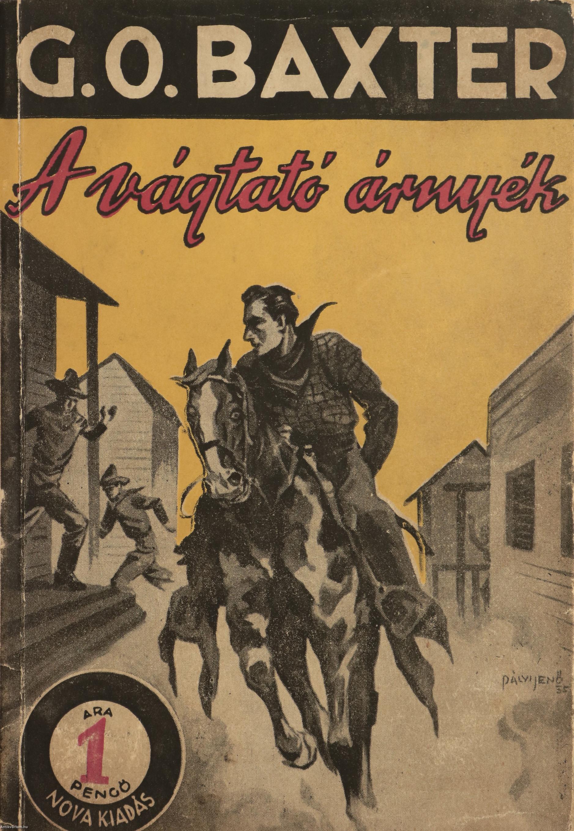 Első magyar nyelvű kiadás. Kalandos Regények c. sorozatban (számjelzés nélkül) megjelent mű. Szerkeszti: Tábori Kornél. A vágtató árnyék. Írta: George Owen Baxter. Fordította: Torday György. A címfedél grafikáját Pályi Jenő készítette. Korabeli könyvhirdetésekkel kiegészített kötet. A címlapon tulajdonosi bélyegzés látható. Nyomtatta Radó István Nyomdai Műintézete. Kiadói tűzött papírkötésben lévő példány több színnel feliratozott, illusztrációval ellátott címfedéllel, feliratos, javított könyvgerinccel, a foltos hátlapon a sorozat hirdetésével, hiánytalan állapotban. "...Az «Árnyék», akit már Baxter első könyvéből, a «Sátán cimborájából» jól ismer olvasóközönségünk - visszatér több évi távollét után - a lányért, akit fanatikusan szeret. Természetesen ez nem történik meg ilyen simán, hanem a vadnyugati bandita egész útja, szereplése tele van izgalmak, lélekzetelállító eseményekkel. Itt azonban már egy másik főszereplővel is találkozunk, a kalandvágyó fiatalemberrel, aki megszökik hazulról, hogy a vadnyugati férfiak veszélyekkel teli életetélje..." - (Kárpáti Magyar Hírlap, 1935. október 06./16. évfolyam/115. szám).