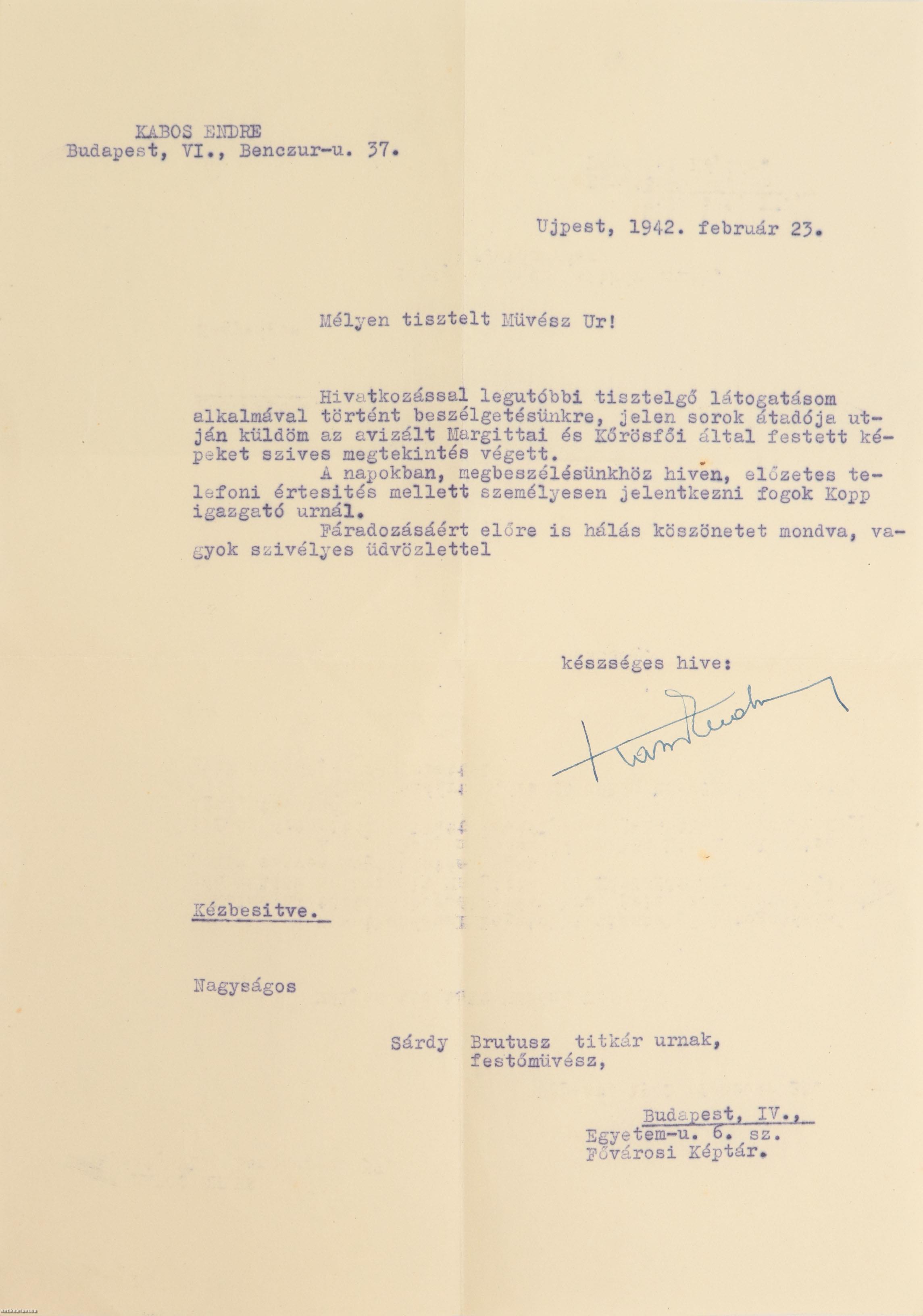 A levél tárgya: Kabos Endre hivatkozva a legutóbb történt beszélgetésére Sárdyval, elküldte az avizált Margittai és Kőrösfői által festett képeket megtekintésre. Ezenkívül biztosítja arról a címzettet, hogy a napokban megbeszélésükhöz híven jelentkezni fog Kopp [Jenő] igazgató útnál.