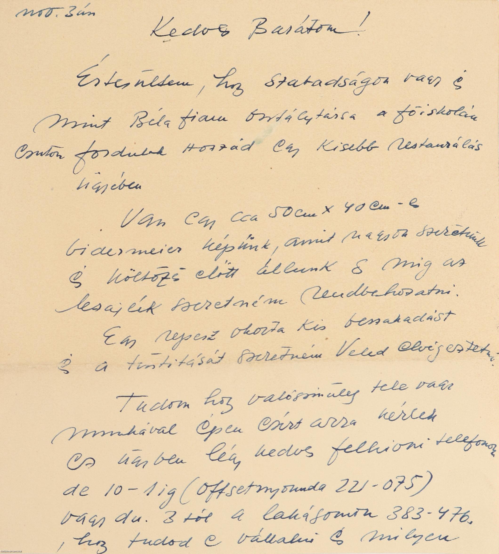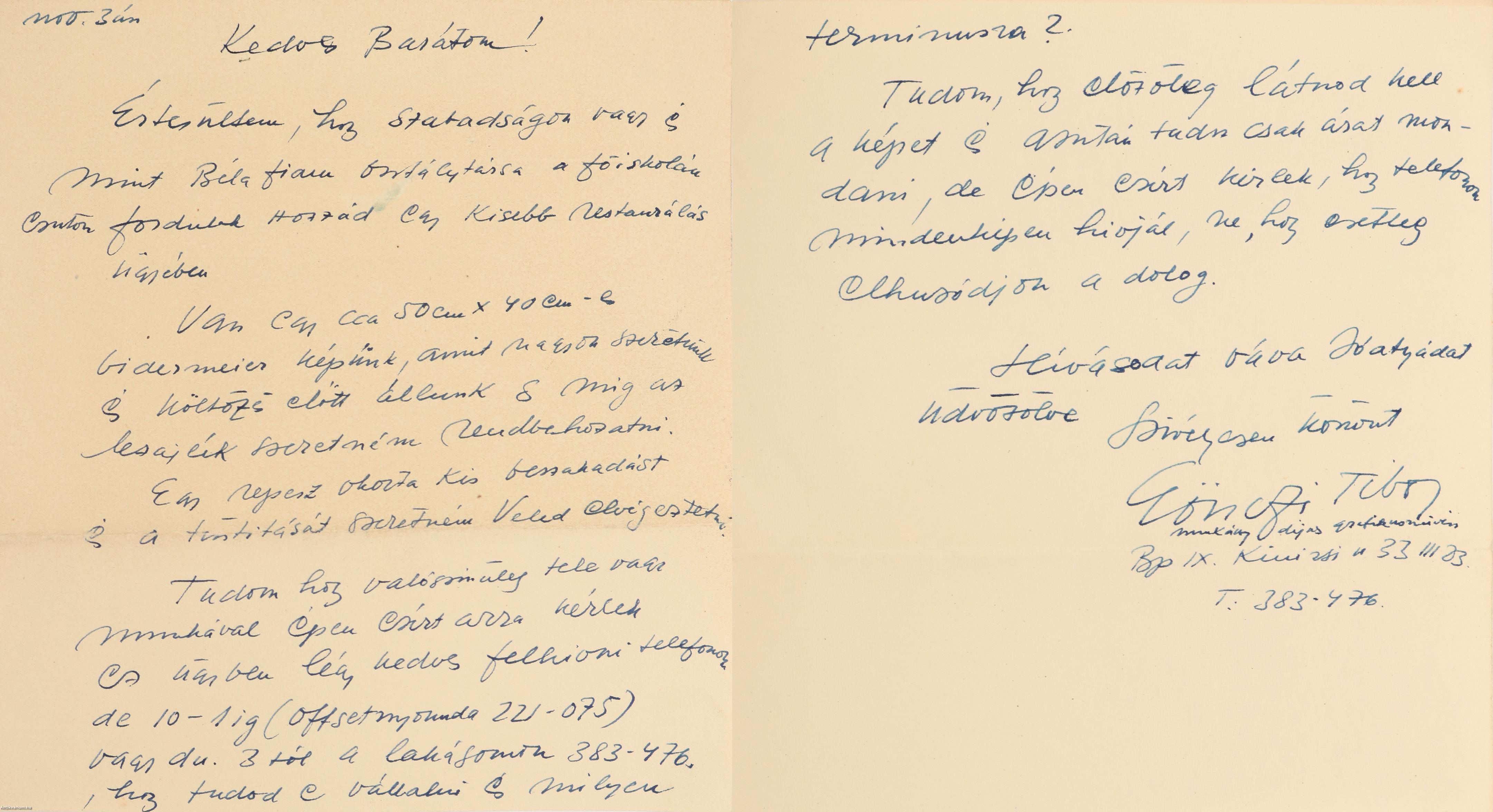 A levél tárgya: Gönczi-Gebhardt Tibor egy kisebb restaurálás ügyében fordul Sárdyhoz, mint Béla fia főiskolai osztálytársához. Szeretné a tulajdonában lévő Vidermeier képén lévő repesz okozta kis beszakadás javítását, valamint a festmény tisztítását elvégeztetni, valamint kéri hogy ez ügyben keresse meg telefonon.