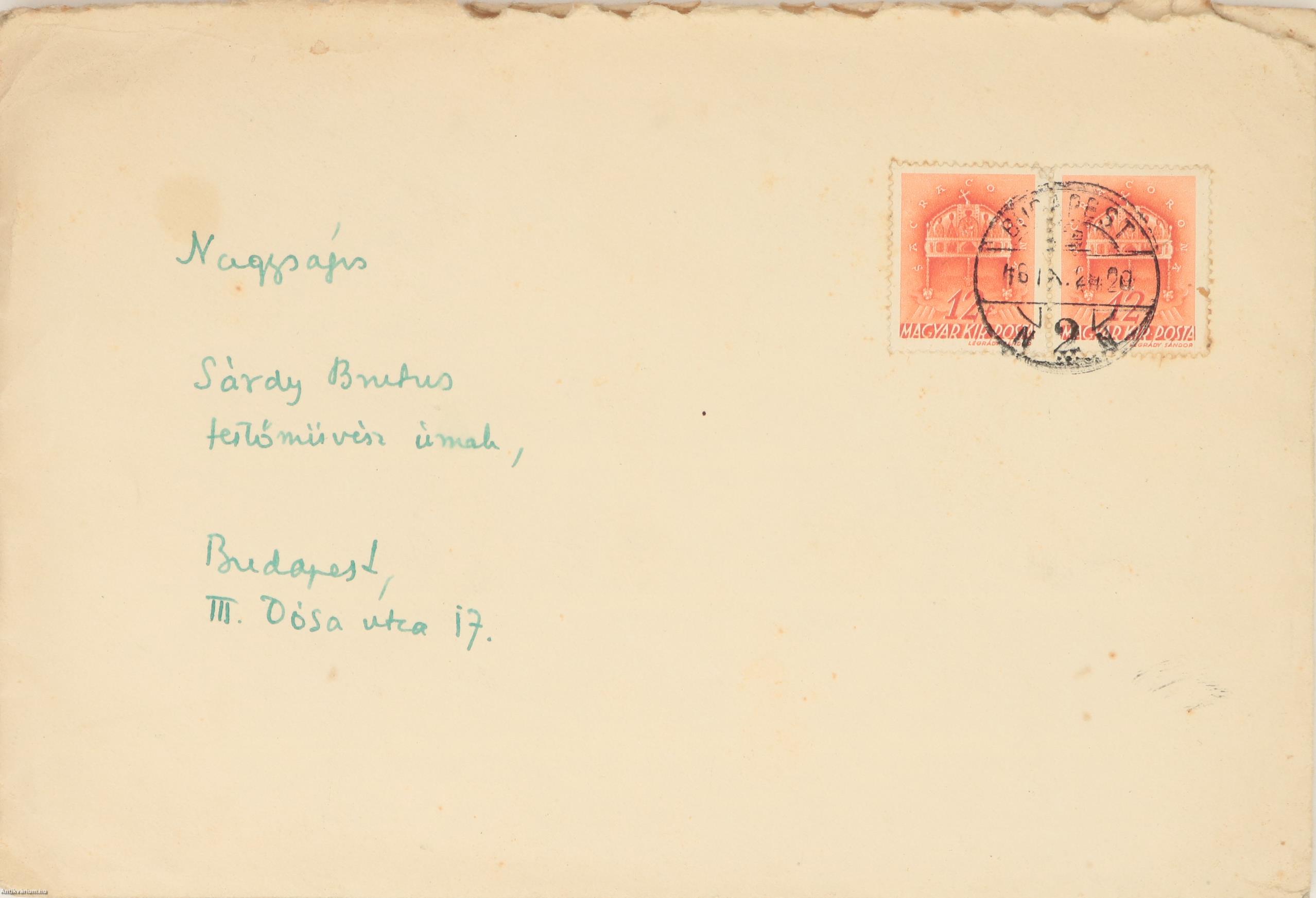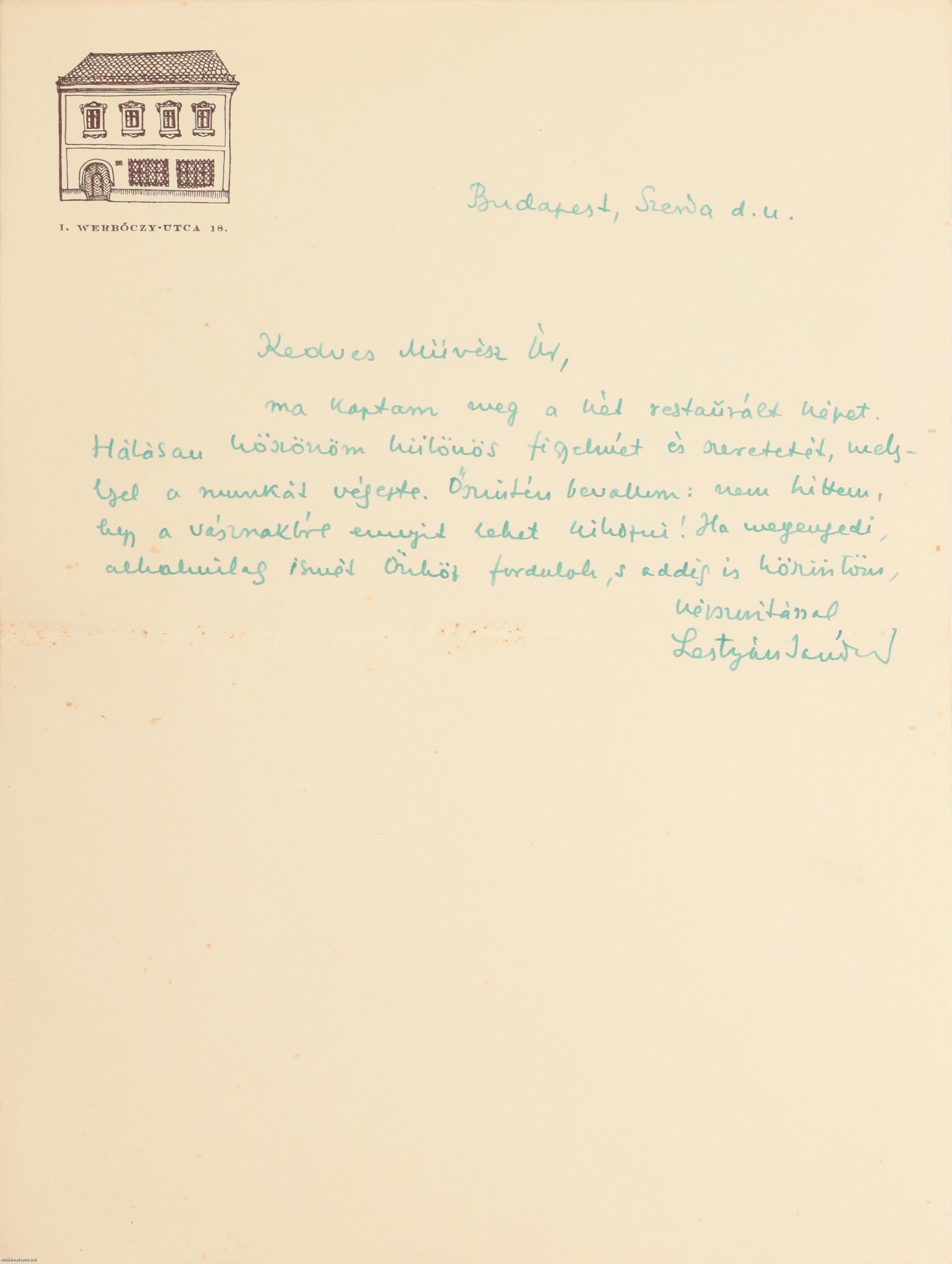 Hajtogatott, kézzel írt, a "Werbőczy-utca 18." feliratozású és illusztrált fejléccel, illetve keltezéssel (Budapest, szerda d. u.) ellátott, egy oldal terjedelmű, jó állapotú levél, eredeti, kézzel címzett, két bélyeggel és egy postai bélyegzéssel ellátott borítékban.