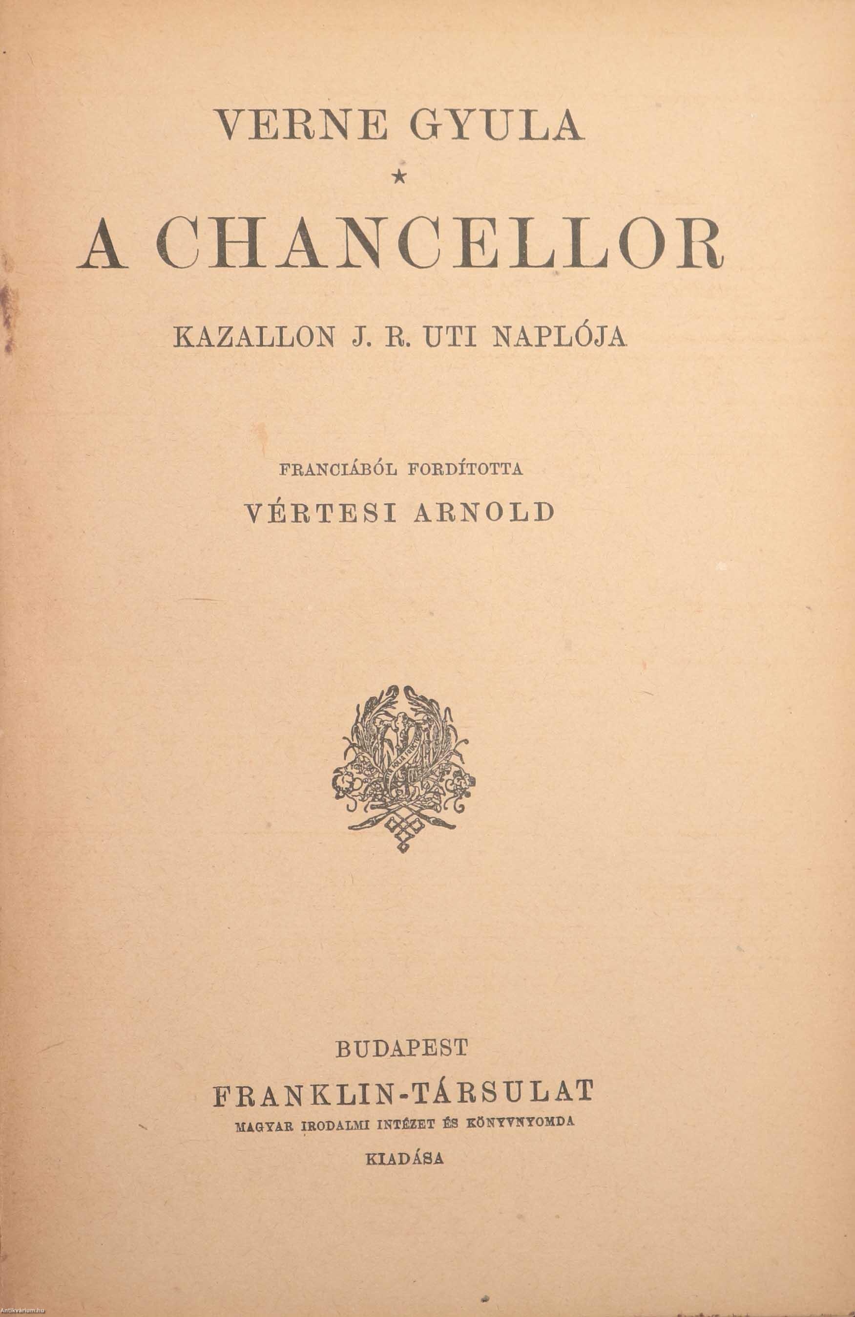 A Chancellor. Kazallon J. R. úti naplója. Regény. Írta: Verne Gyula. Franciából fordította: Vértesi Arnold.