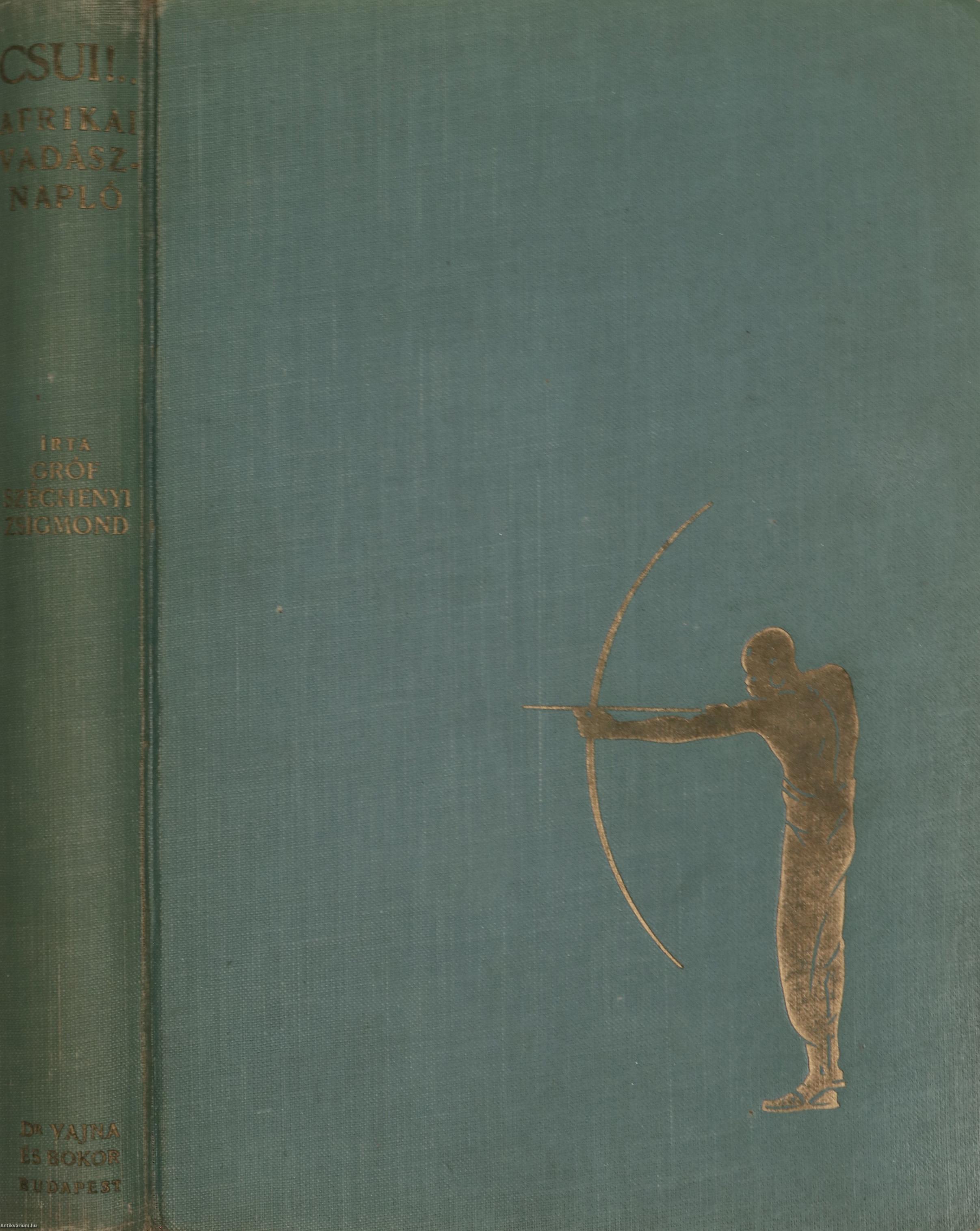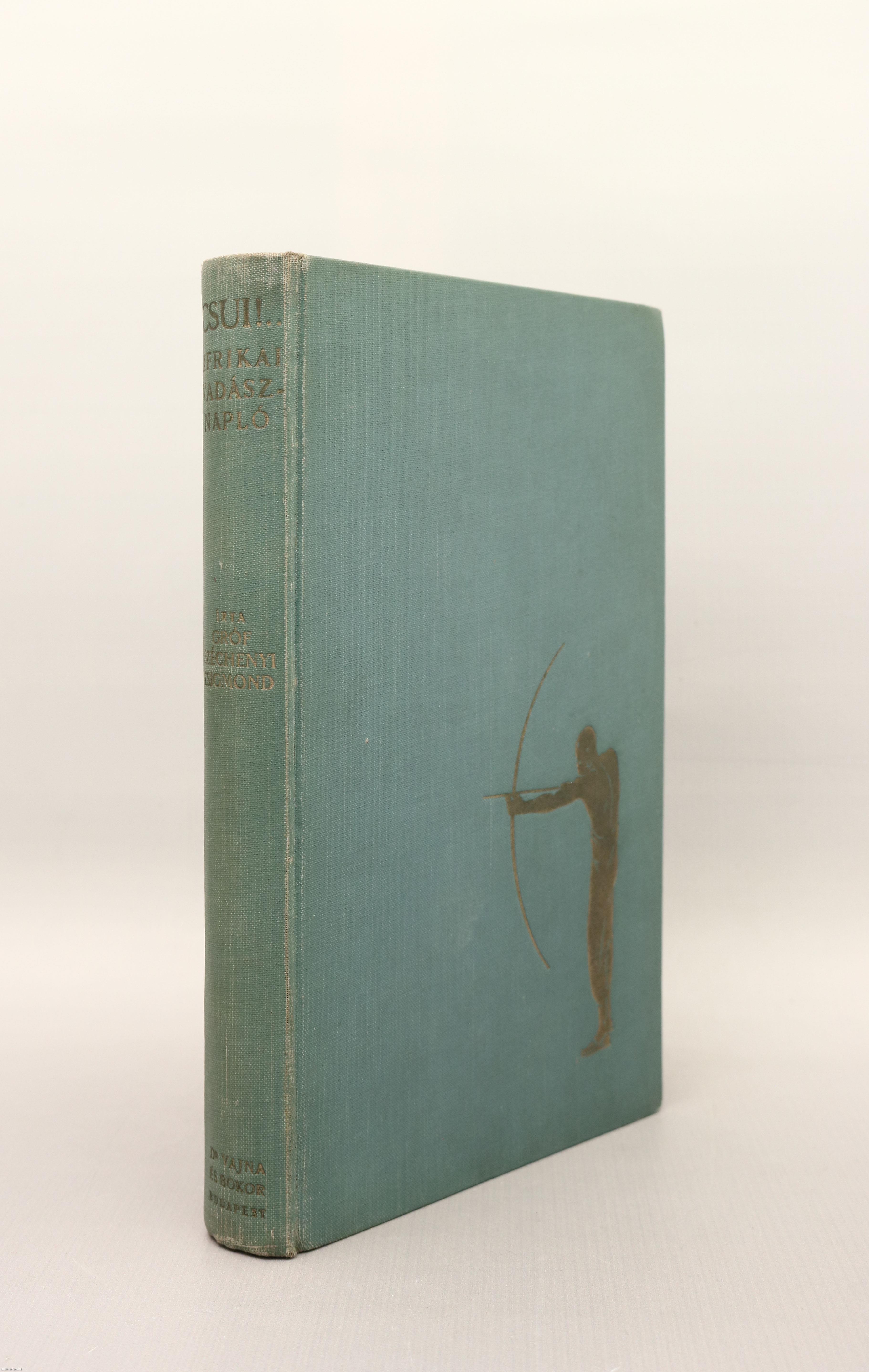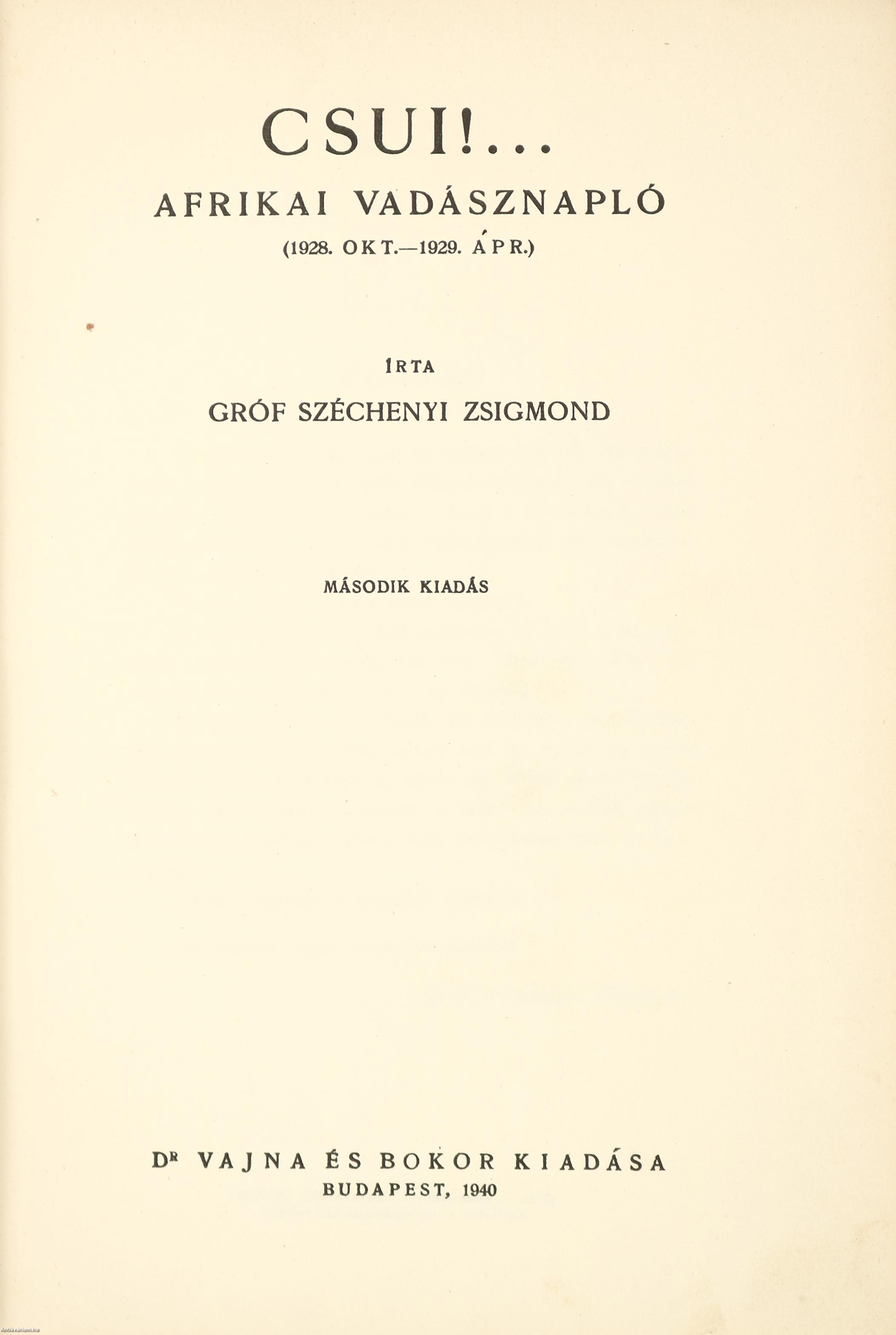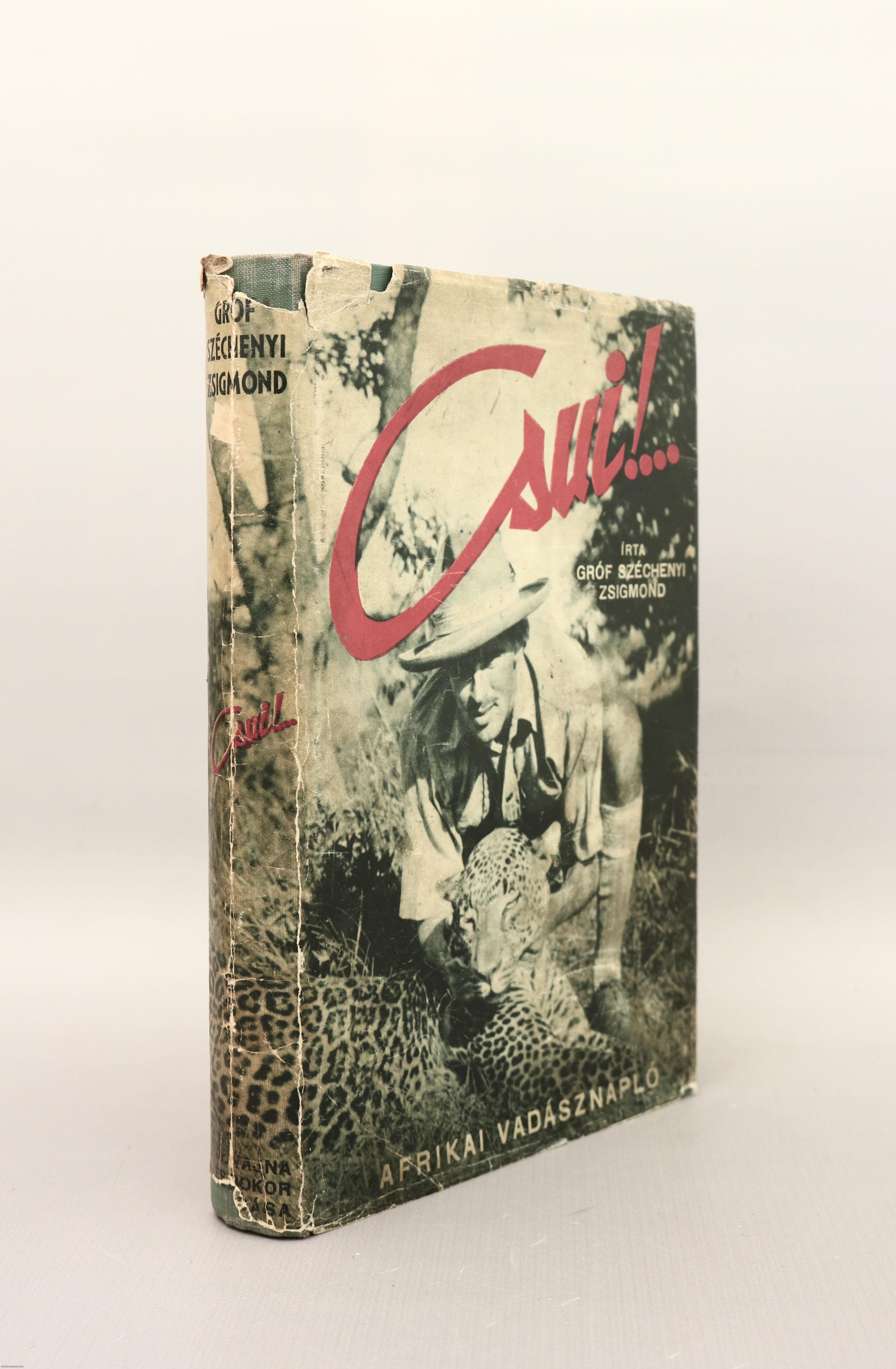 Csui!... Afrikai vadásznapló (1928. okt. - 1929. ápr.). Írta: Széchenyi Zsigmond. Második kiadás. Negyven képtáblán a szerző fekete-fehér, feliratozott fotóival illusztrált, valamint szerzői előszóval és az utazás alatt elejtett vadak felsorolásával kiegészített mű. Nyomtatta az Athenaeum R.-T. Könyvnyomdája, Budapesten. Kiadói egészvászon kötésben lévő példány feliratozatlan, aranyozott illusztrációval ellátott címfedéllel, aranyozott feliratozású könyvgerinccel, térképpel illusztrált, kiadói előzéklapokkal, több színnel feliratozott, fényképpel illusztrált, fülszöveges, sérült, hiányos, kiadói borítófedélben. "A szerző könyve nem szokványos vadásznapló, hanem sokkal több. Benne a természet szabadságában élő élőlények közös, egymásra utalt létezése válik megélt élménnyé." - vall a kötetről Molnár Gábor magyar vadász és utileírásíró. A szerző, gróf Széchenyi Zsigmond (Nagyvárad, 1898. január 23. – Budapest, 1967. április 24.) vadász, vadászati író, utazó. A magyar vadászati kultúra kimagasló alakja. Afrika, India, Alaszka és Európa híres vadásza. Kiemelkedő vadásztrófeája egy világrekorder addax (mendeszantilop). Vadászkönyvtára Magyarország legjelentősebb vadászati szakkönyv gyűjteménye, ami jelenleg a Magyar Természettudományi Múzeumban tekinthető meg.