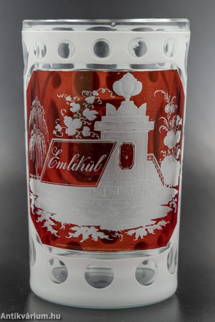 Hibátlan állapotú, fújt és kézzel formázott magyar biedermeier emlék üveg pohár a 19. század közepéről. A kétszínű (fehér - bordó) üveg pohár überfang technikával készült, amelynek jellegzetessége a második ráfújt rétegből való visszacsiszolás, illetve visszagravírozás. A fehér rétegén geometrikus visszacsiszolás látható, középső bordó üveg felületen "Emlékül" felirat olvasható. Talpa lapra csiszolt, középen a fújás helye körkörösen kicsiszolva.