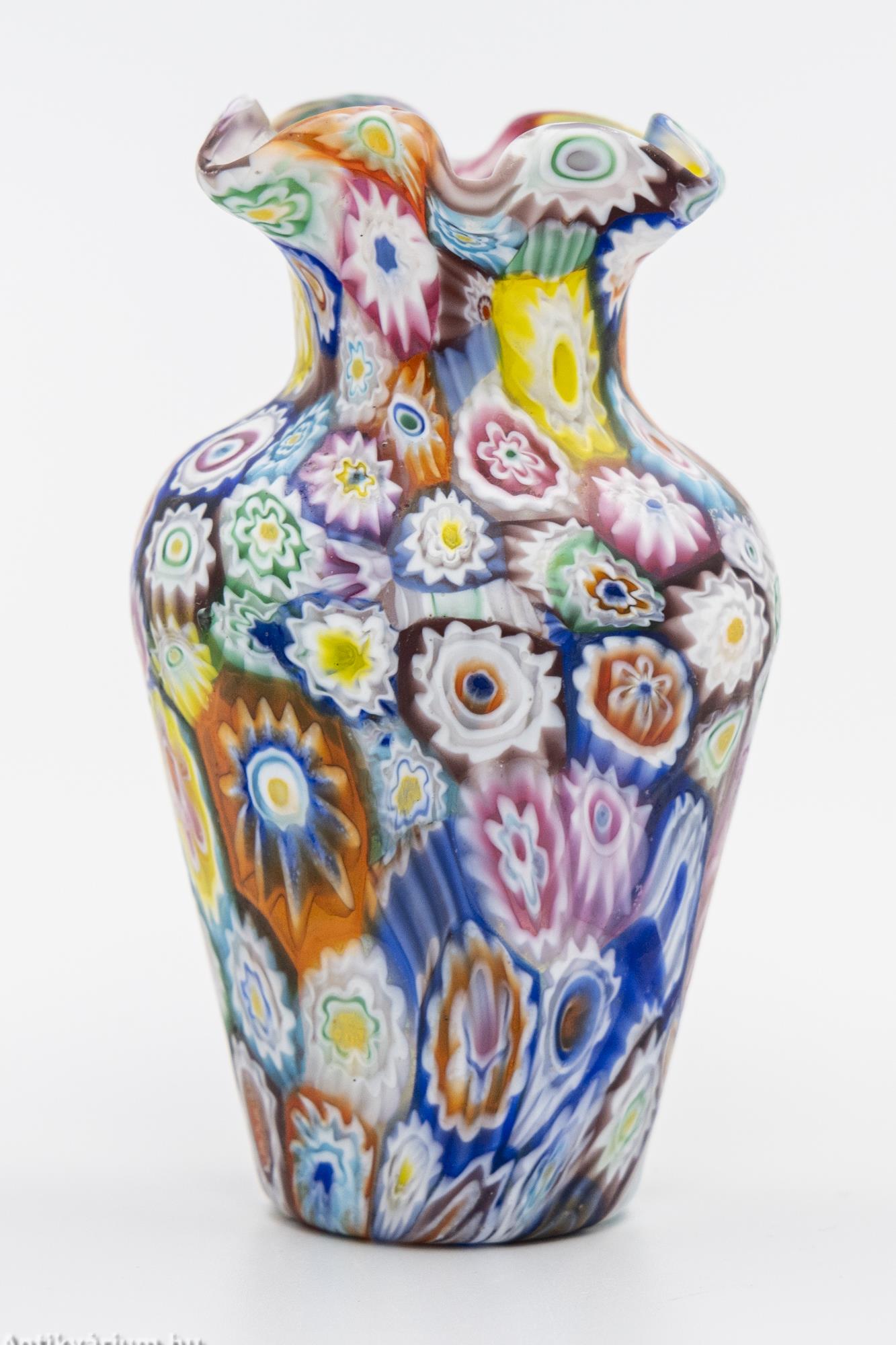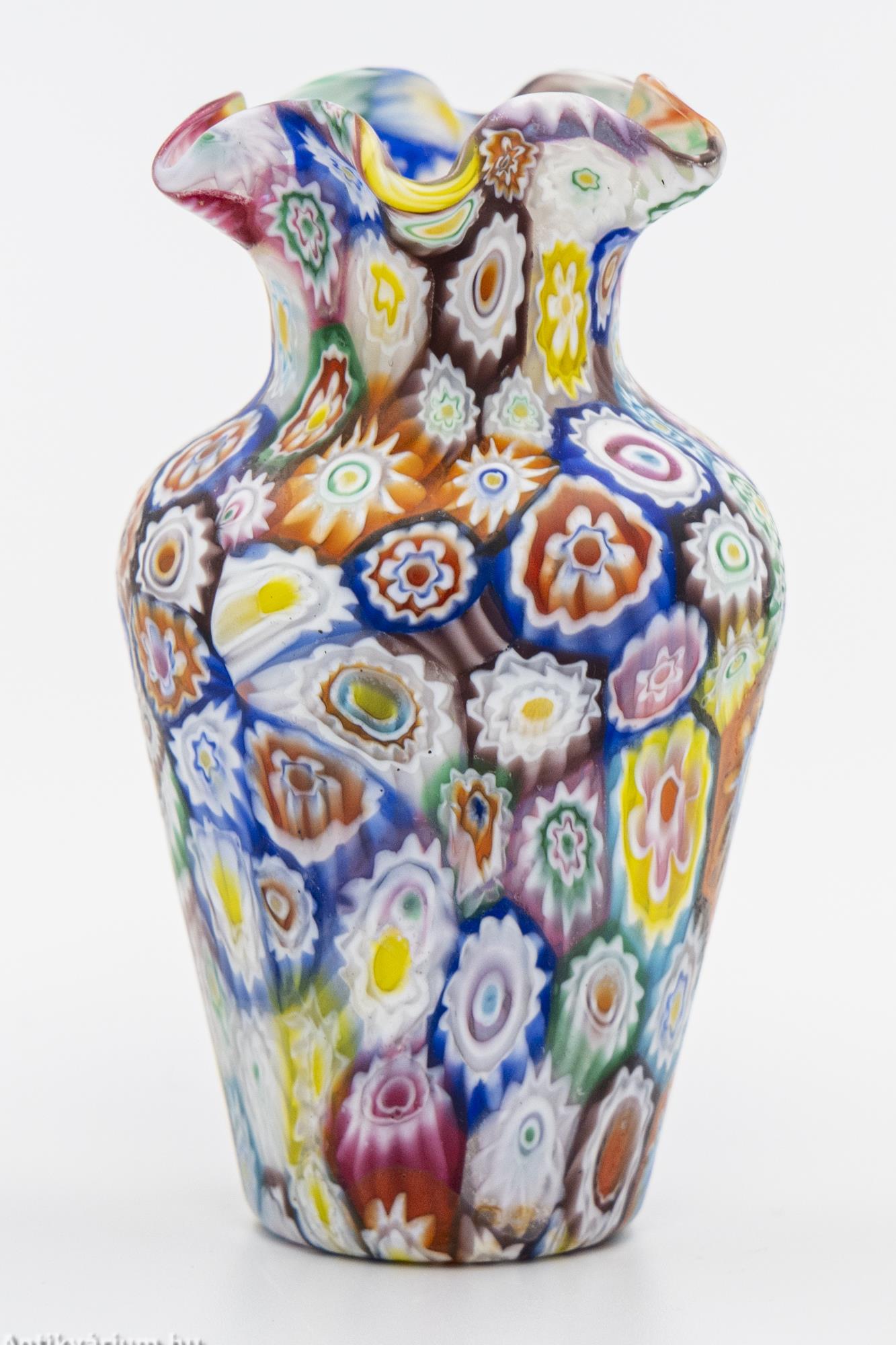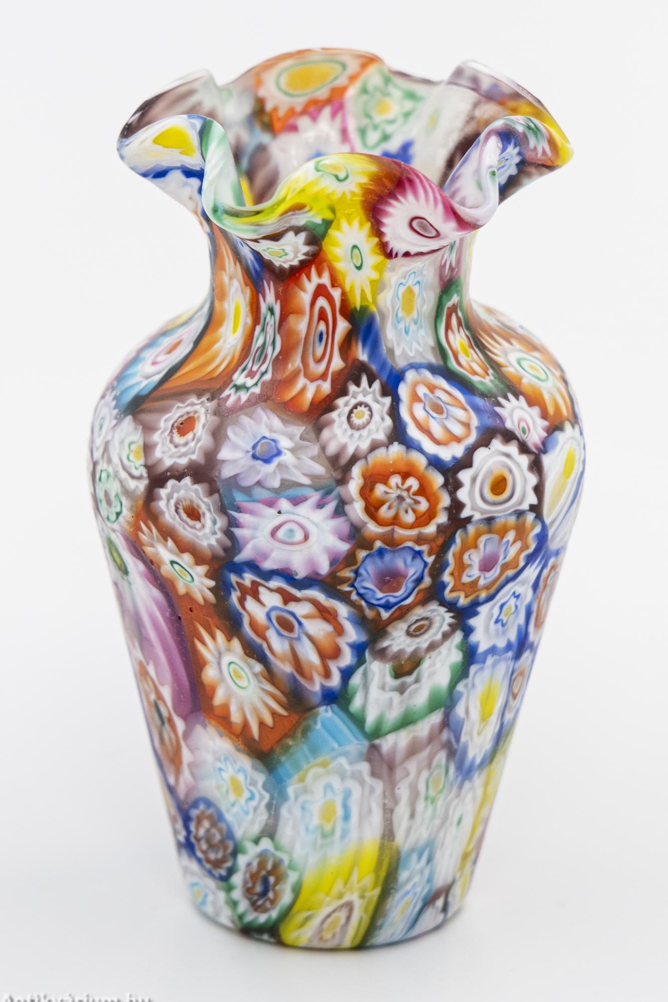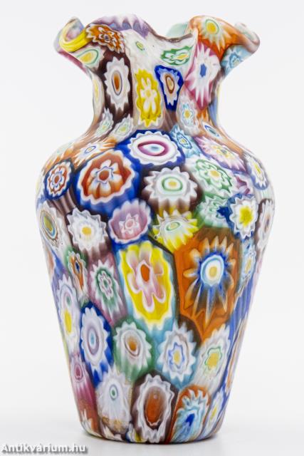 Hibátlan állapotú gyönyörű muranoi kézzel fújt és formázott Fratelli Toso Millefiori virágmozaikos olasz művészi üveg váza a 20. század elejéről. Szabálytalan elrendezésű, váltakozó mintájú méretű és színű virágmotívumokkal díszített. Élénk színű virágaiban megtalálhatjuk a kék - zöld - piros - pink és a sárga színek különböző árnyalatait. A talpán a fújás helye (köldök) látható. A "Millefiori" technikát sűrű, színes virágdíszítési minta jellemzi.(millefiori, magyarul: „ezer virág”) Úgy állítják elő, hogy először egy köteg vékony, különböző színű üvegrudat hevítenek addig, amíg a rudak összeolvadnak. A köteget vékonyra húzzák, lehűtik és keresztmetszetben felszeletelik, így kis, virágszerű mintázatú korongok keletkeznek. Ezeket a korongokat melegen fújt üvegtárgyakra helyezik, majd felmelegítik és másodszor is fújják. Az eredményül kapott termék egy ragyogó színű üvegáru bonyolult, fakulásálló díszítőmintával.