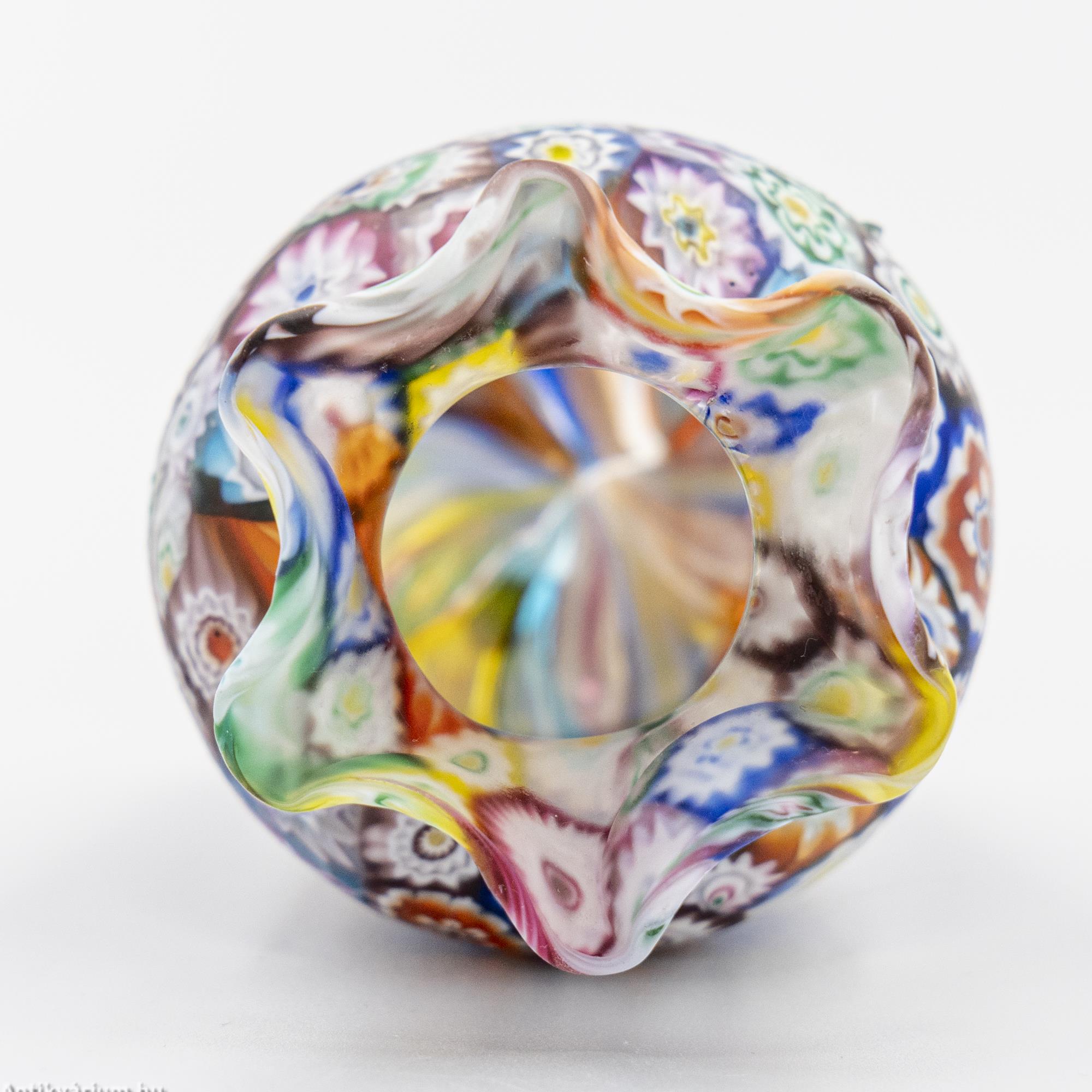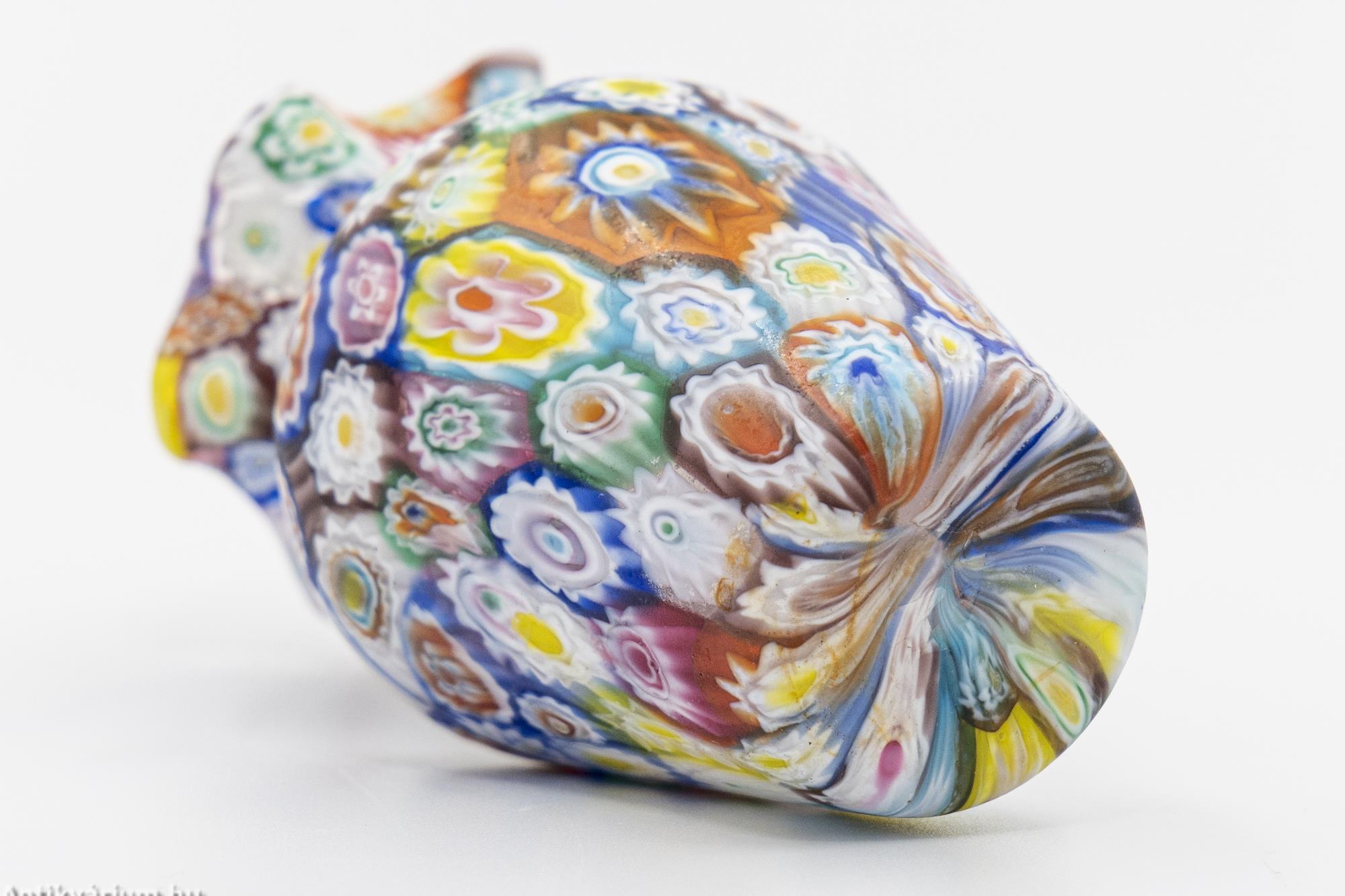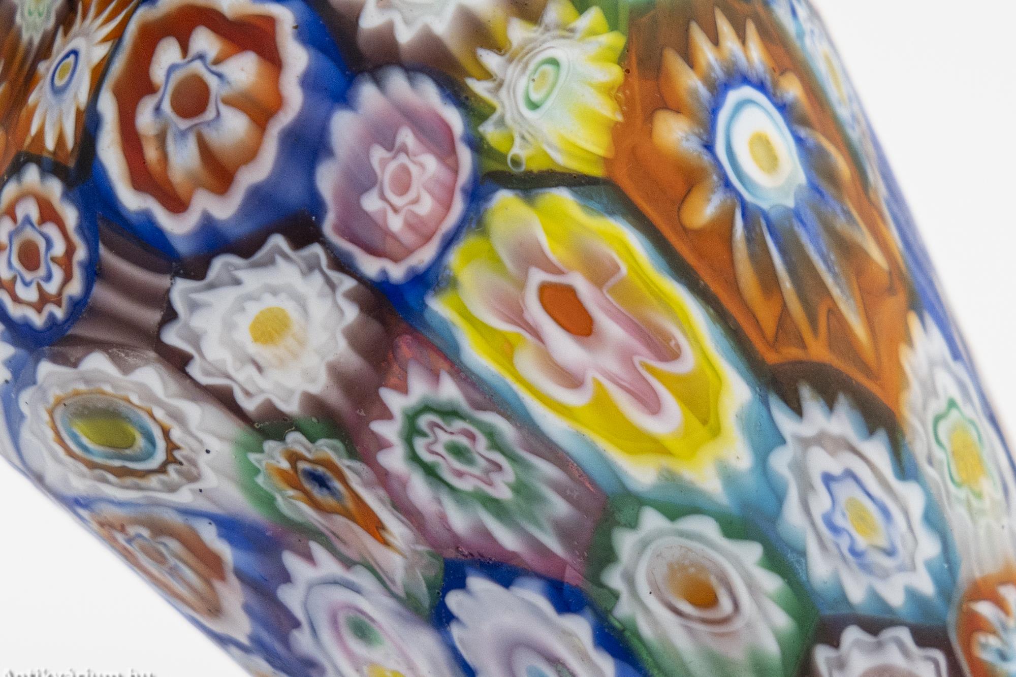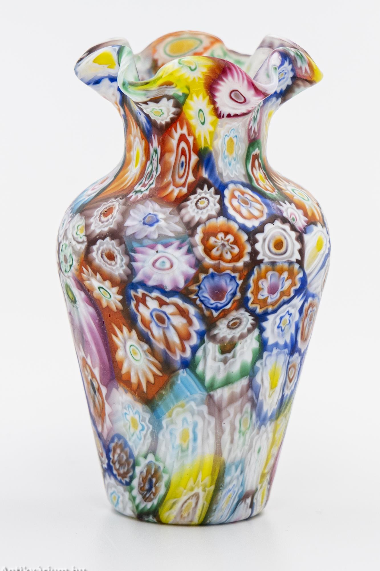 Hibátlan állapotú gyönyörű muranoi kézzel fújt és formázott Fratelli Toso Millefiori virágmozaikos olasz művészi üveg váza a 20. század elejéről. Szabálytalan elrendezésű, váltakozó mintájú méretű és színű virágmotívumokkal díszített. Élénk színű virágaiban megtalálhatjuk a kék - zöld - piros - pink és a sárga színek különböző árnyalatait. A talpán a fújás helye (köldök) látható. A "Millefiori" technikát sűrű, színes virágdíszítési minta jellemzi.(millefiori, magyarul: „ezer virág”) Úgy állítják elő, hogy először egy köteg vékony, különböző színű üvegrudat hevítenek addig, amíg a rudak összeolvadnak. A köteget vékonyra húzzák, lehűtik és keresztmetszetben felszeletelik, így kis, virágszerű mintázatú korongok keletkeznek. Ezeket a korongokat melegen fújt üvegtárgyakra helyezik, majd felmelegítik és másodszor is fújják. Az eredményül kapott termék egy ragyogó színű üvegáru bonyolult, fakulásálló díszítőmintával.