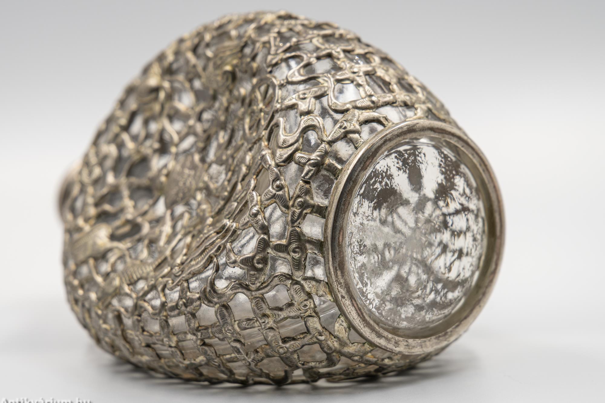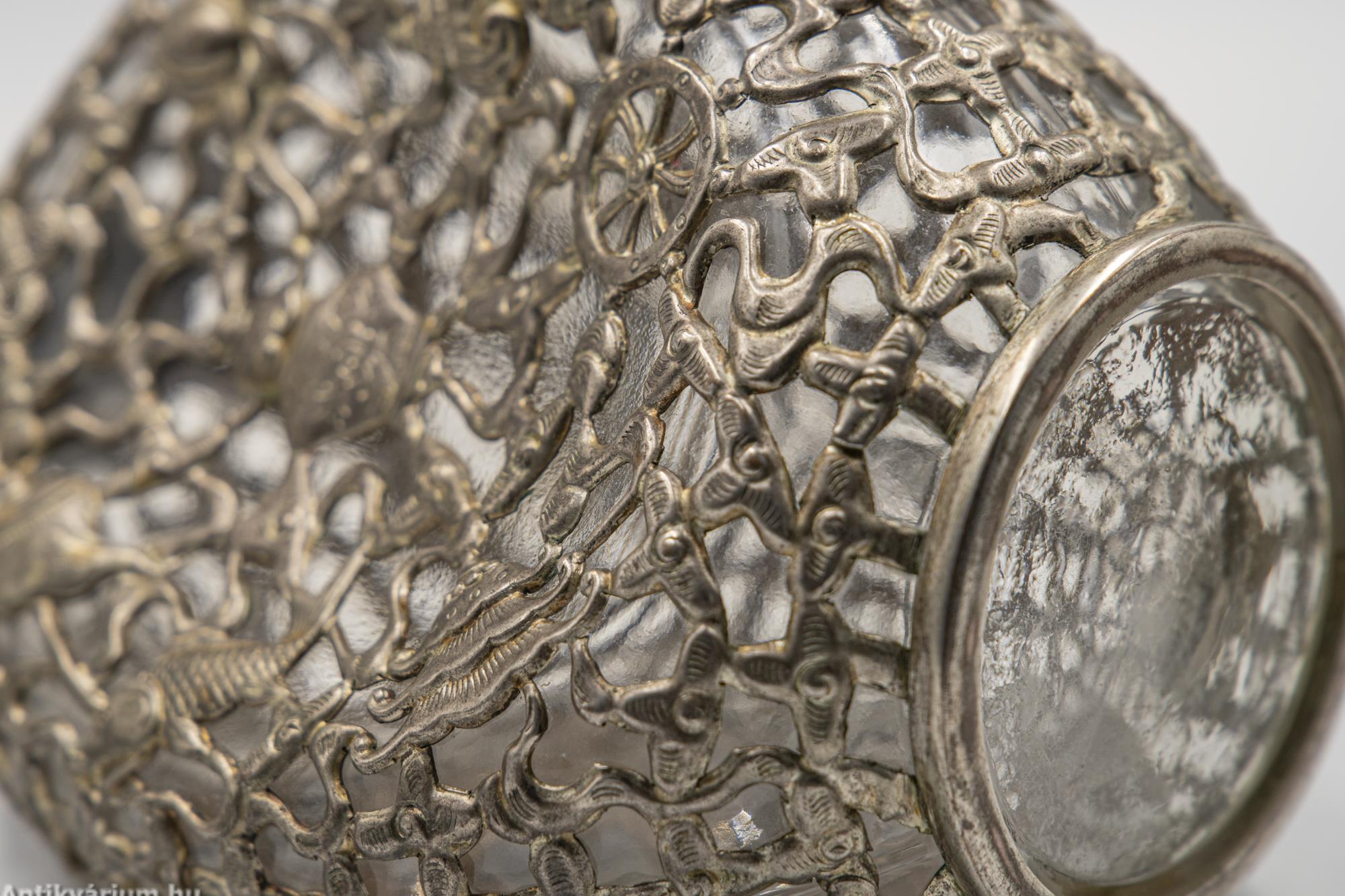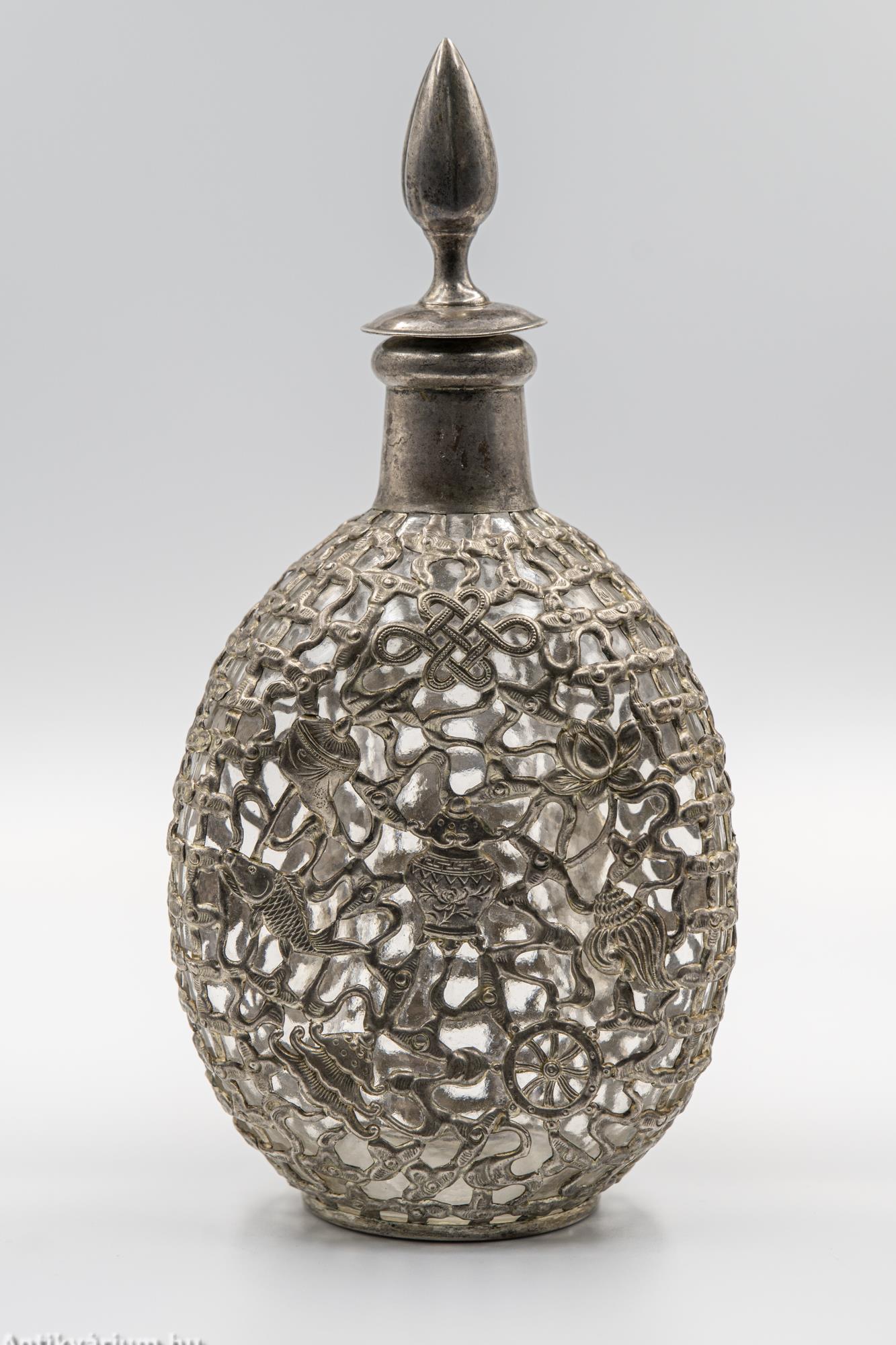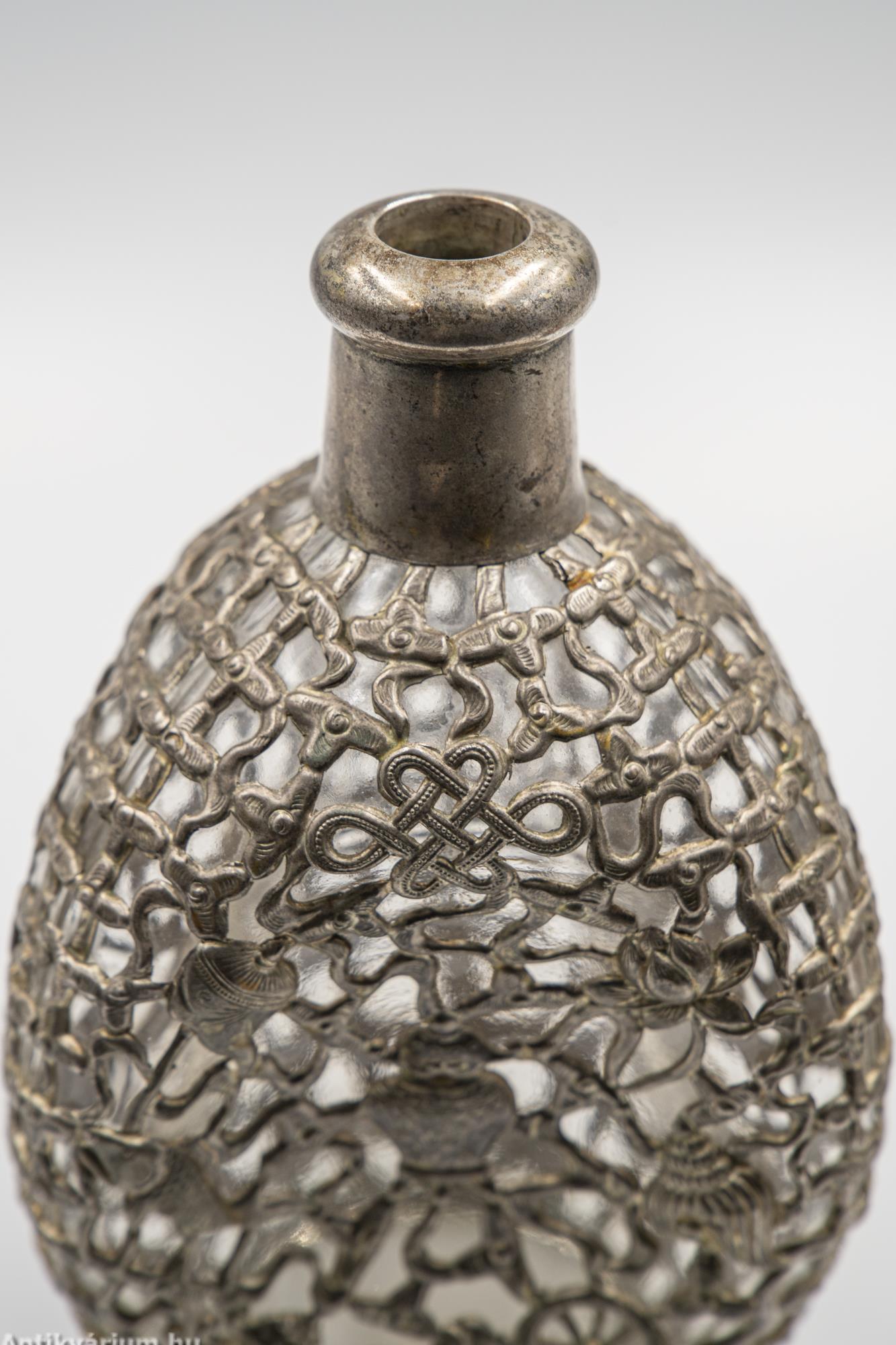 Hibátlan állapotú, ezüstözött fújt üveg palack a 20. század első feléből. Háromszögletű, ovális formájú, színtelen üveg palack, amelyet art deco ornamentikájú fémborítással díszítettek. A borítás mintáján jól látható növény és vízi állatvilágot ábrázoló jelenetekkel: kagyló, hal, csiga, virág. Az art decora jellemző orientalista stílusú díszítés és ábrázolás jellemzi, valamint a korban kedvelt fém kiegészítők használata.