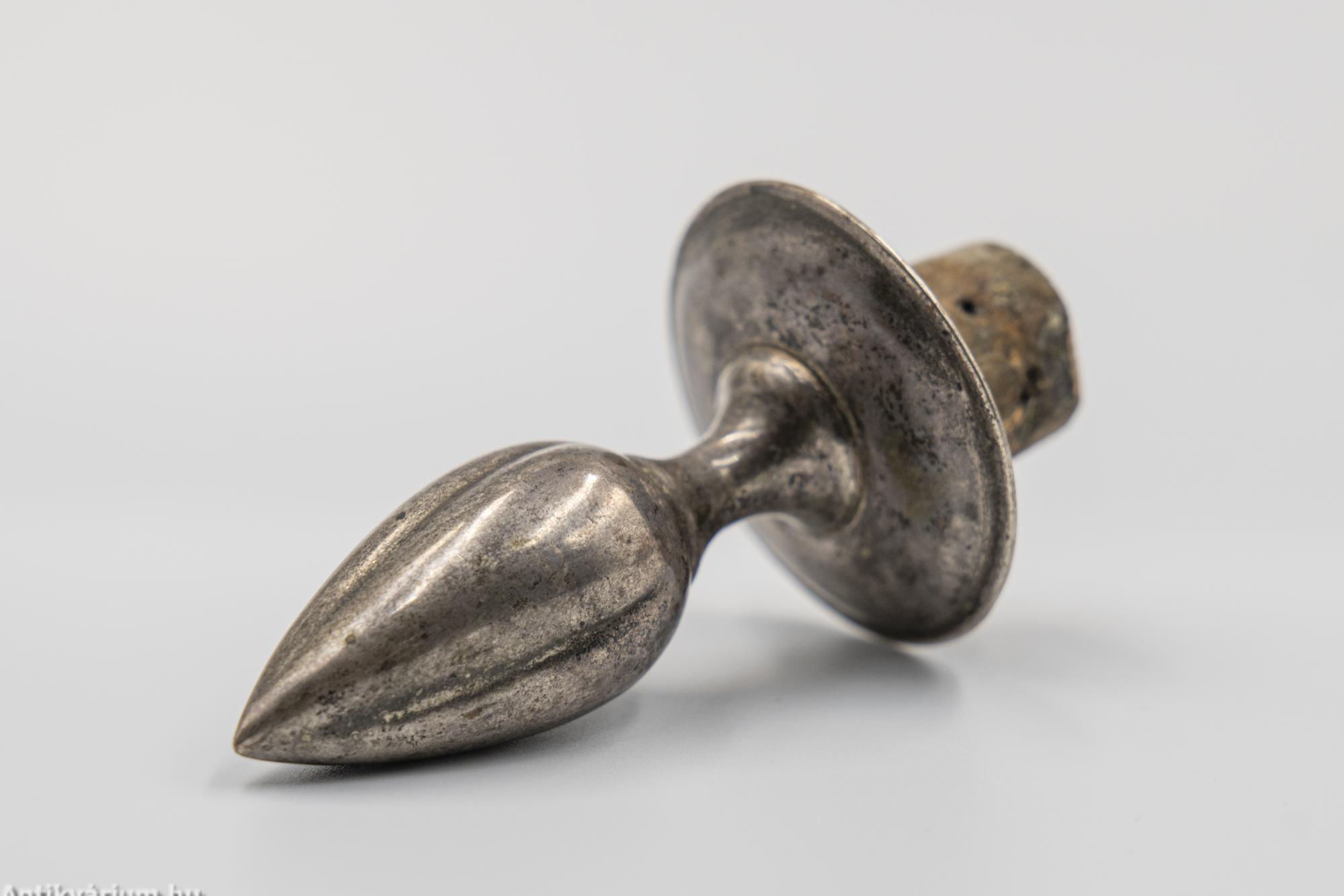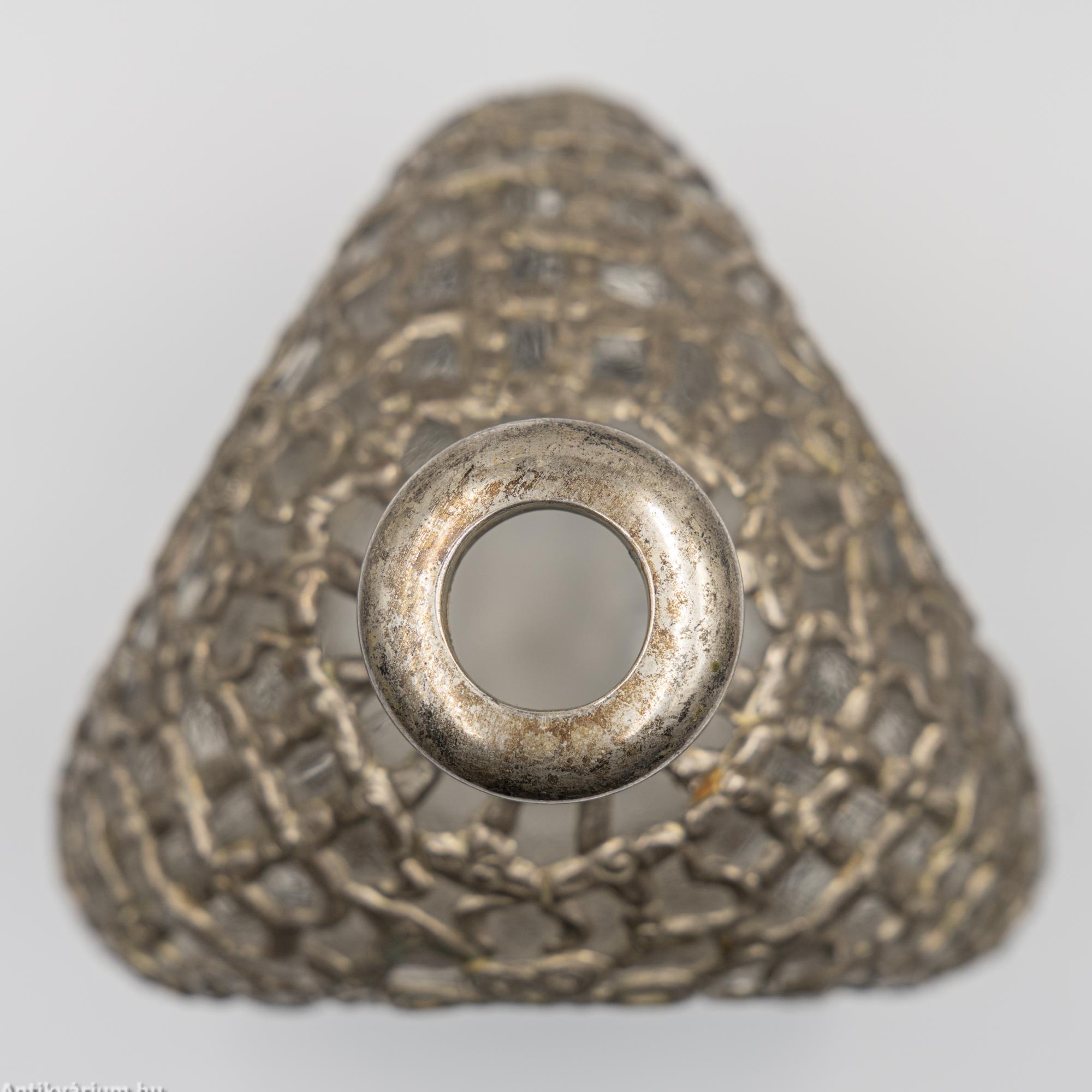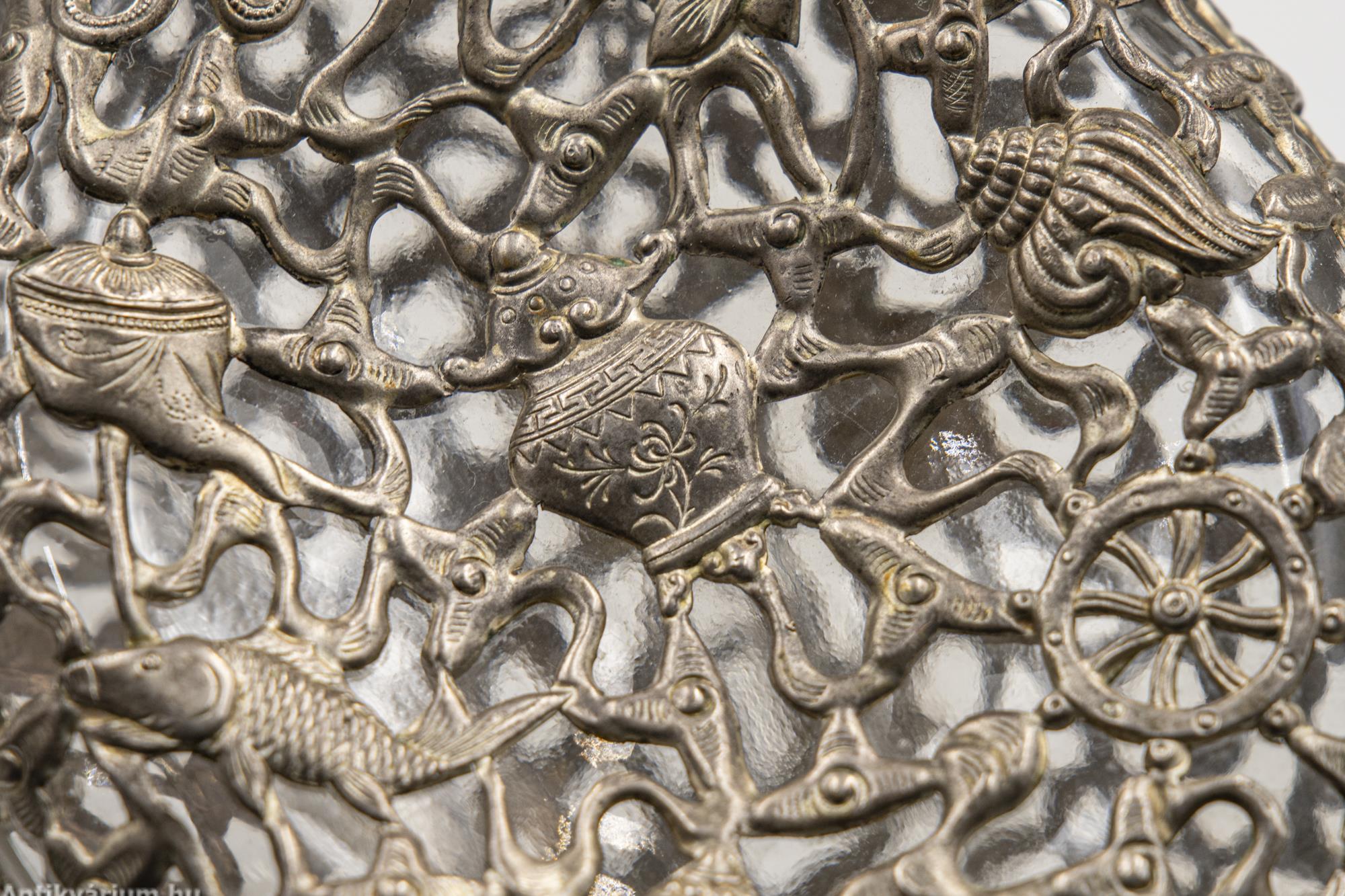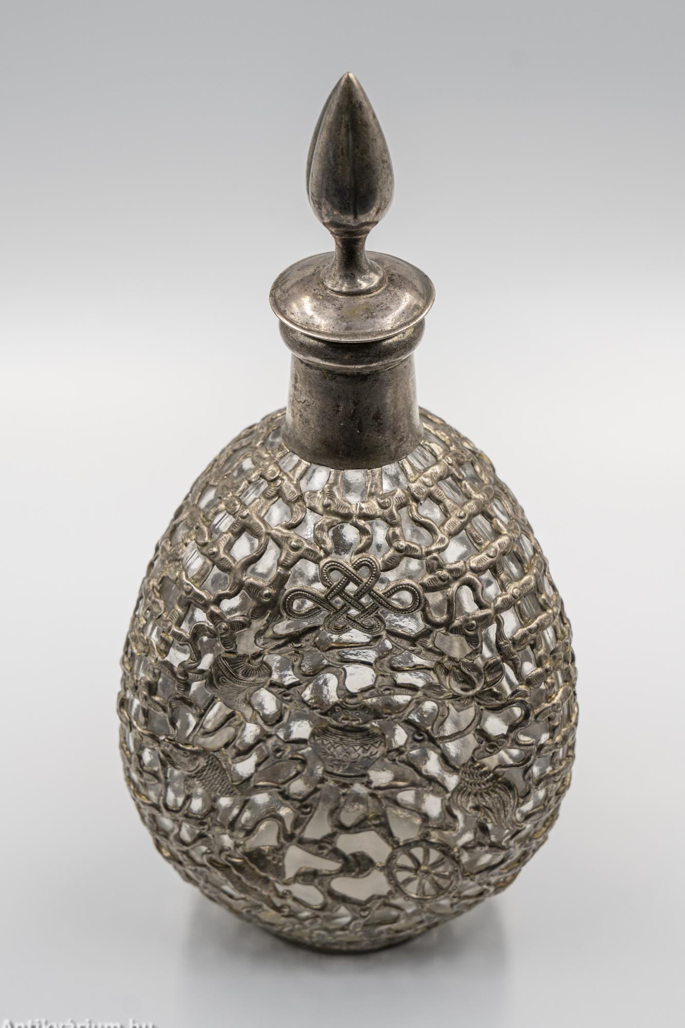 Hibátlan állapotú, ezüstözött fújt üveg palack a 20. század első feléből. Háromszögletű, ovális formájú, színtelen üveg palack, amelyet art deco ornamentikájú fémborítással díszítettek. A borítás mintáján jól látható növény és vízi állatvilágot ábrázoló jelenetekkel: kagyló, hal, csiga, virág. Az art decora jellemző orientalista stílusú díszítés és ábrázolás jellemzi, valamint a korban kedvelt fém kiegészítők használata.
