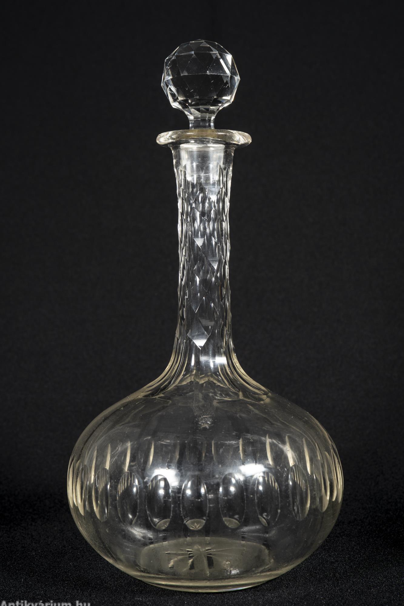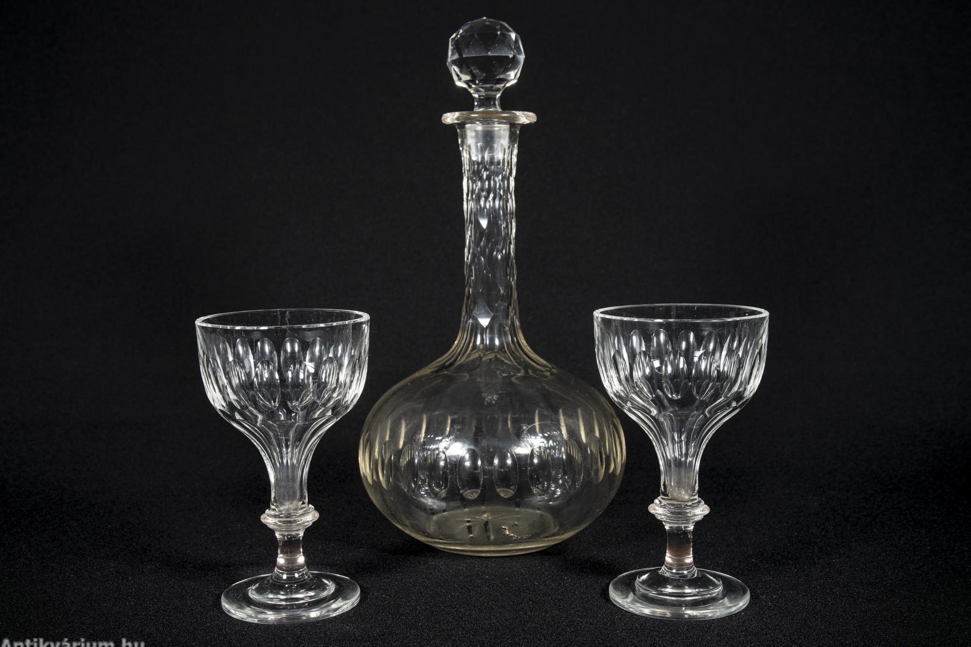 Hibátlan állapotú, fújt és kézzel formázott valamint csiszolt 7 darabból álló italos pohárkészlet dugóval ellátott palackkal a 19. század második feléből. A palack és a poharak talpán a fújás helye kicsiszolt. A poharakat körkörösen díszítő csepp formájú kézzel készült csiszolási minta a palack felületén is megjelenik, amelynek felső része négyszögletes mintával csiszolt.