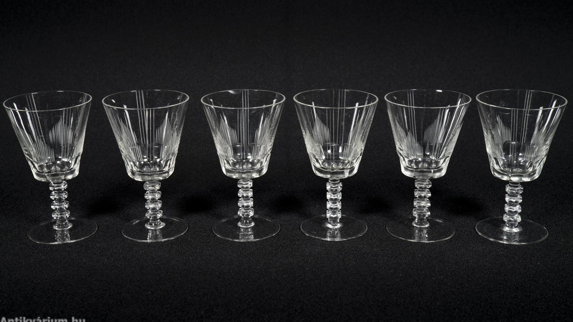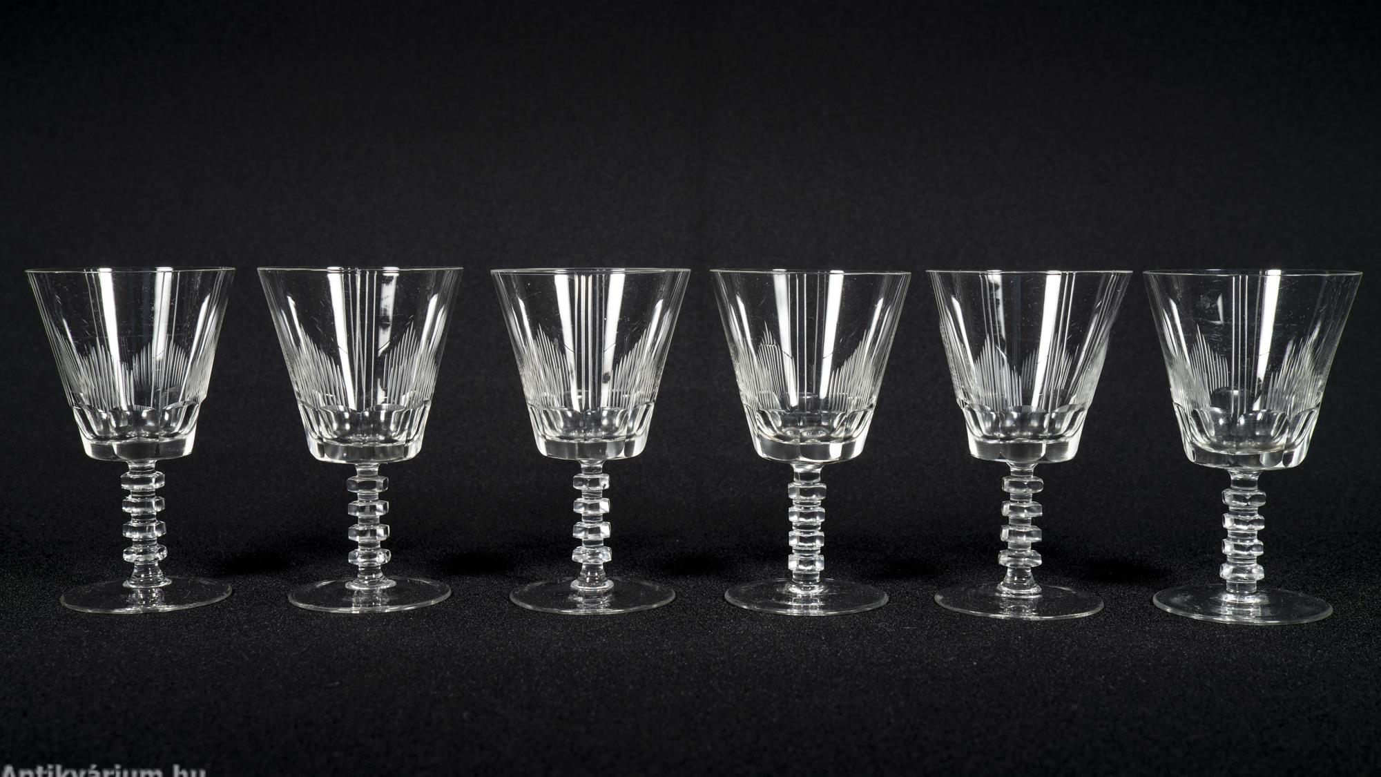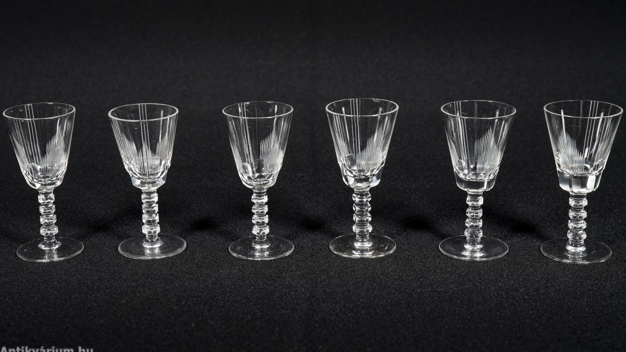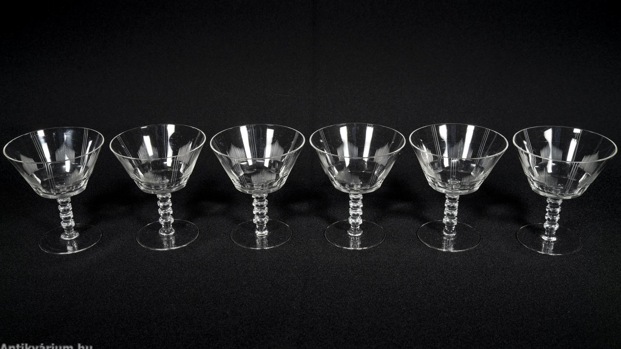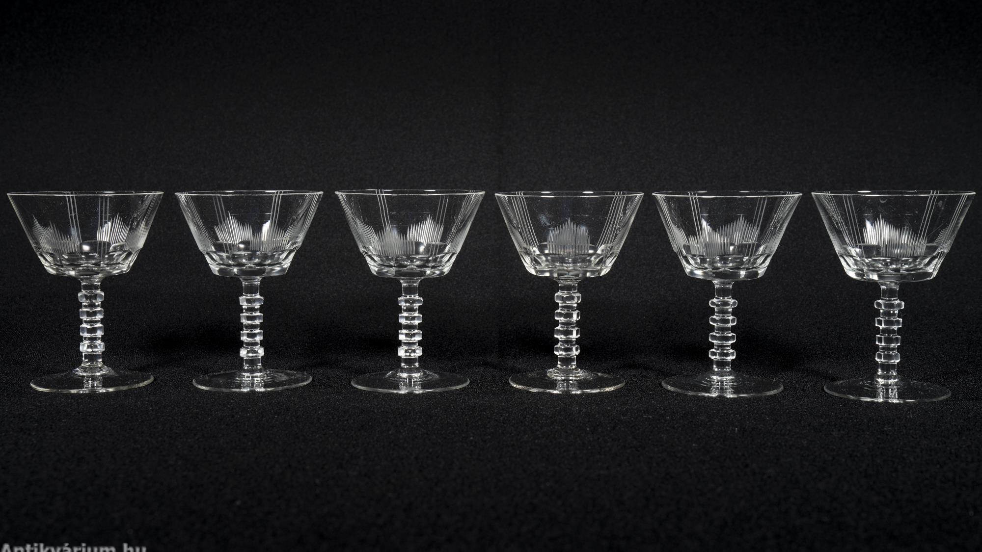 Hibátlan állapotú fújt és kézzel formázott art deco 30 darabos csiszolt üveg pohár készlet a 20. század elejéről. A szett 5 x 6 darab talpas pohárból áll az art decóra jellemző sűrűn csiszolt geometrikus alakzatú mintával.