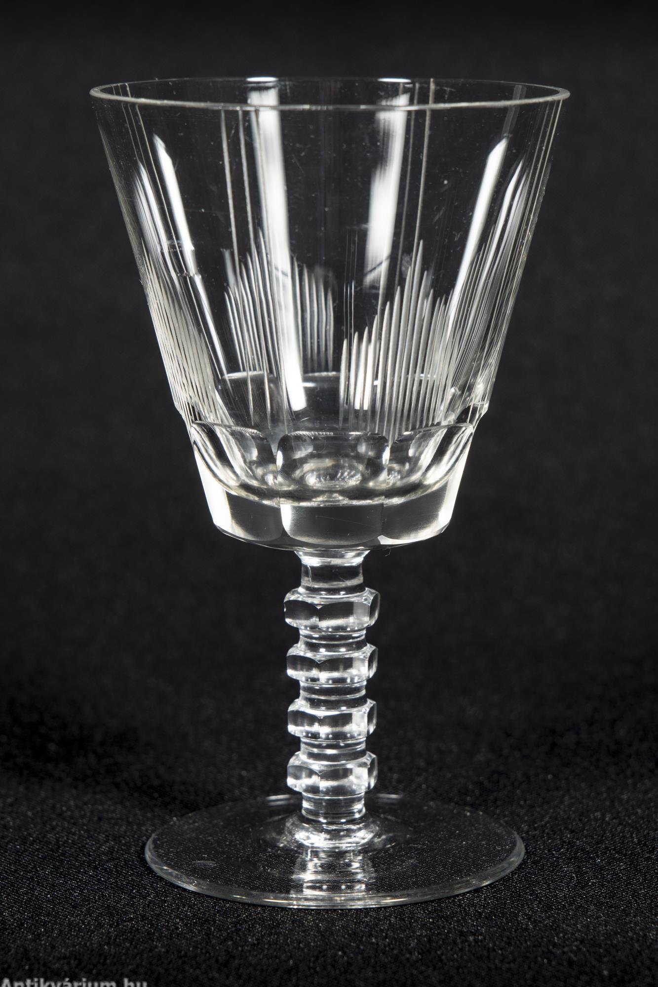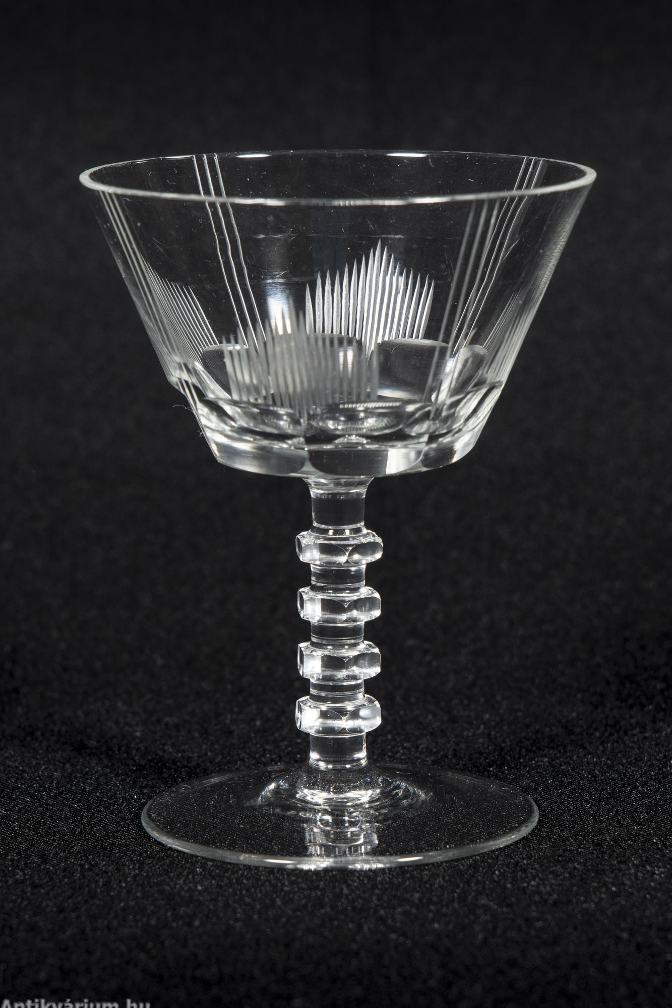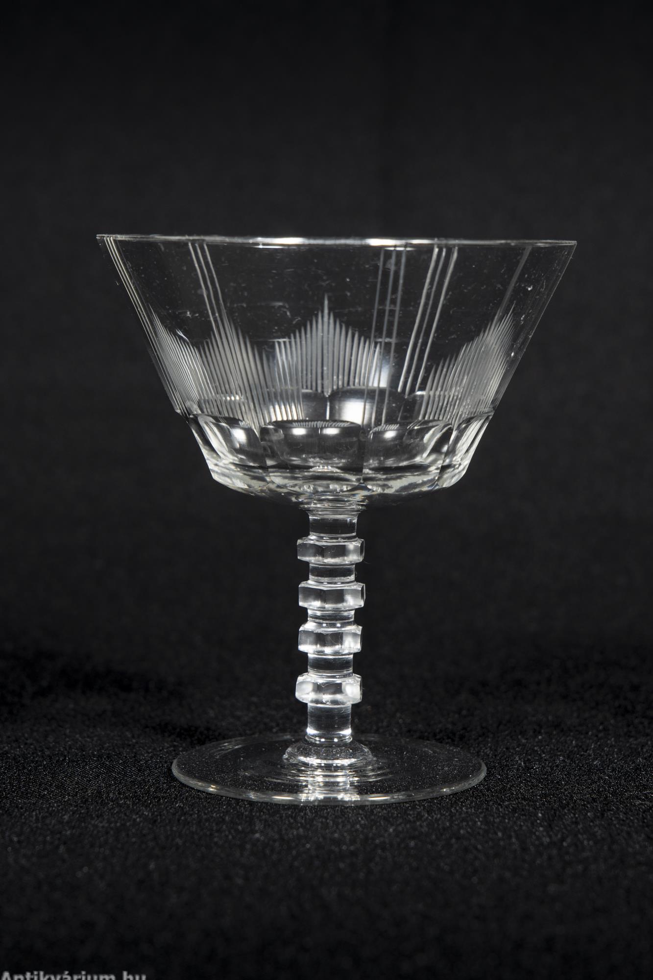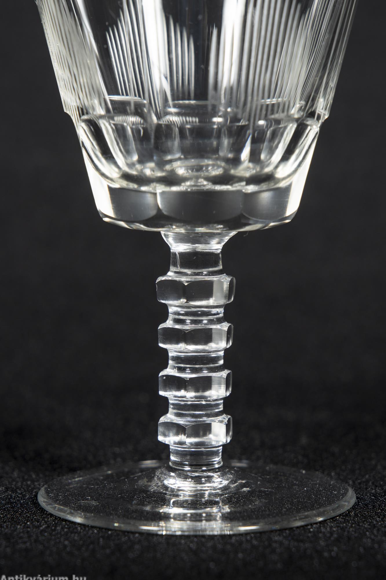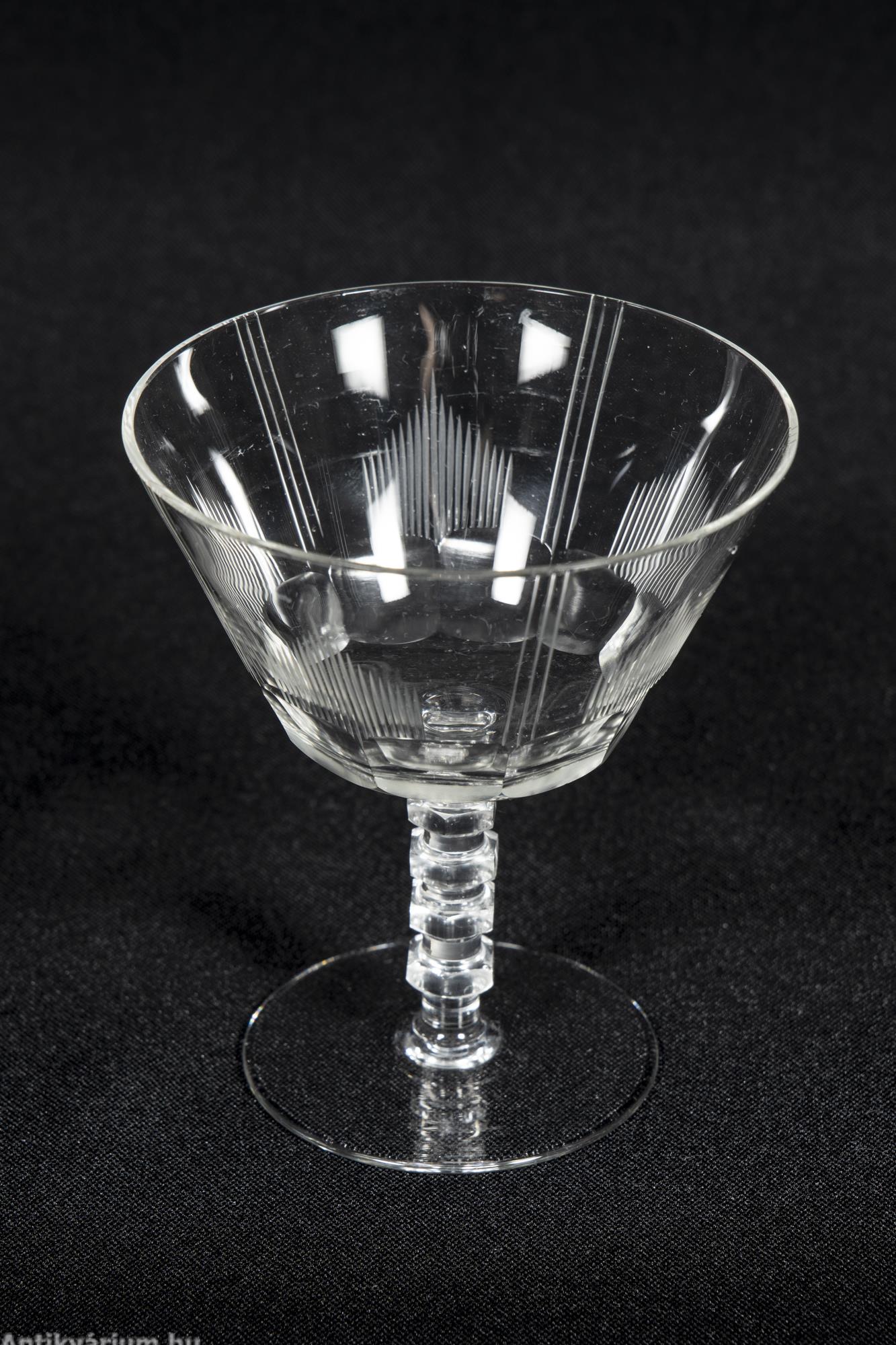 Hibátlan állapotú fújt és kézzel formázott art deco 30 darabos csiszolt üveg pohár készlet a 20. század elejéről. A szett 5 x 6 darab talpas pohárból áll az art decóra jellemző sűrűn csiszolt geometrikus alakzatú mintával.
