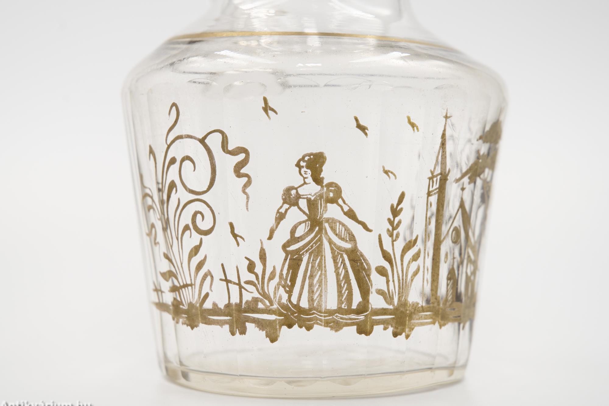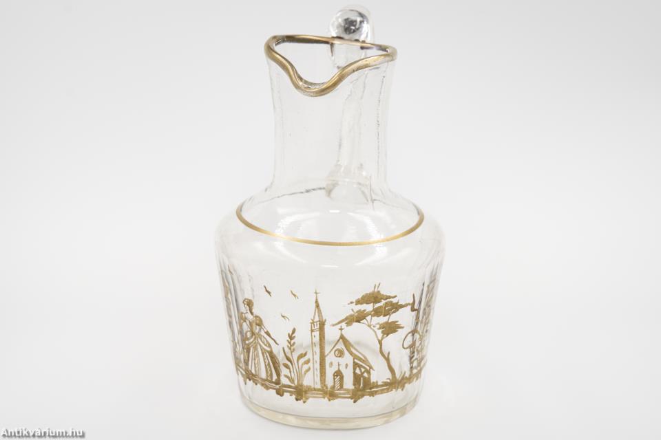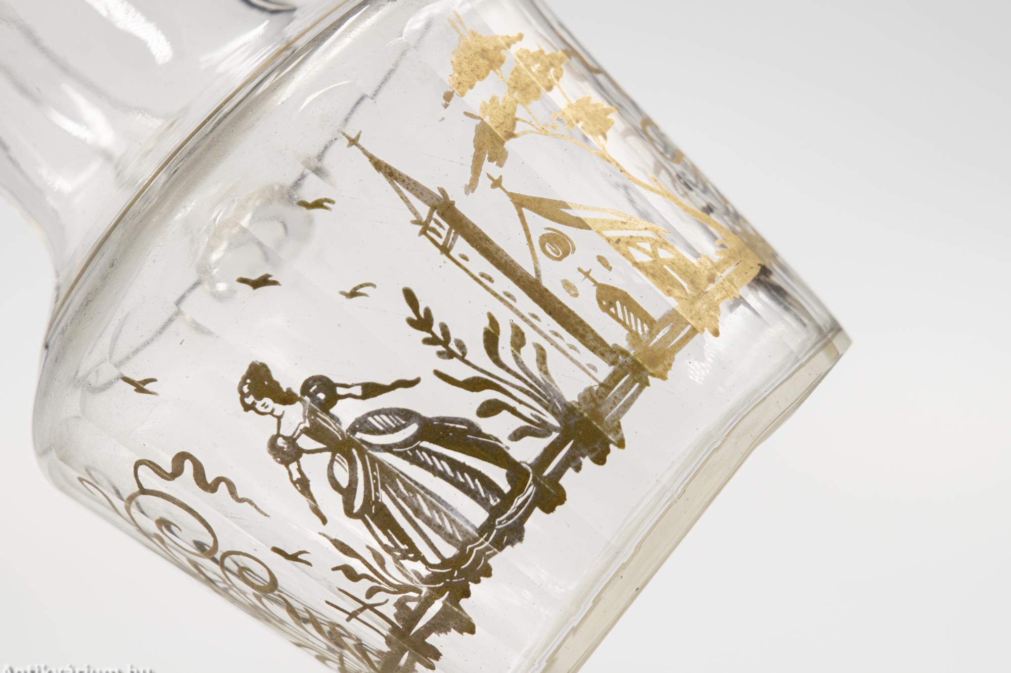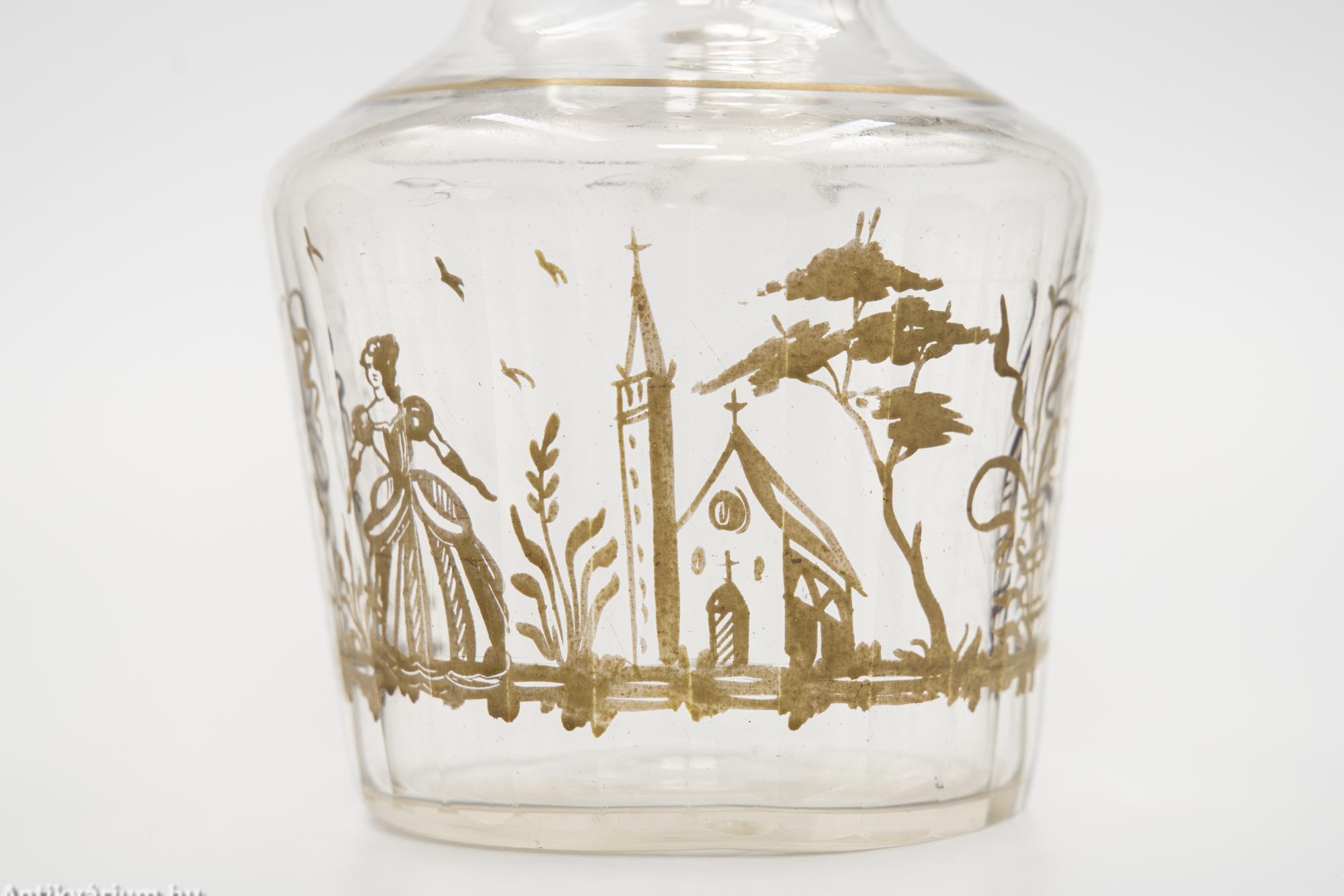 Fújt és kézzel formázott, 18. század második felében készített nagyobb méretű üveg kiöntő arany festésű barokkos ornamentikával. A kiöntő üveg kiszélesedő oldalsó felülete lapra csiszolt, így a minta kiemelten érvényesül. Az aranyfestés barokkos jellegű, romantikus tájjelenet, előterében elegáns öltözetű hölggyel, hátterében harangtornyos templom ábrázolással. Az üveg anyagában korából adódóan légbuborékok és apró szennyeződések vannak. Alul a fújás helye (köldök) látható. Származási helye Közép-Európa.