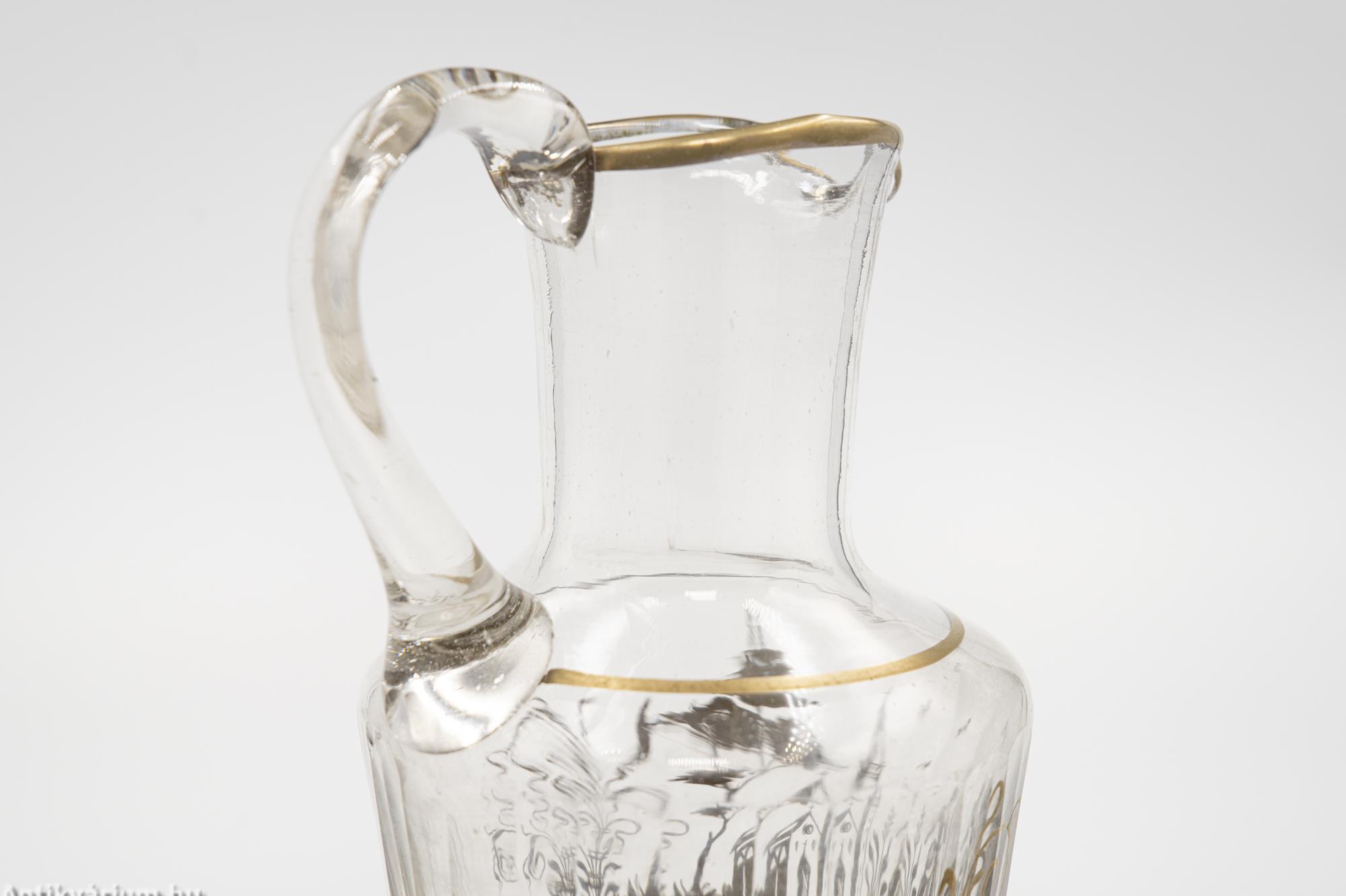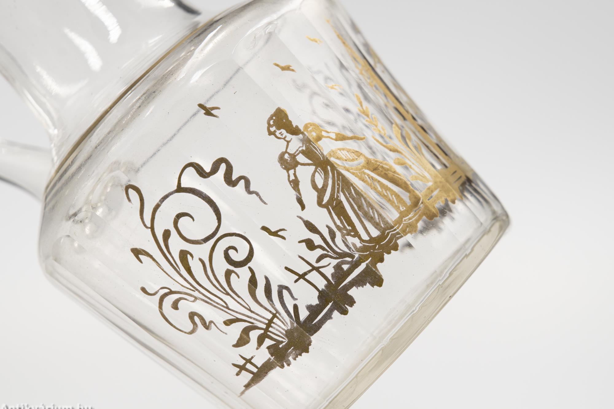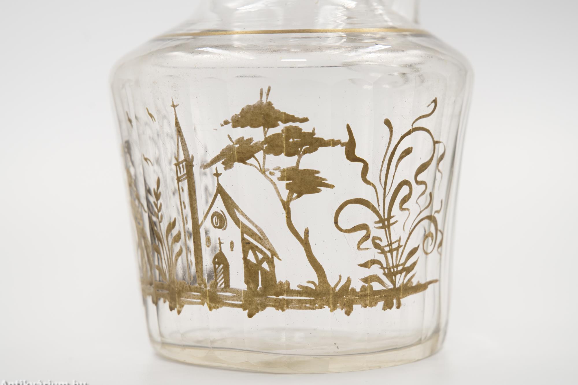 Fújt és kézzel formázott, 18. század második felében készített nagyobb méretű üveg kiöntő arany festésű barokkos ornamentikával. A kiöntő üveg kiszélesedő oldalsó felülete lapra csiszolt, így a minta kiemelten érvényesül. Az aranyfestés barokkos jellegű, romantikus tájjelenet, előterében elegáns öltözetű hölggyel, hátterében harangtornyos templom ábrázolással. Az üveg anyagában korából adódóan légbuborékok és apró szennyeződések vannak. Alul a fújás helye (köldök) látható. Származási helye Közép-Európa.