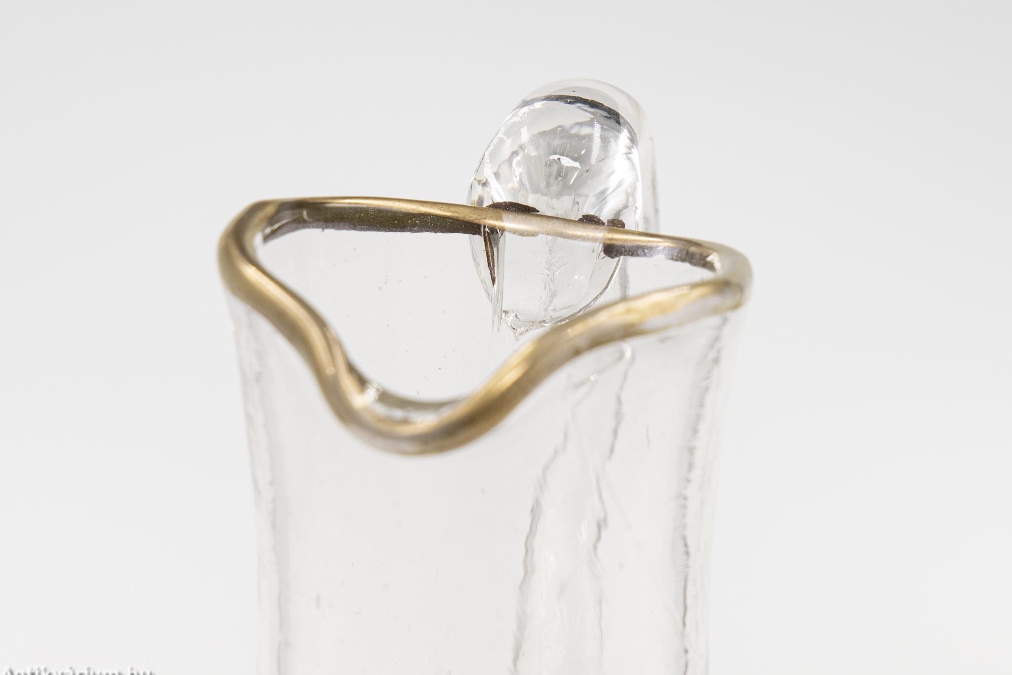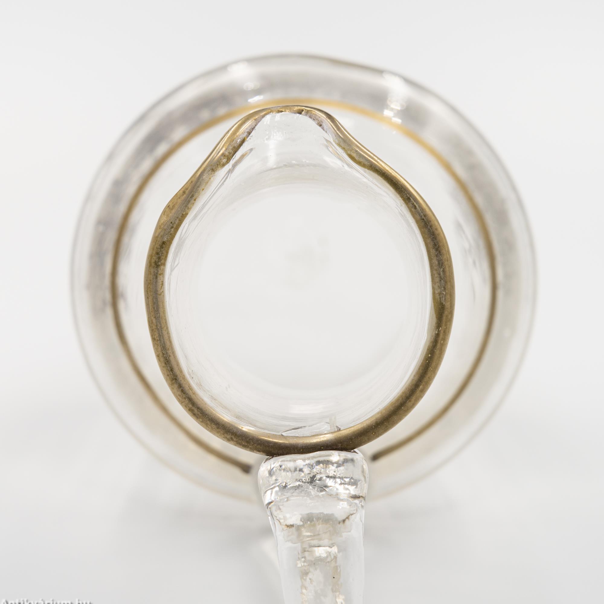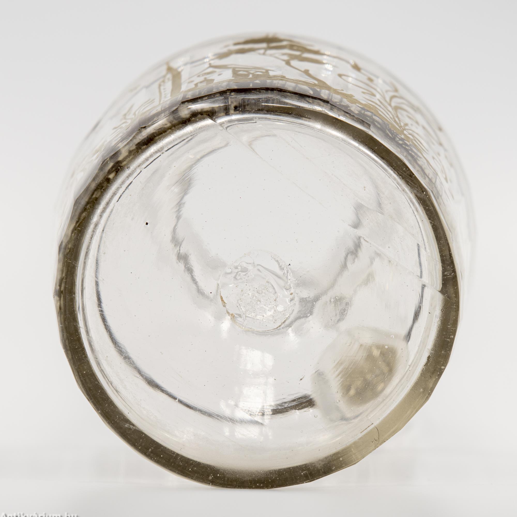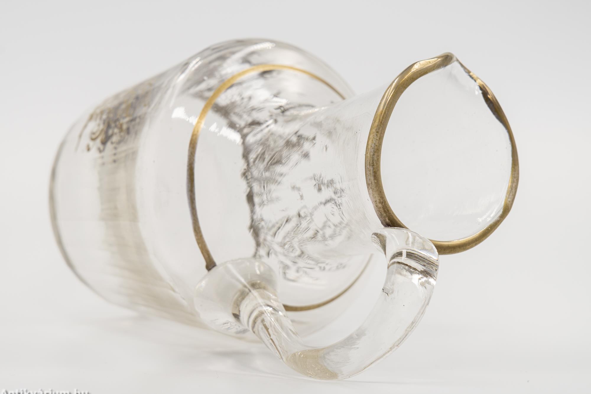Fújt és kézzel formázott, 18. század második felében készített nagyobb méretű üveg kiöntő arany festésű barokkos ornamentikával. A kiöntő üveg kiszélesedő oldalsó felülete lapra csiszolt, így a minta kiemelten érvényesül. Az aranyfestés barokkos jellegű, romantikus tájjelenet, előterében elegáns öltözetű hölggyel, hátterében harangtornyos templom ábrázolással. Az üveg anyagában korából adódóan légbuborékok és apró szennyeződések vannak. Alul a fújás helye (köldök) látható. Származási helye Közép-Európa.