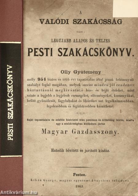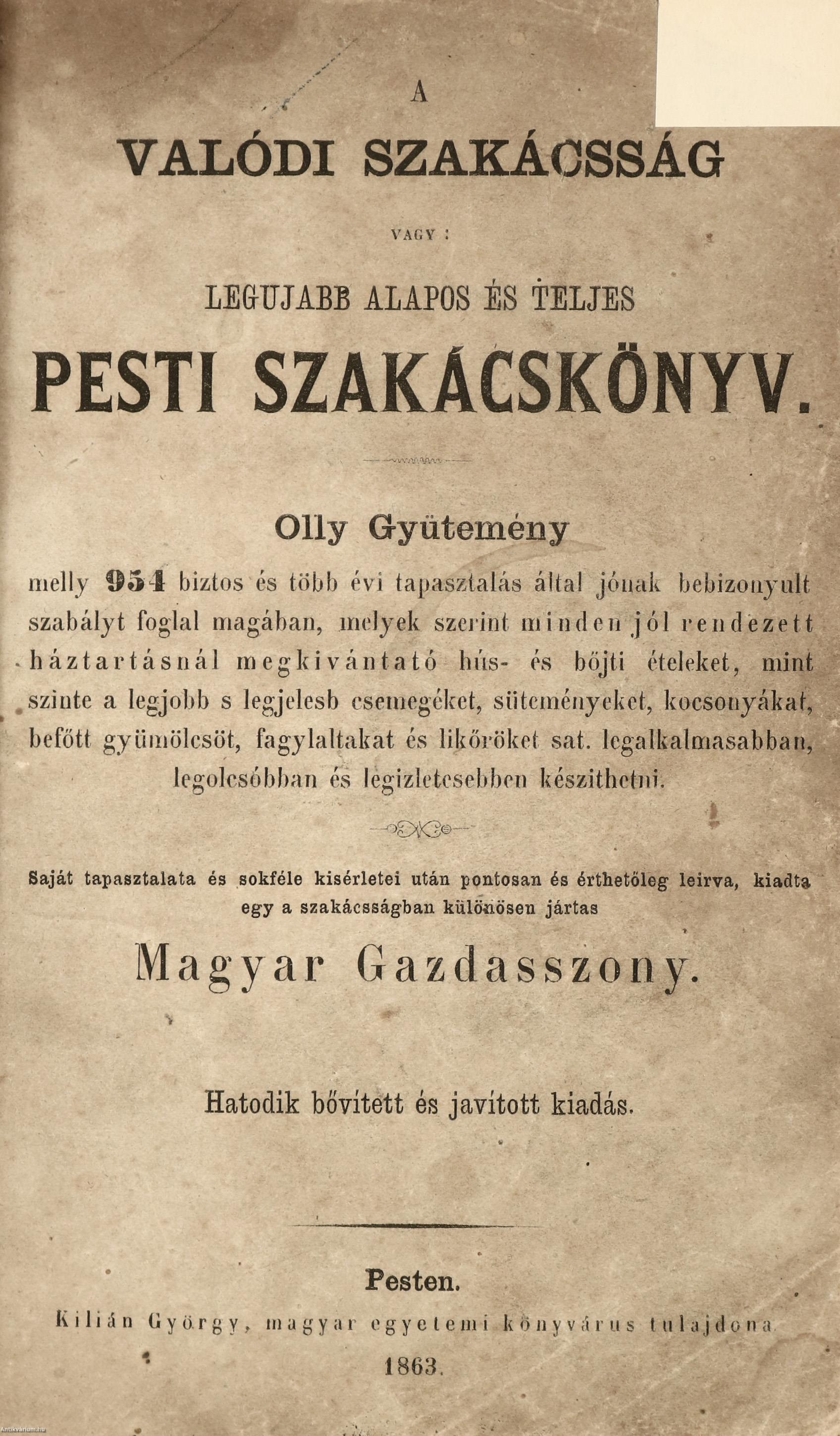 A valódi szakácsság vagy: legujabb alapos és teljes Pesti Szakácskönyv. Saját tapasztalata és sokféle kisérletei után pontosan és érthetőleg leirva, kiadta egy a szakácsságban különösen jártas Magyar Gazdasszony.