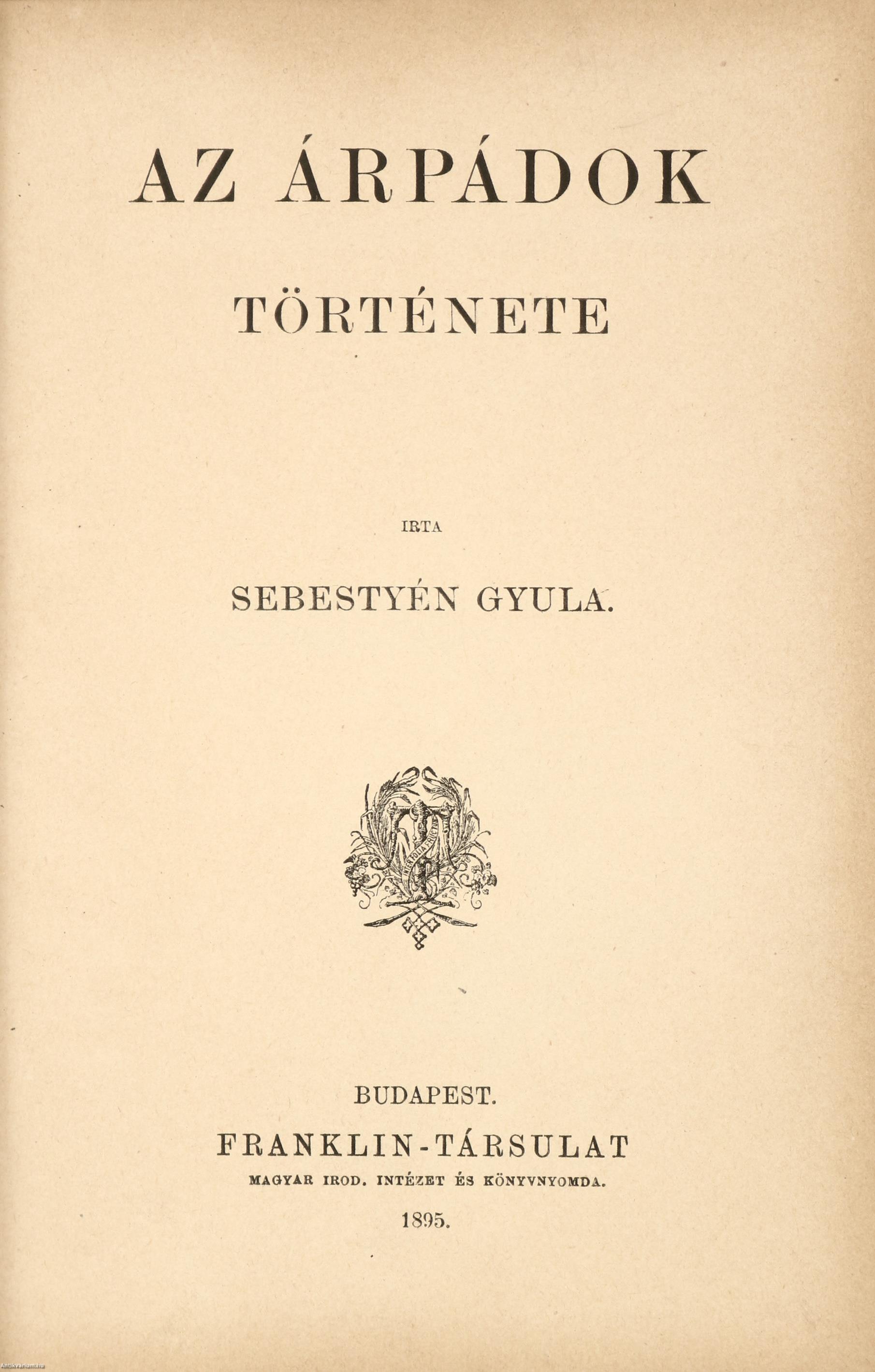 Első kiadás. Az Árpádok története. Írta: Sebestyén Gyula.