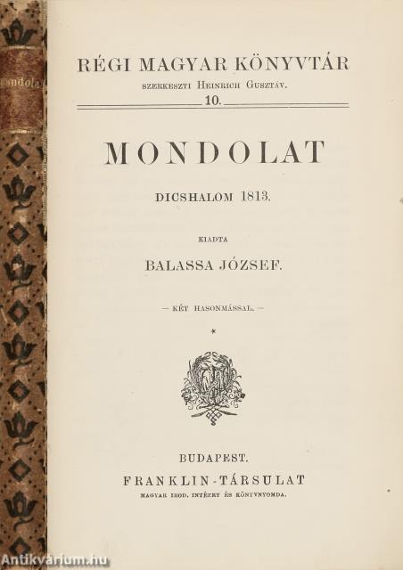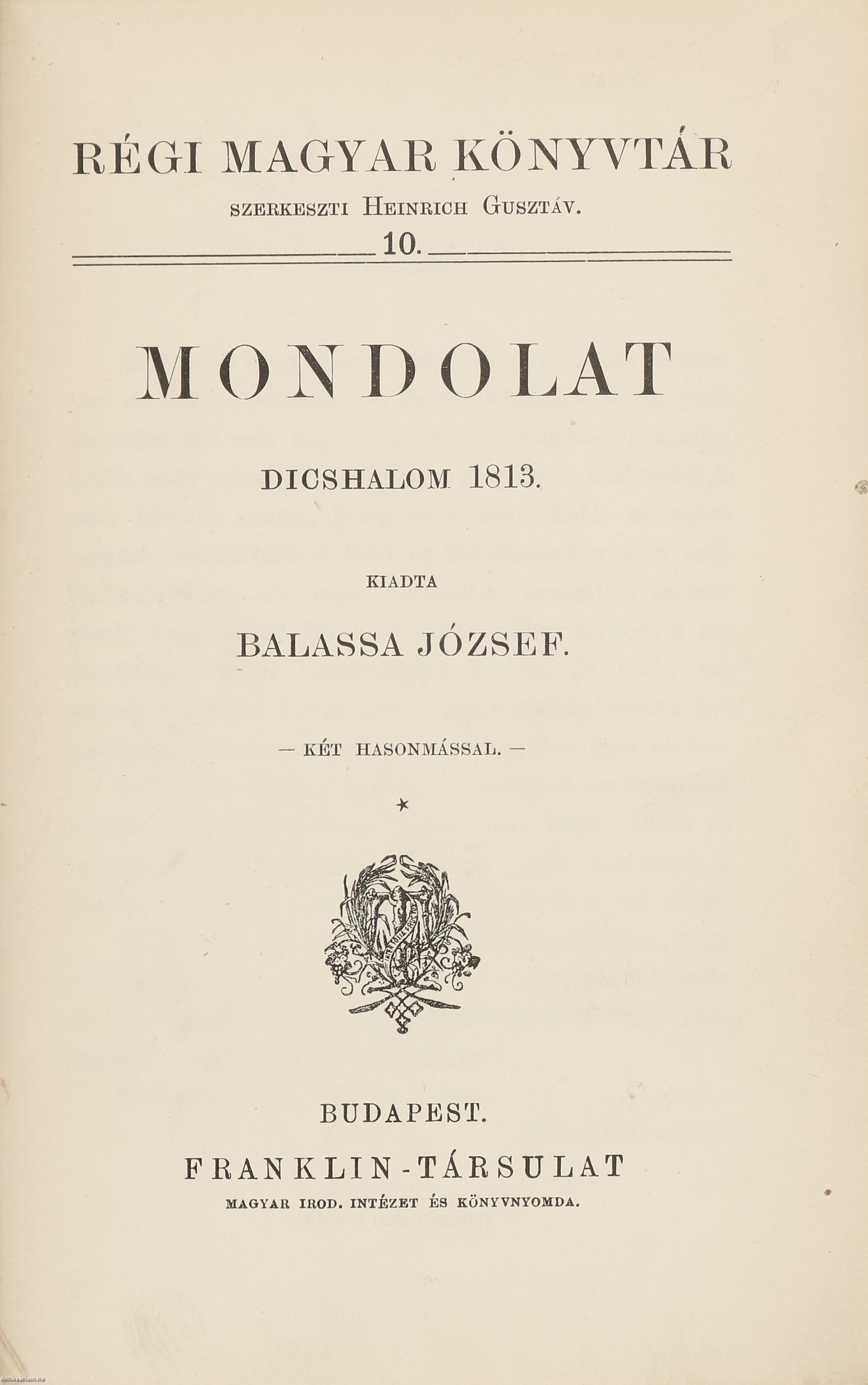 1. Mondolat. Dicshalom 1813. Kiadta: Balassa József. Bp., [1898], Franklin, 109 p. + [3] p., ill. Balassa József bevezető tanulmányával, az eredeti címkép és címlap hasonmásával, kötetvégi tartalomjegyzékkel.
