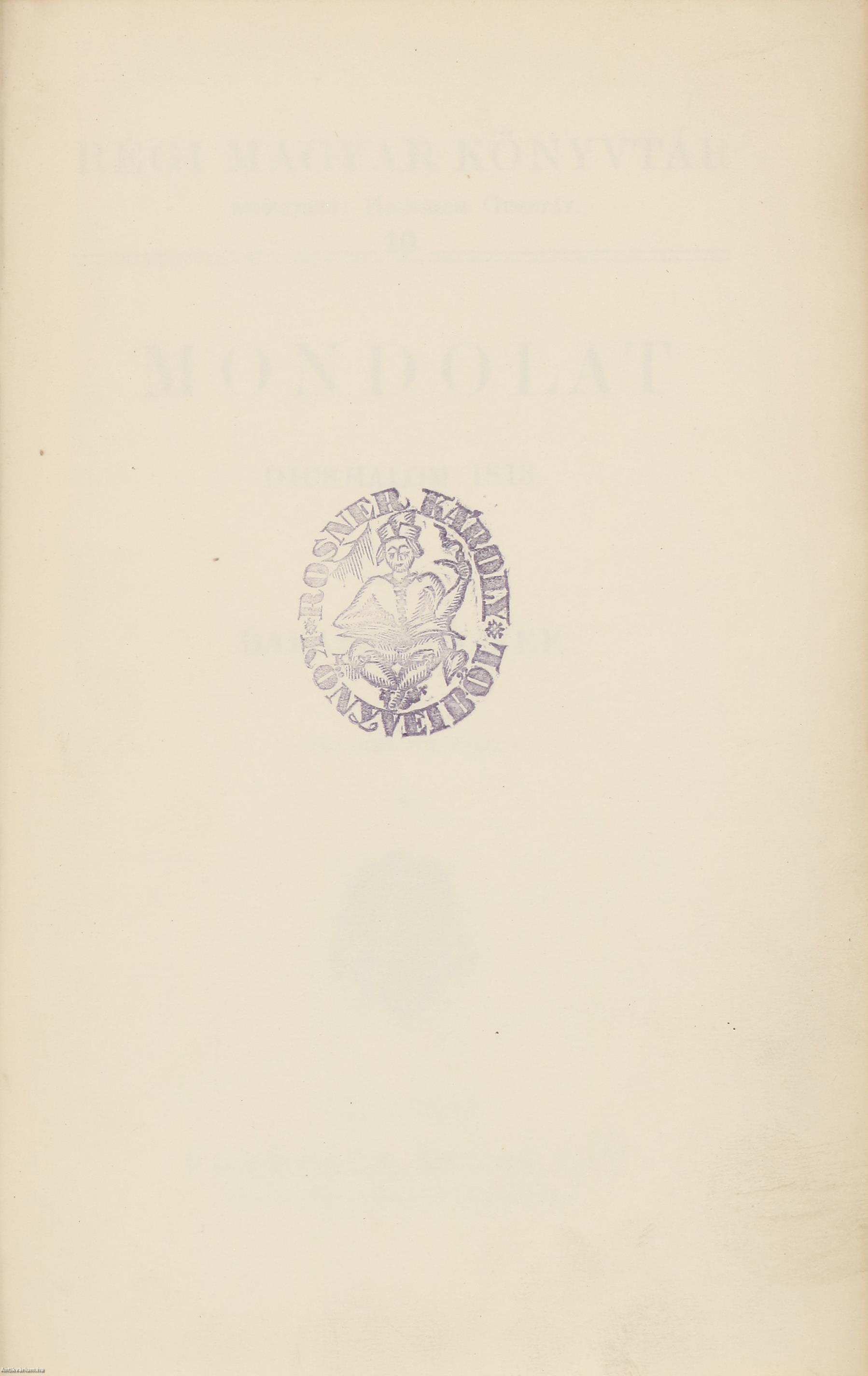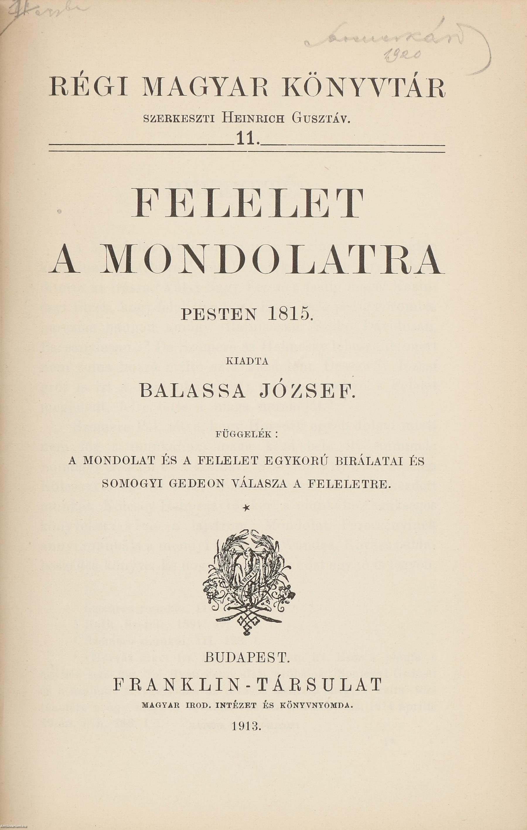 2. Felelet a Mondolatra. Pesten 1815. Kiadta: Balassa József. Bp., 1913, Franklin, 114 p. + [1] p. Balassa József bevezető tanulmányával, tartalomjegyzékkel, függelékül a Mondolat és a Felet egykorú bírálataival, valamint Somogyi Gedeon válaszával a Feleletre. A címlapon ceruzával írt, régi tulajdonosi bejegyzés látható.