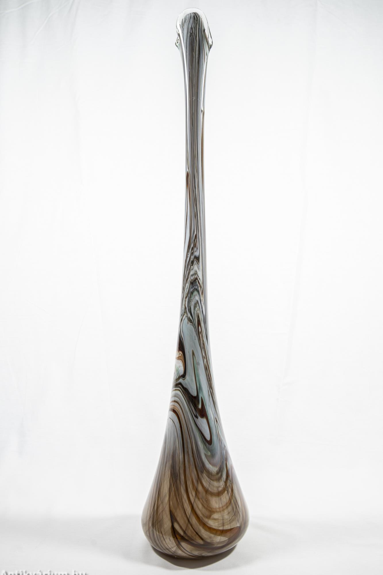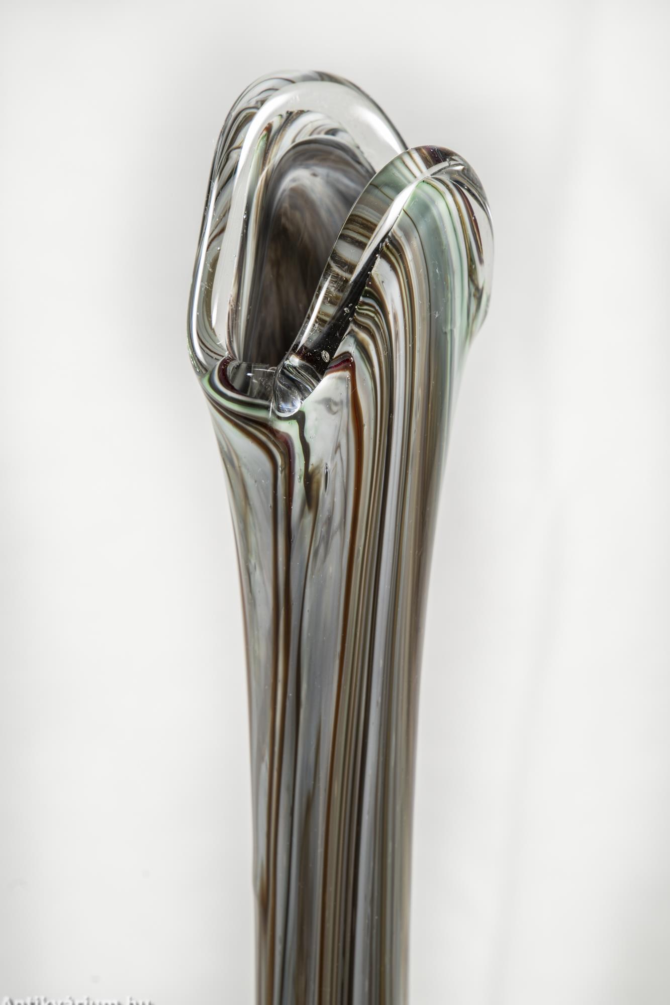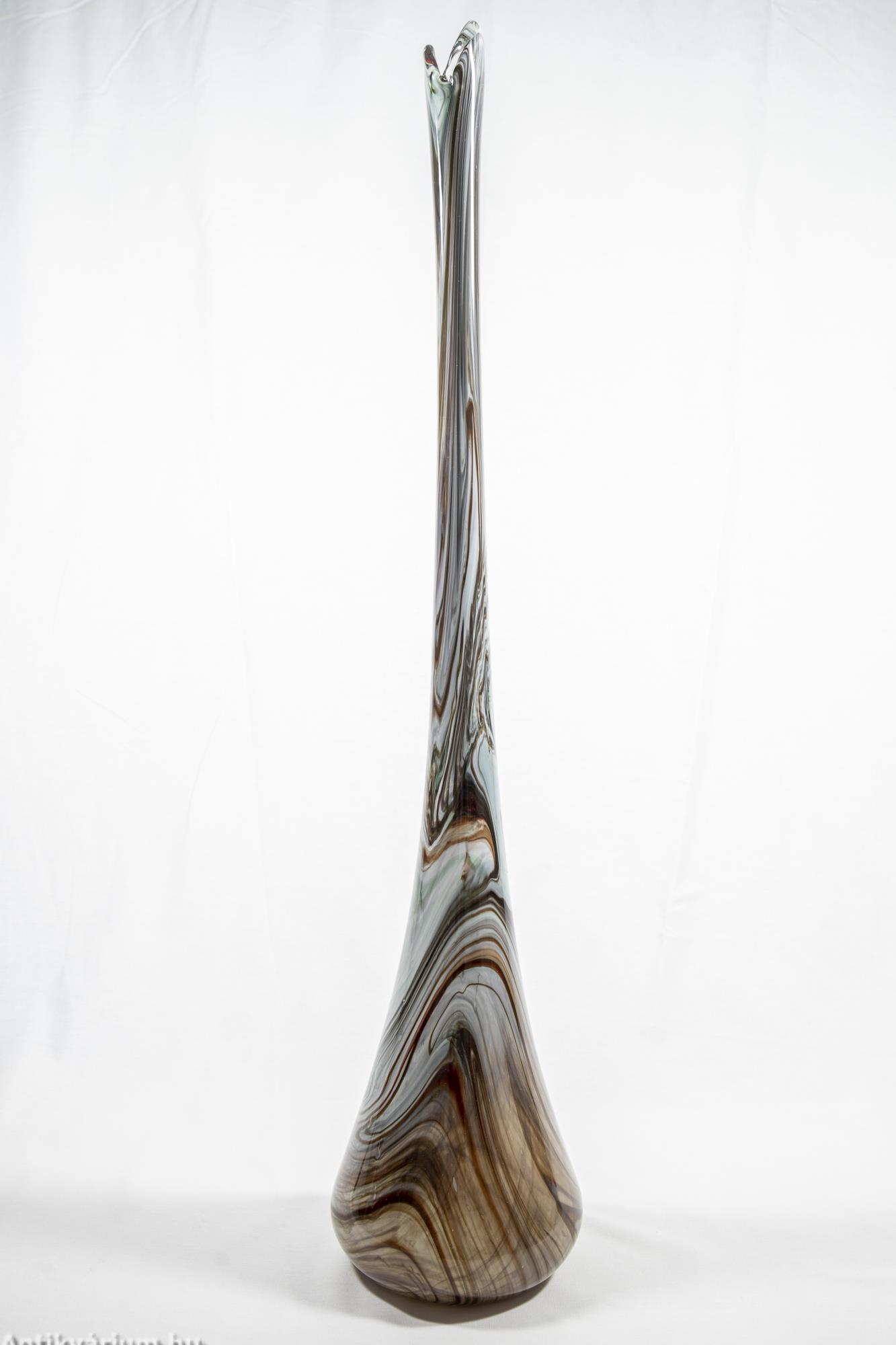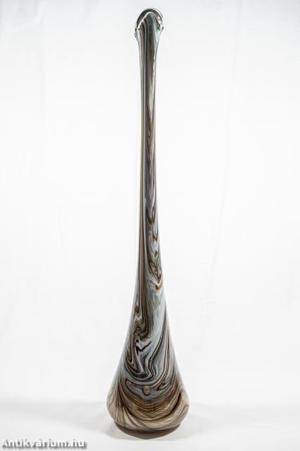 Hibátlan állapotú, fújt és kézzel formázott, hatalmas, modern muranoi üveg váza. Impozáns megjelenését különlegesen nagy méretének és extrém mintájának köszönheti. Nyújtott hosszanti irányú, több vékony üvegrúdból álló szálvezetés díszíti, amelynek színösszeállítása finom árnyalatokban jeleníti meg a kék, a zöld és a barna tónusait. Vastag üvegrétegű váza, megjelenése mégis kecses vonalú. Szoborszerű formavilága plasztikus hatást kelt. Talpa lapra csiszolt. Jellegzetes századközepi forma és színvilág, igazi retro korhangulatot sugárzó művészi enteriőr darab.