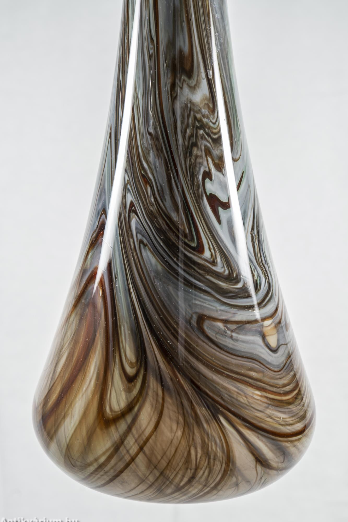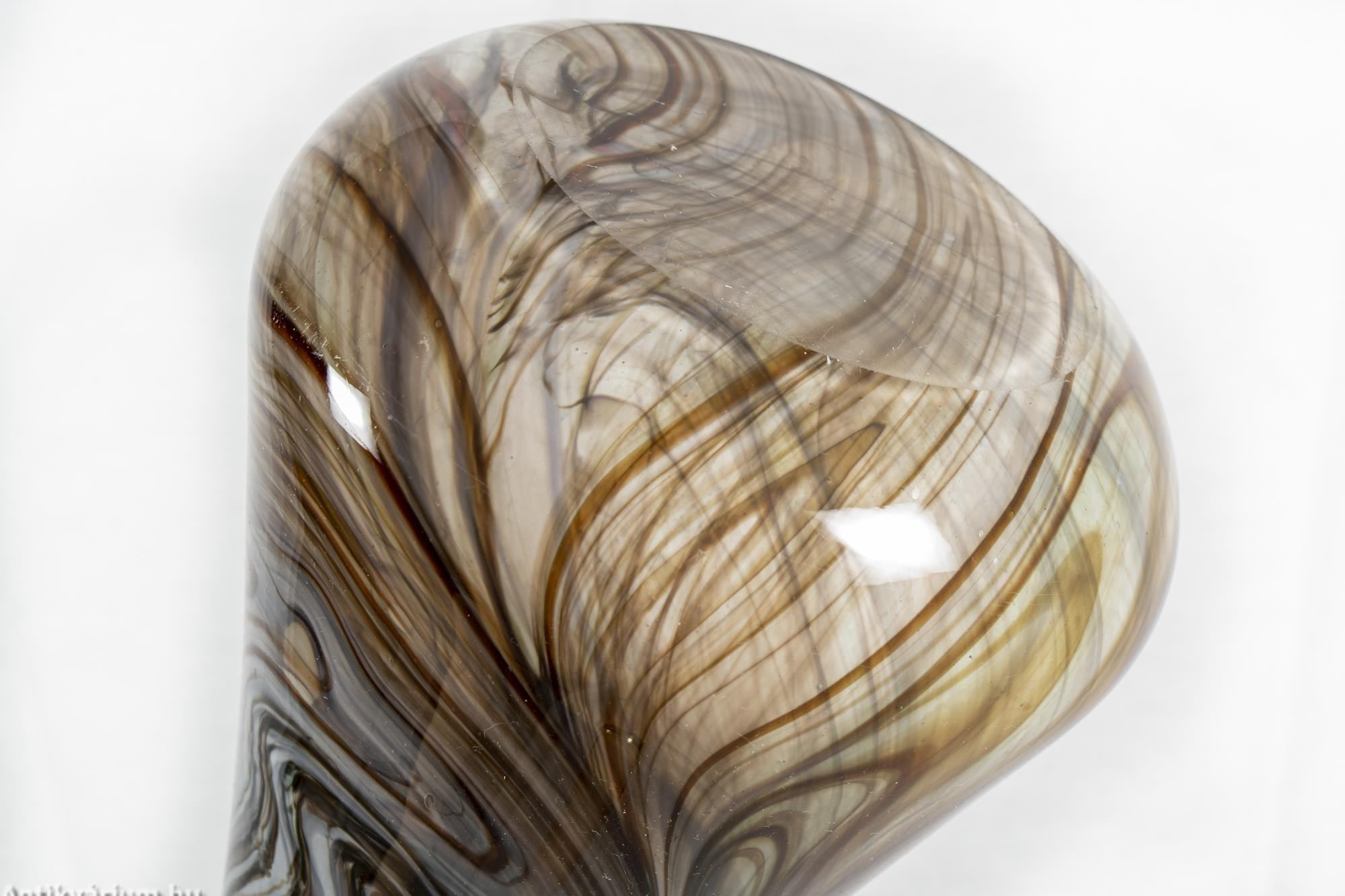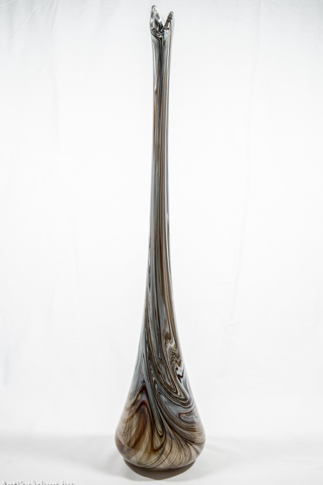Hibátlan állapotú, fújt és kézzel formázott, hatalmas, modern muranoi üveg váza. Impozáns megjelenését különlegesen nagy méretének és extrém mintájának köszönheti. Nyújtott hosszanti irányú, több vékony üvegrúdból álló szálvezetés díszíti, amelynek színösszeállítása finom árnyalatokban jeleníti meg a kék, a zöld és a barna tónusait. Vastag üvegrétegű váza, megjelenése mégis kecses vonalú. Szoborszerű formavilága plasztikus hatást kelt. Talpa lapra csiszolt. Jellegzetes századközepi forma és színvilág, igazi retro korhangulatot sugárzó művészi enteriőr darab.