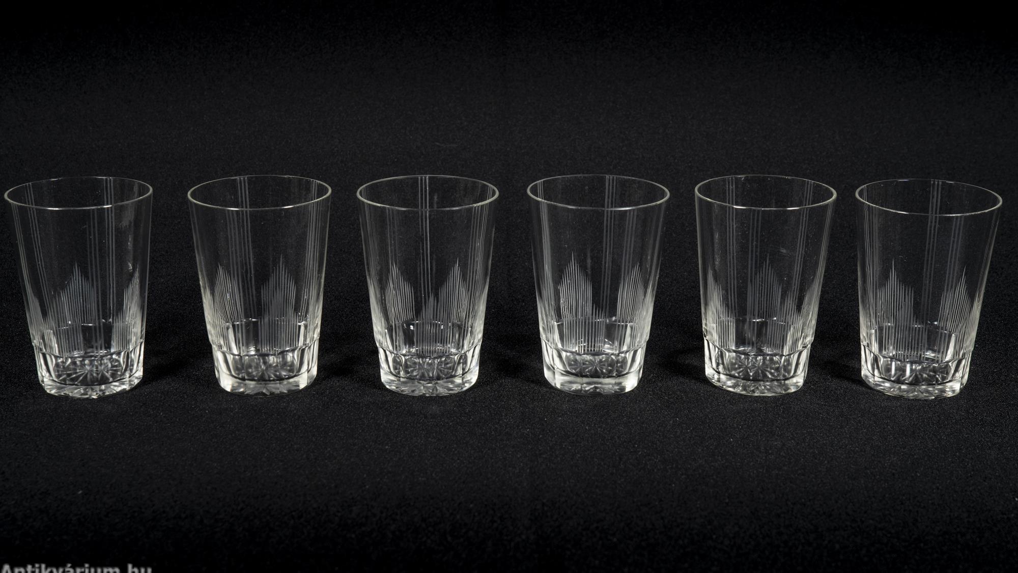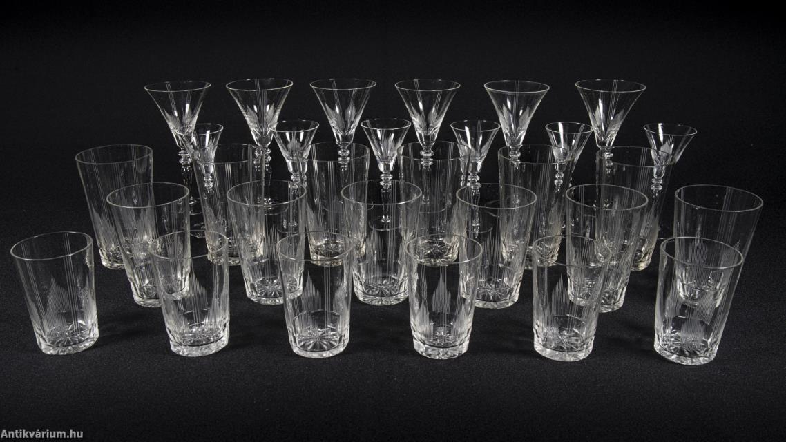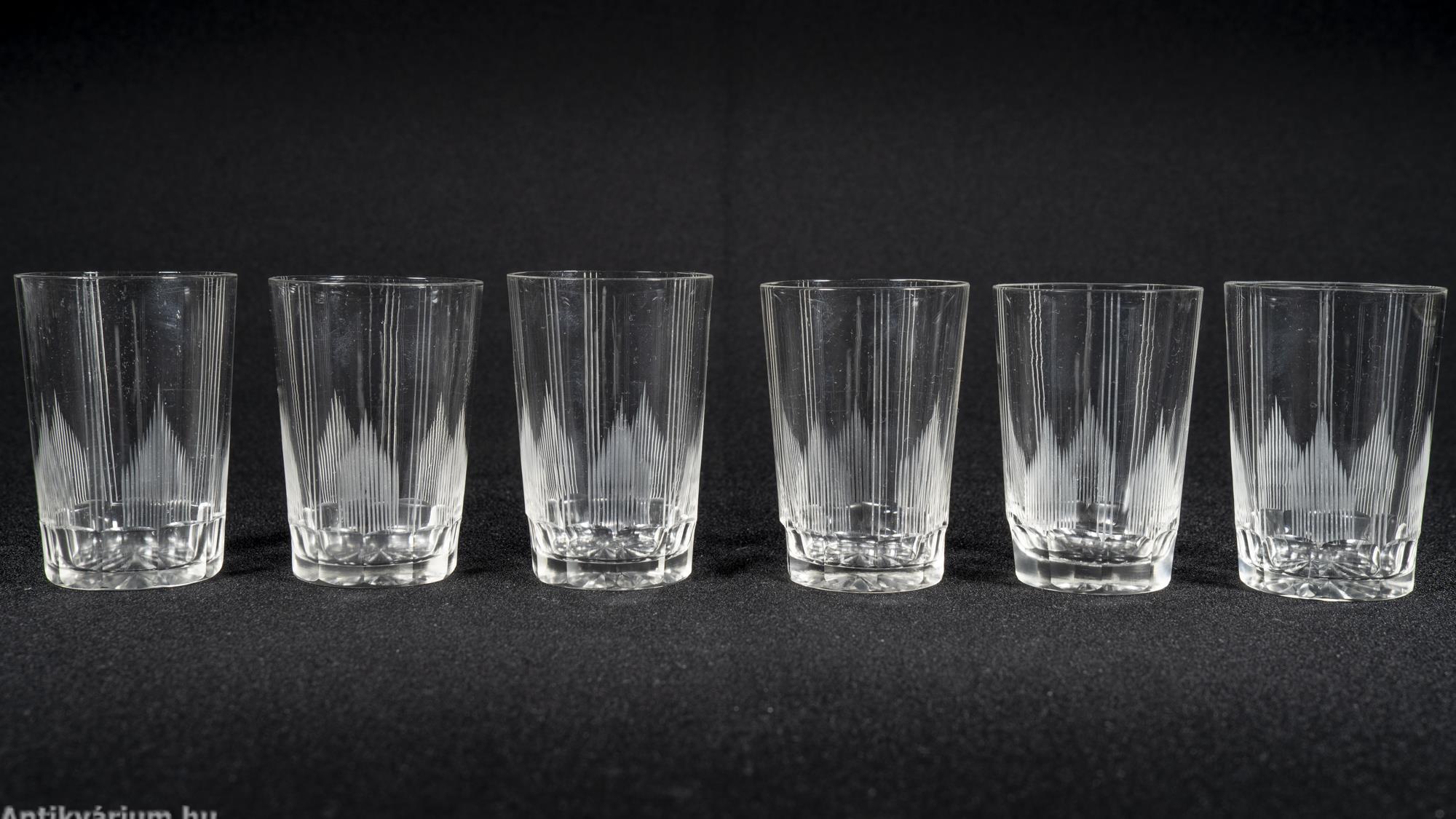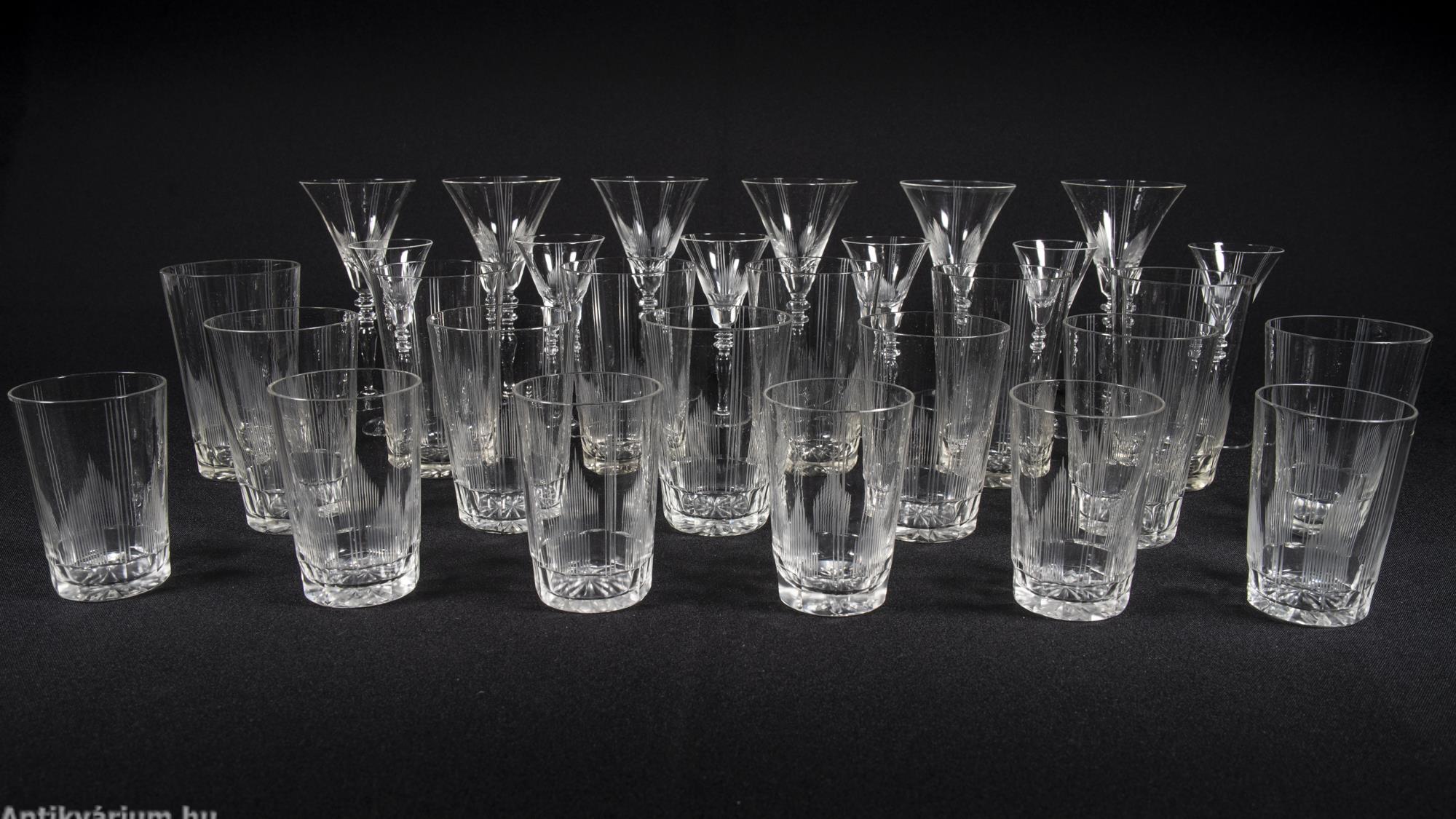 Hibátlan állapotú fújt és kézzel formázott bécsi art deco 30 darabos csiszolt üveg pohár készlet a 20. század elejéről. A szett 2 x 6 darab talpas pohárból és 3 x 6 darab talp nélküli pohárból áll az art decóra jellemző sűrűn csiszolt geometrikus alakzatú mintával. A talp nélküli poharak alján csillag mintájú csiszolás látható.