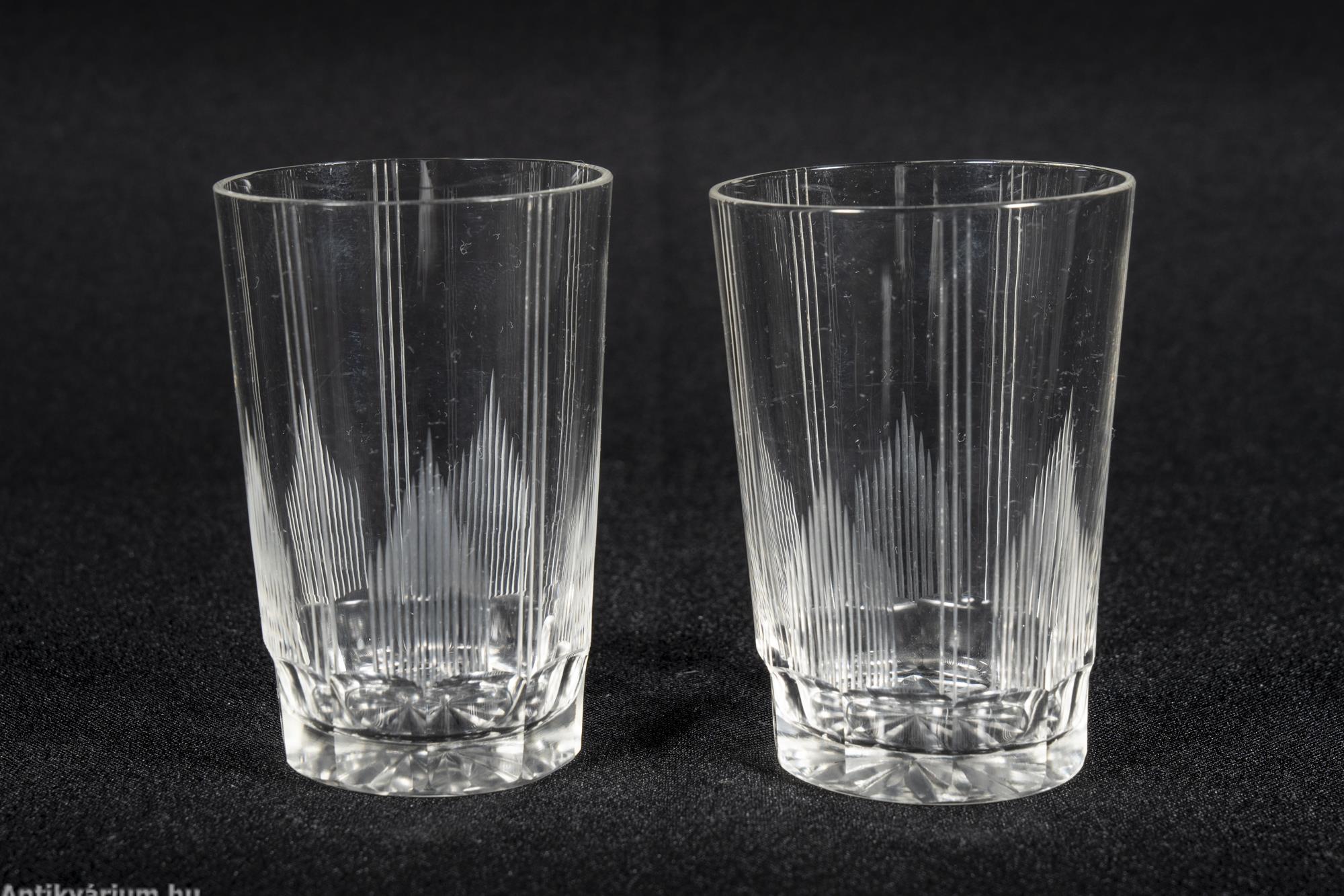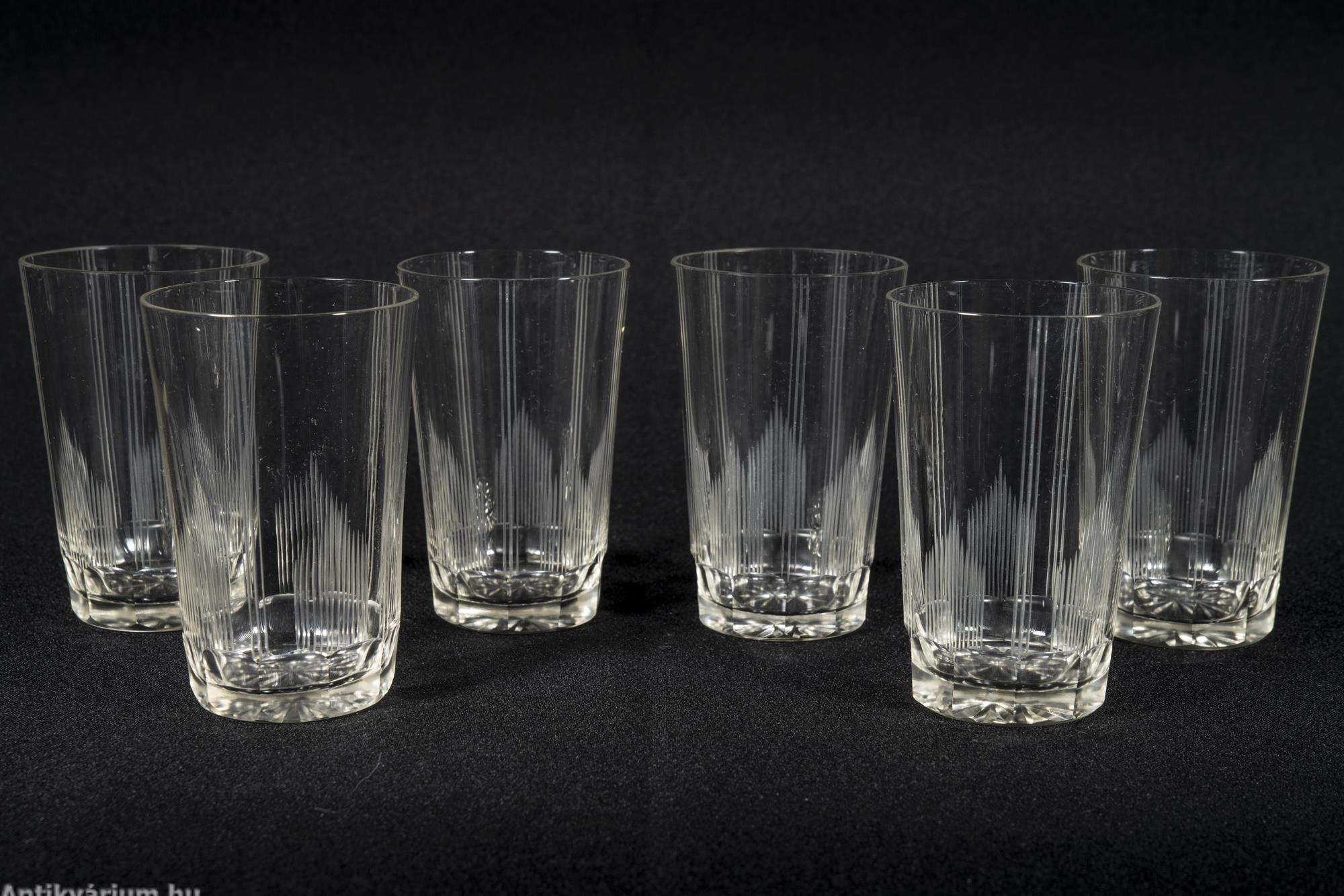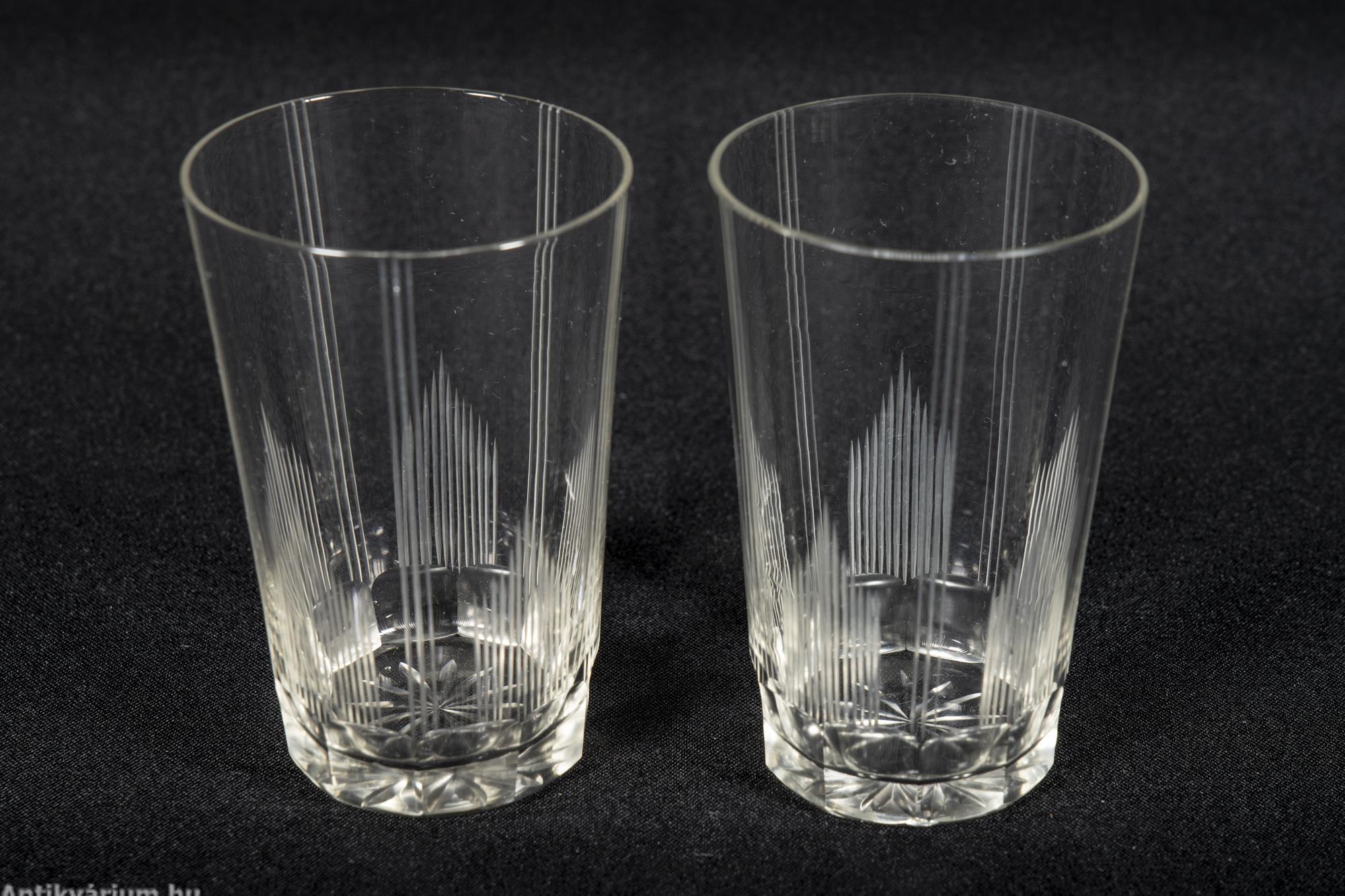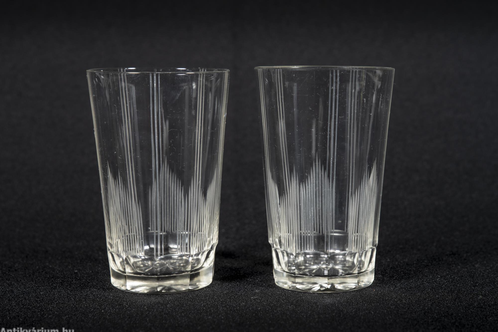 Hibátlan állapotú fújt és kézzel formázott bécsi art deco 30 darabos csiszolt üveg pohár készlet a 20. század elejéről. A szett 2 x 6 darab talpas pohárból és 3 x 6 darab talp nélküli pohárból áll az art decóra jellemző sűrűn csiszolt geometrikus alakzatú mintával. A talp nélküli poharak alján csillag mintájú csiszolás látható.