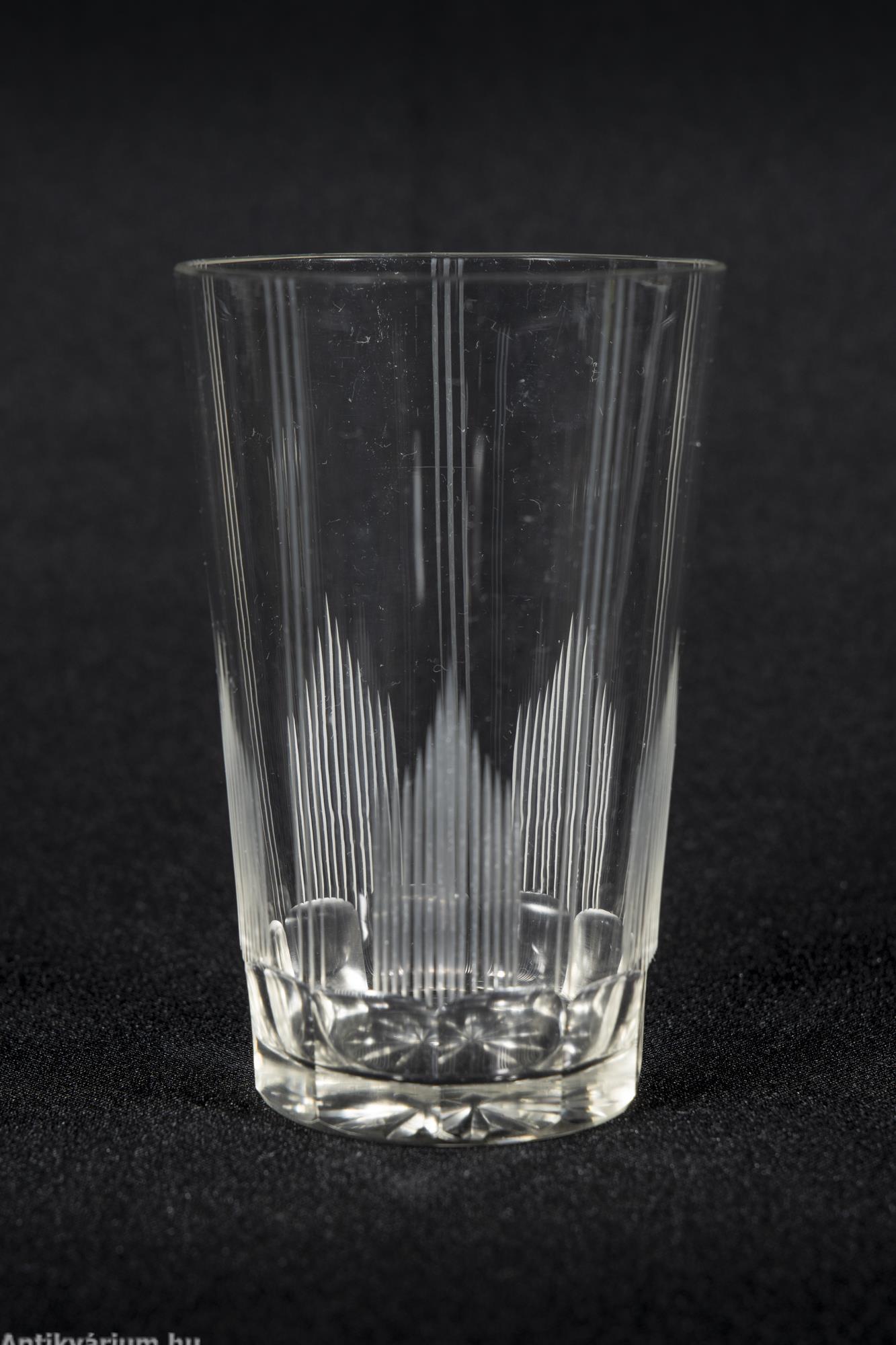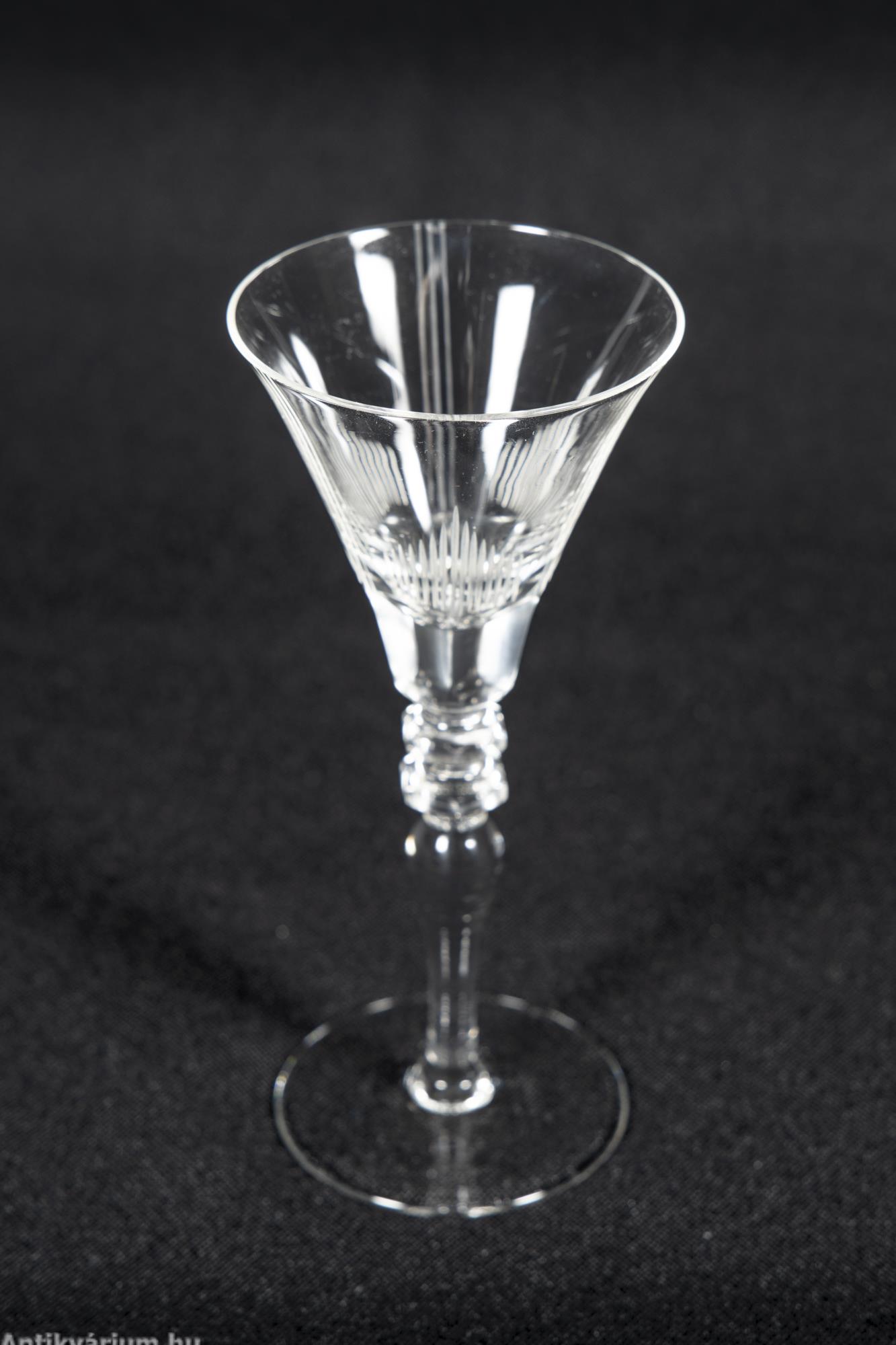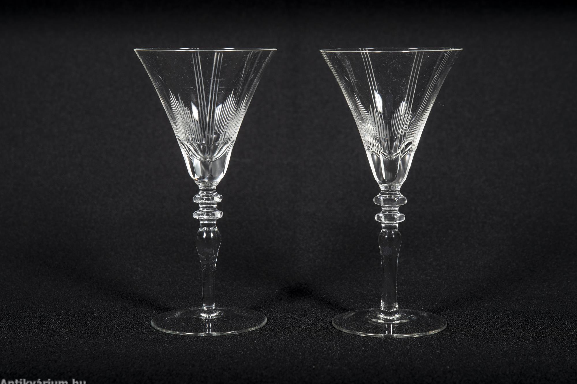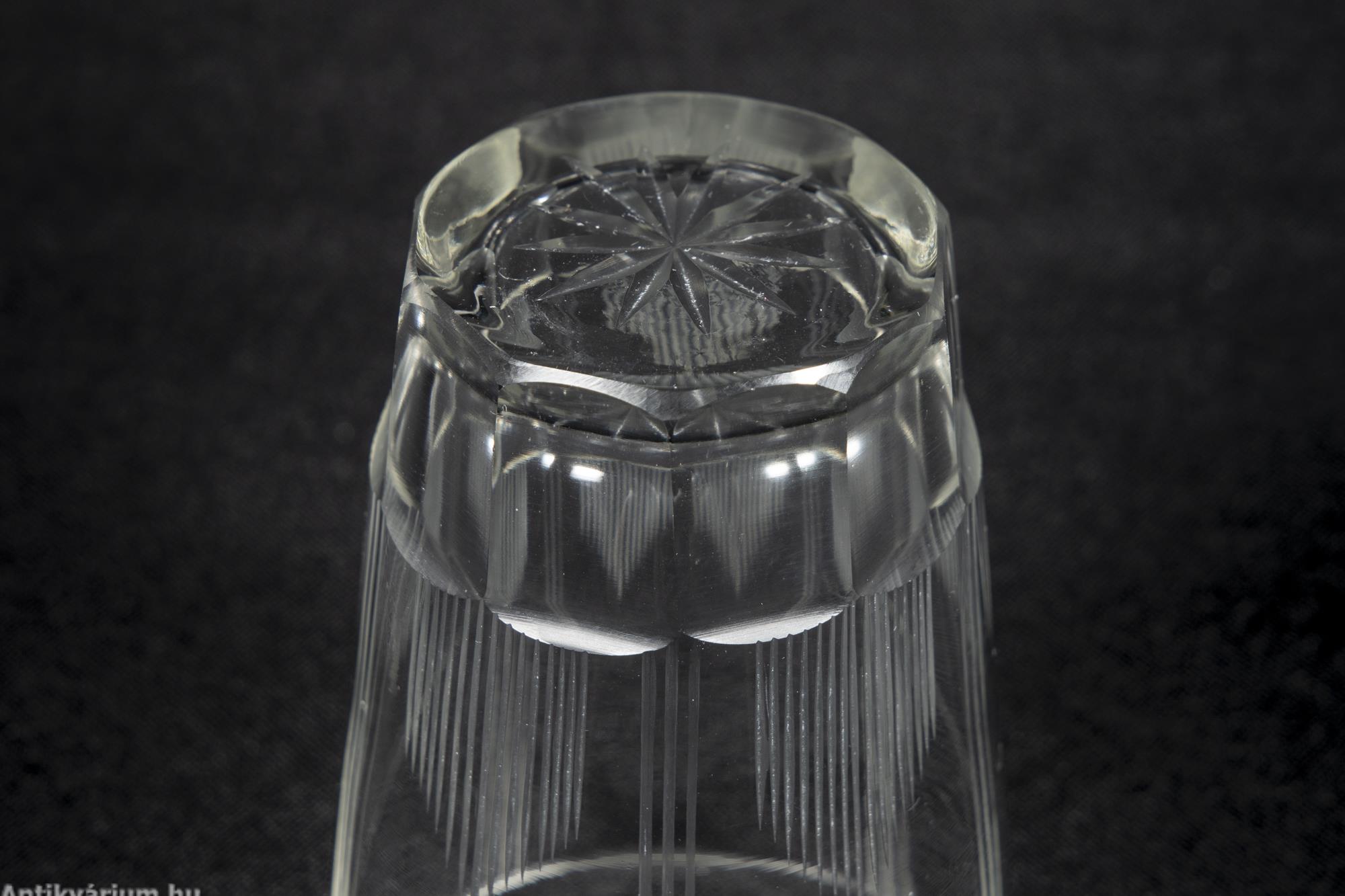 Hibátlan állapotú fújt és kézzel formázott bécsi art deco 30 darabos csiszolt üveg pohár készlet a 20. század elejéről. A szett 2 x 6 darab talpas pohárból és 3 x 6 darab talp nélküli pohárból áll az art decóra jellemző sűrűn csiszolt geometrikus alakzatú mintával. A talp nélküli poharak alján csillag mintájú csiszolás látható.
