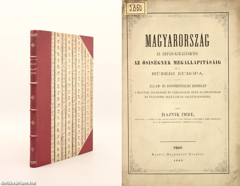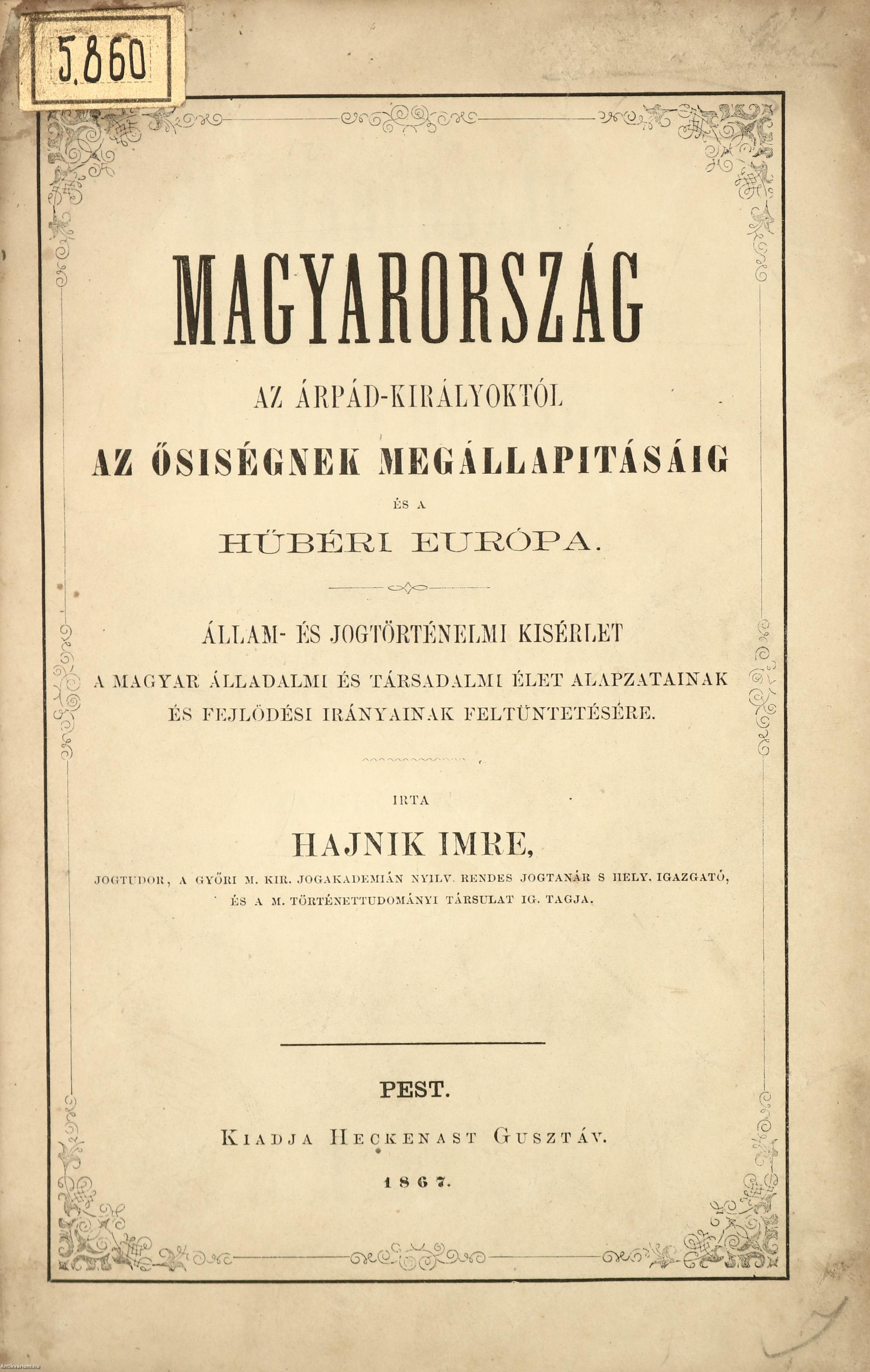 Első kiadás. Magyarország az Árpád-királyoktól az ősiségnek megállapitásáig és a hűbéri Európa. Állam- és jogtörténelmi kisérlet a magyar álladalmi és társadalmi élet alapzatainak és fejlődési irányainak feltüntetésére. Írta: Hajnik Imre.