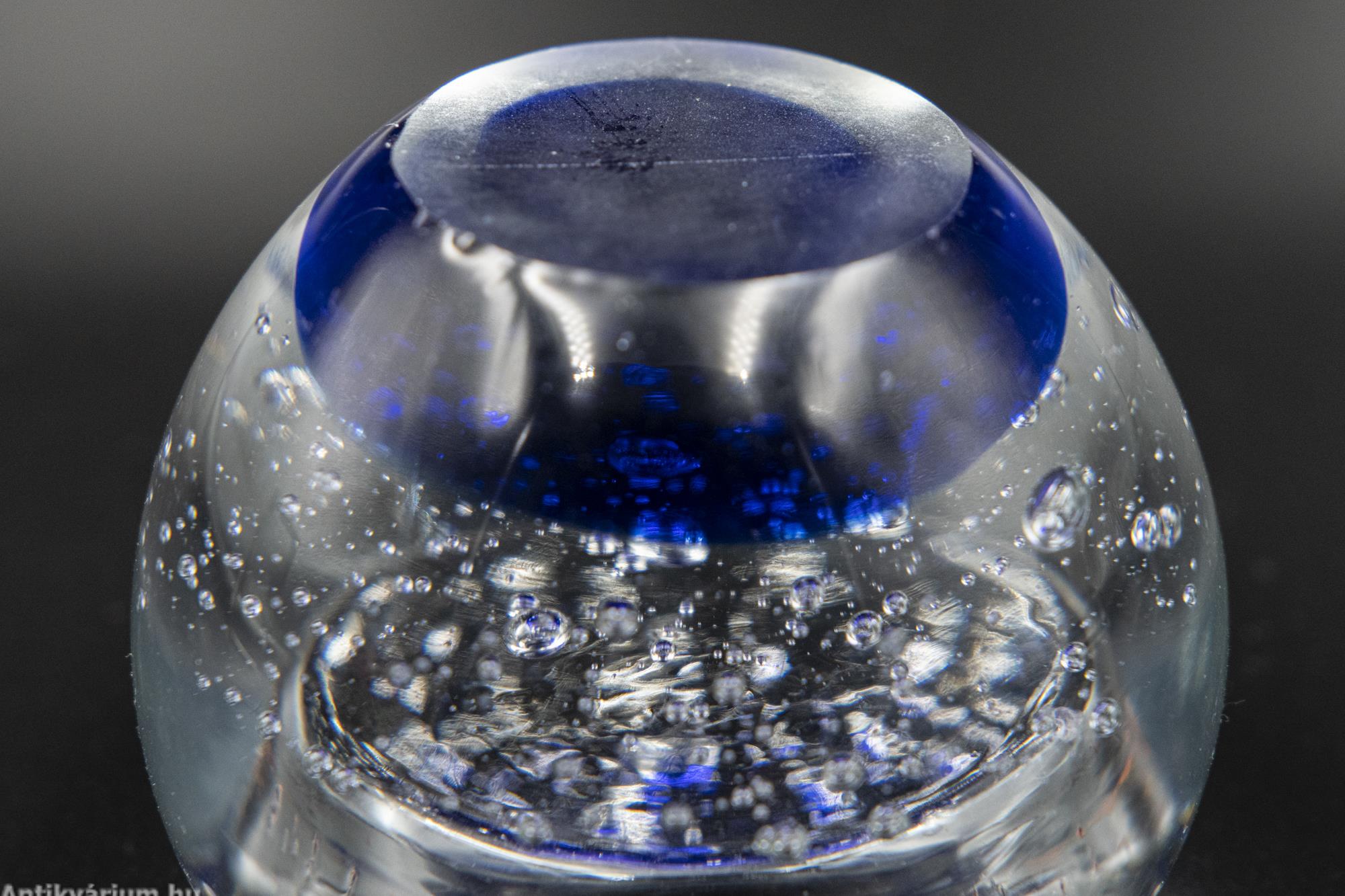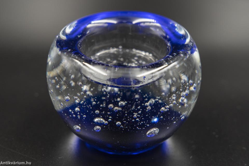 Hibátlan állapotú fújt és kézzel formázott skandináv kék levegőbuborékos üveg tálka a 20. század második feléből. Az üveg tálka királykék buboréküvegből készült, amit "bullicante"-nak is neveznek, amely eljárást az 1930-as években fejlesztettek ki Muranoban. Megjelenésében egy vastag üvegréteg, amelynek díszítését a több rétegben egyenletesen felhelyezett apró légbuborékok adják. Létrehozásához egy speciális fémhegyekkel bélelt szerszámot használnak, amelyek kis tereket hagynak az olvadt massza felületén, amelyet aztán egy újabb réteg olvadt üvegbe merítenek, így a felületi feszültség hatására apró légbuborékokká alakulnak. Ha ezt a műveletet többször megismételjük, akkor ezzel az egymás feletti buborékok hatása érhető el.