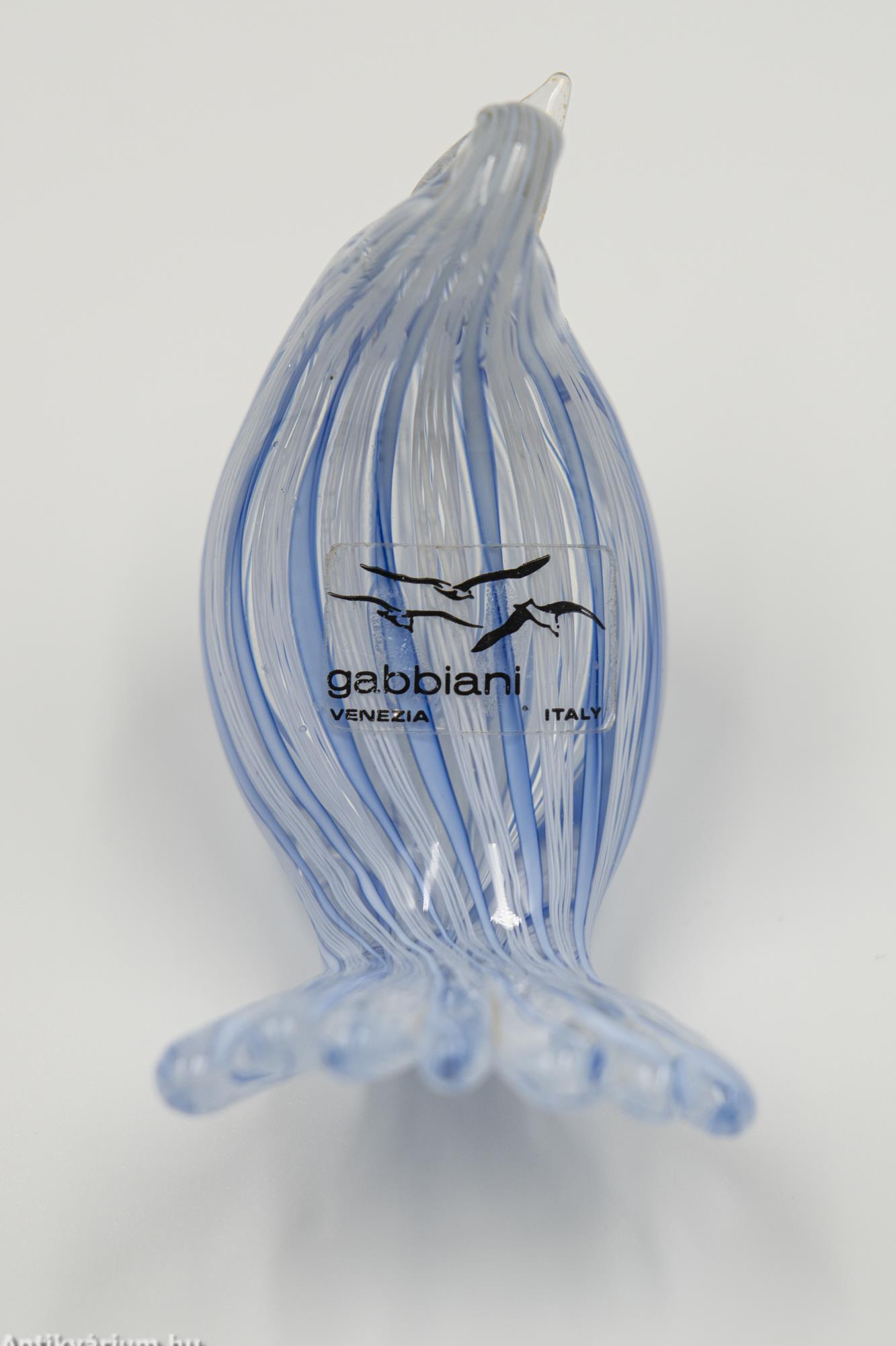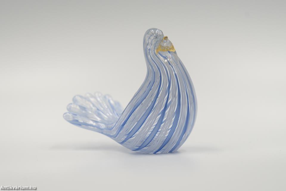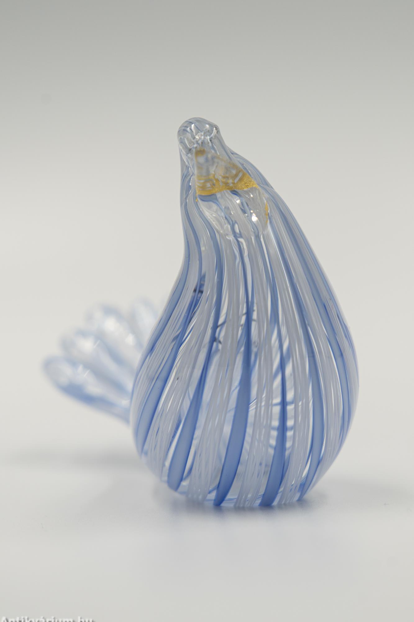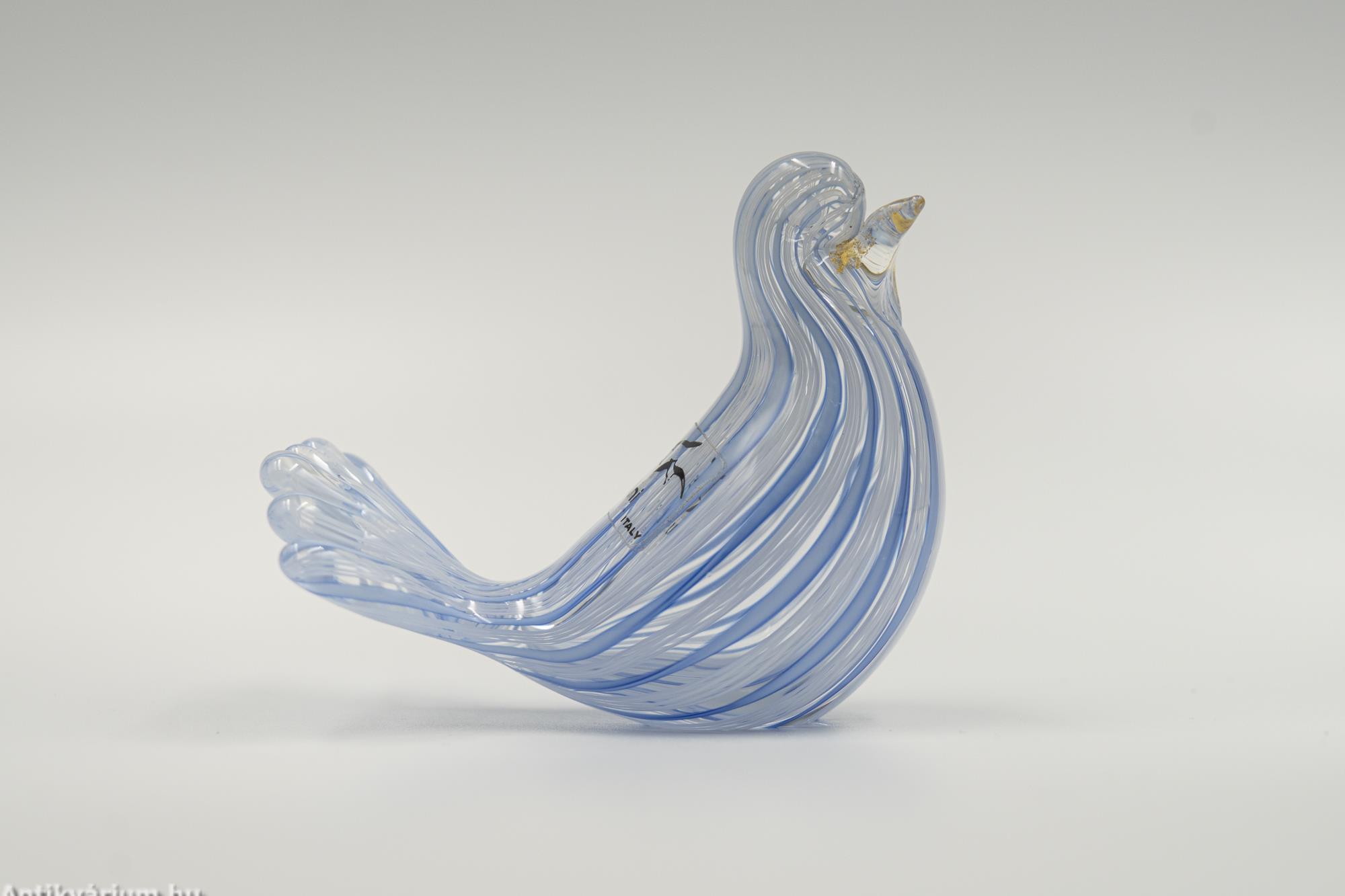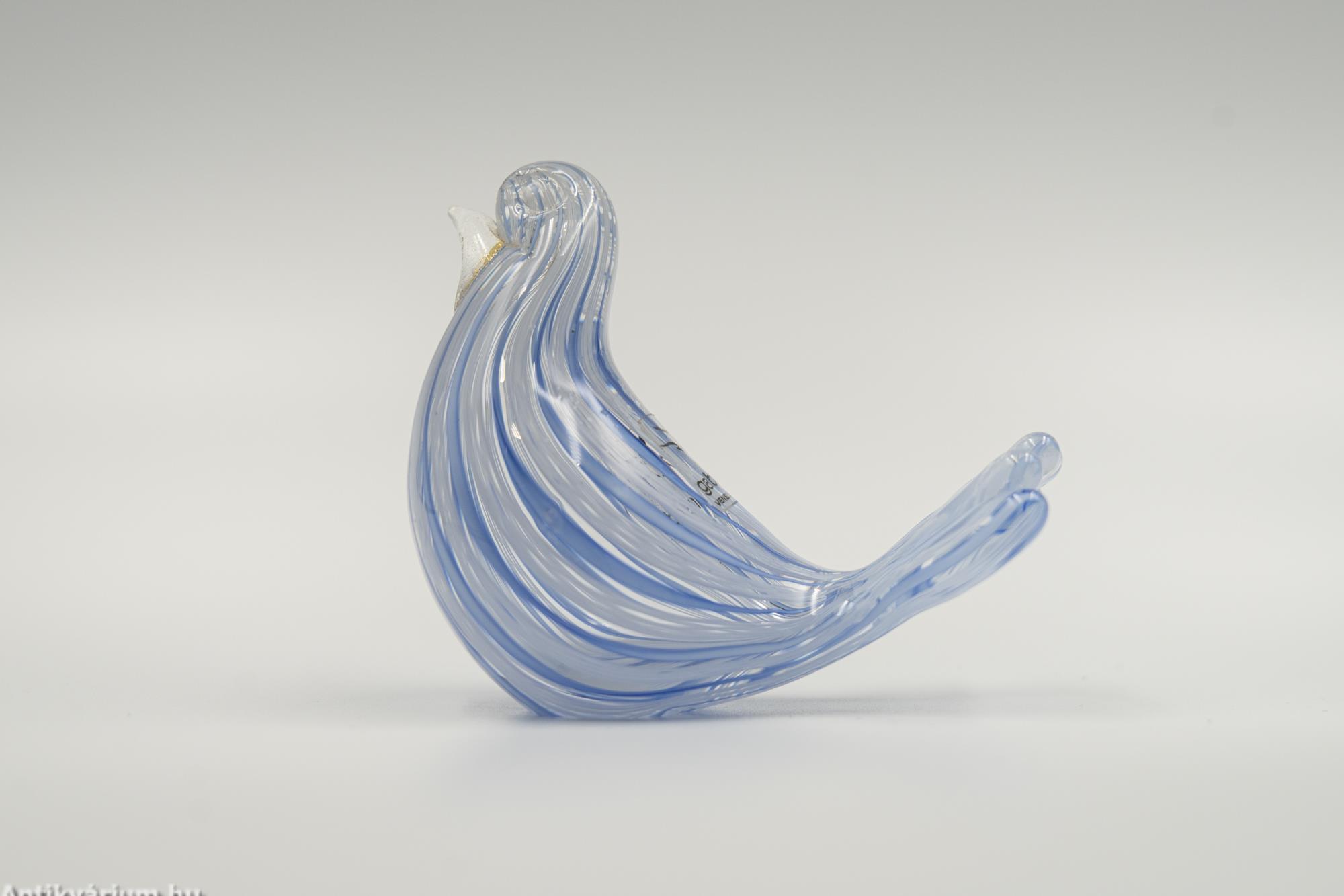 Hibátlan állapotú, fújt és kézzel formázott madár Murano üveg állat figura a 20. század közepéről. Jellegzetessége a lendületes, íves formája valamint az átlátszó üvegben futó fehér és égszín kék árnyalatú üvegszalagok együttese, amelyek a "mezza filigrana" technikával készültek. Csőre aranyfólia rétegekkel díszített. A mezza filigrana eljárás egy hagyományos technika, amely a 16. századra nyúlik vissza. A hosszú üvegrudak (átlátszó, színes vagy lattimo üveg) egymásra vannak helyezve, összefonva és összeolvasztva. A rudat egy üveghenger köré tekerik, formára fújják és üvegkészítő eszközökkel formálják. Pasztell színével és finom formai kialakításával is kedves alkotás. Etikettel ellátott üveg dísztárgy.