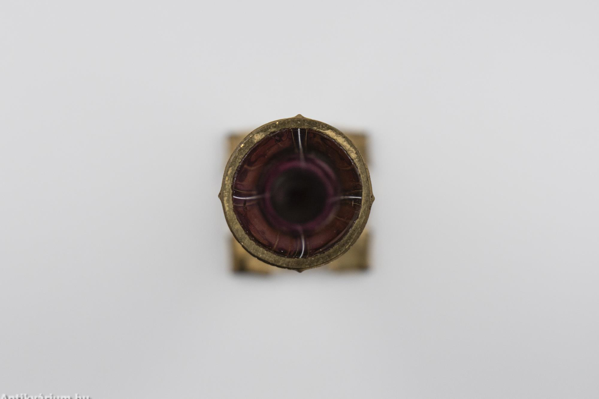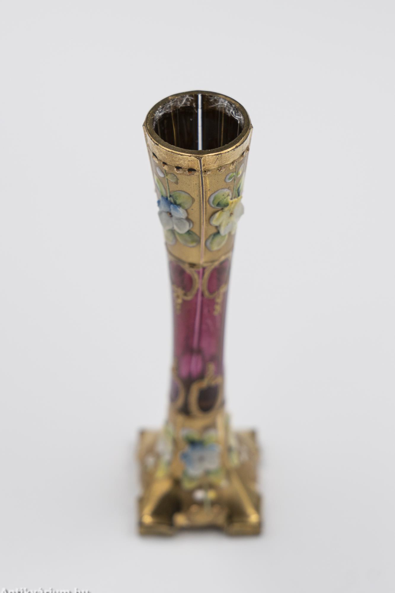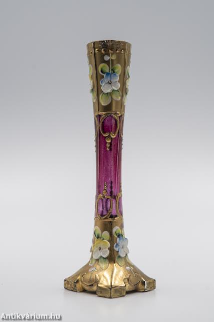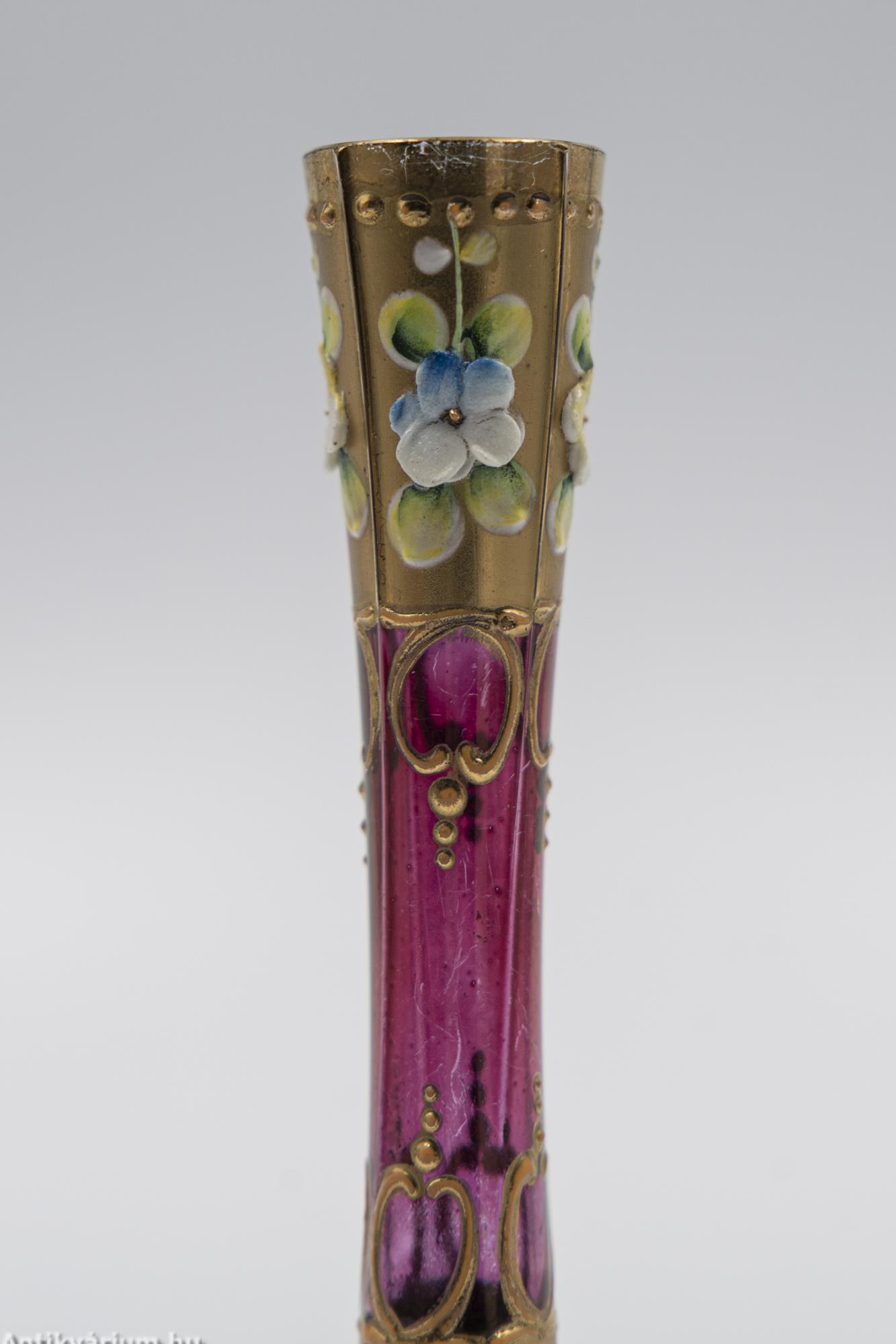 Hibátlan állapotú, szecessziós, rózsaszín mini Moser üveg váza a 20. század elejéről. Kézzel fújt és formázott, talpa simára csiszolt. A váza alsó és felső felülete arannyal festett valamint kézzel festett domború virágmotívumokkal díszített. Finom megjelenését kiemeli a korra jellemző színes virág üvegrátét dekoráció. Méreténél fogva igazi vitrin dísztárgy.