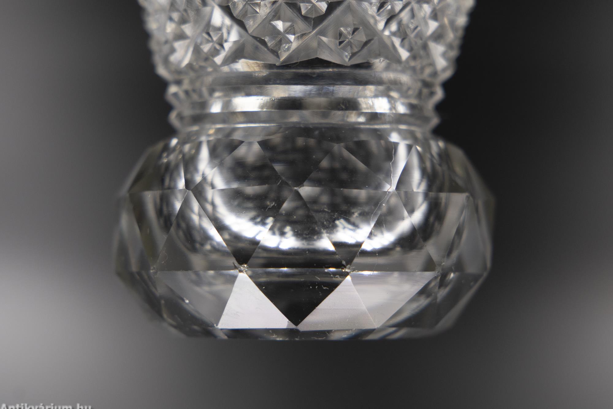 Fújt és kézzel formázott, valamint csiszolt art deco Moser üveg váza. Nagy tisztaságú színtelen üvegből készült lapra csiszolt alsó résszel, felső részén részletgazdagon díszített geometrikus gyémántcsiszolások láthatóak. Fényesen csillogó, a kor stílusát és az igényesen megmunkált Moser csiszolás egyedi jellemzőit megjelenítő üveg váza a 20. század elejéről.