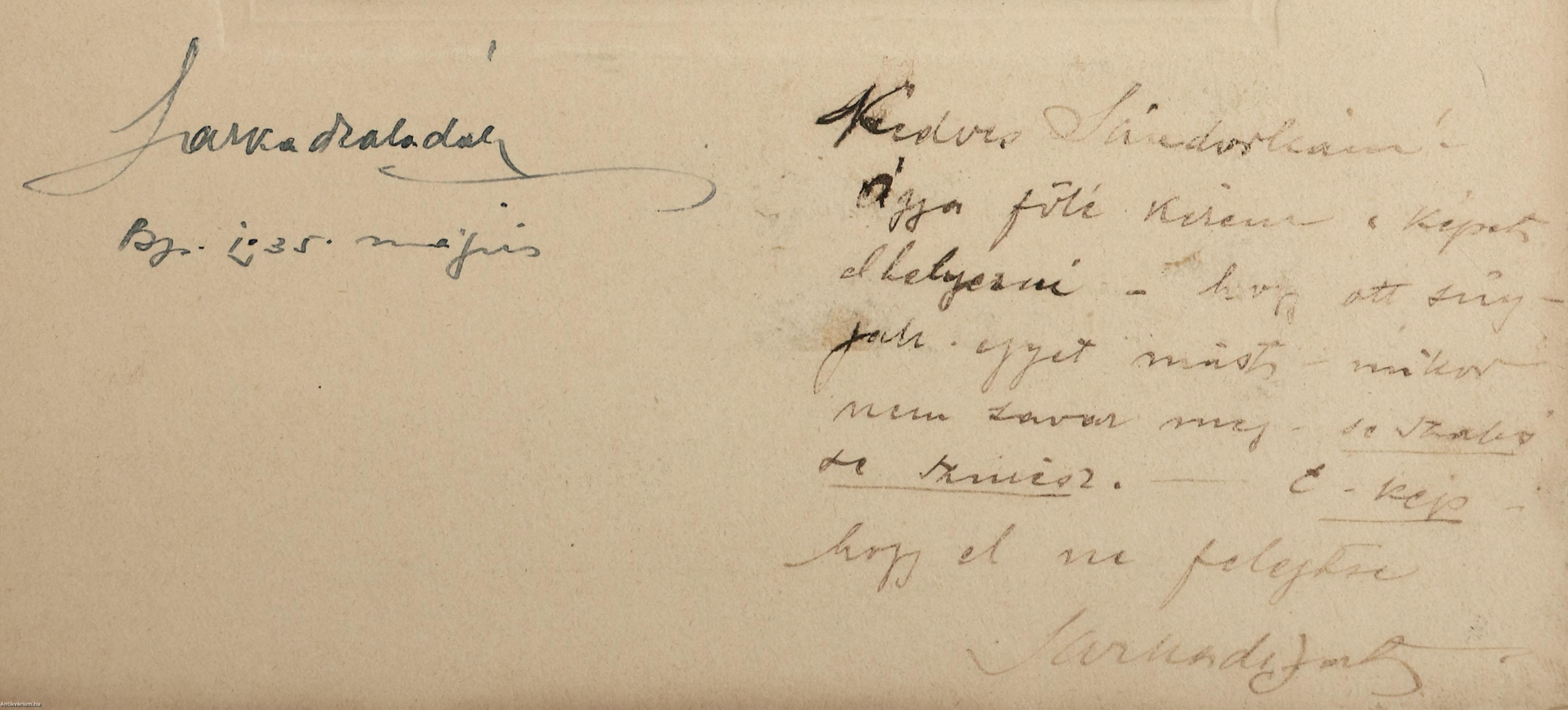 A fénykép alatt, a paszpartu jobb szélén Sarkadi Aladár tollal beírt, névre szóló, dátum nélküli dedikációja, a dedikációtól balra ugyanő egy másik színű tollal írt, jól olvasható, 1935. májusra datált aláírása látható. A dedikáció szövege a következő: "Kedves Sándorkám! Ágya fölé kérem e képet elhelyezni – hogy ott súgjak egyet-mást – mikor nem zavar meg – se szabó, se szinész. – E-kép, hogy el ne felejtse Sarkadiját"