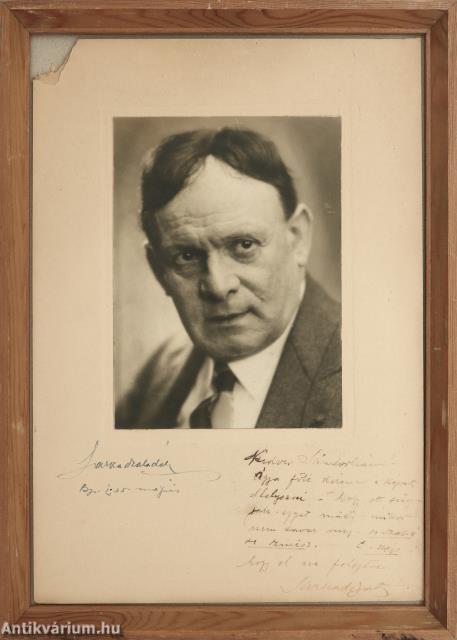 A fotót dedikálta: Sarkadi Aladár (Budapest, 1874. március 26. – Budapest, 1949. december 15.) színész, komikus. 1892-ben, daltársulatoknál kezdett szerepelni, az ország csaknem valamennyi jelentősebb városában fellépet. A századforduló éveiben jelentős vidéki társulatok szerződtették Pozsonyba, Kecskemétre, Debrecenbe és Aradra. 1903-tól a Vígszínház, majd a Király Színház művésze volt. A Vígszínházból került az OMIKE társulatába. Az 1920-30-as években Fővárosi Operettszínházban játszott, ahová a második világháború után is visszatért. Élete végén a Medgyaszay Színházban lépett fel. Főként humoros epizódfigurákat alakító színészként vált híressé, kabarészínpadokon önálló eseteket is tartott.