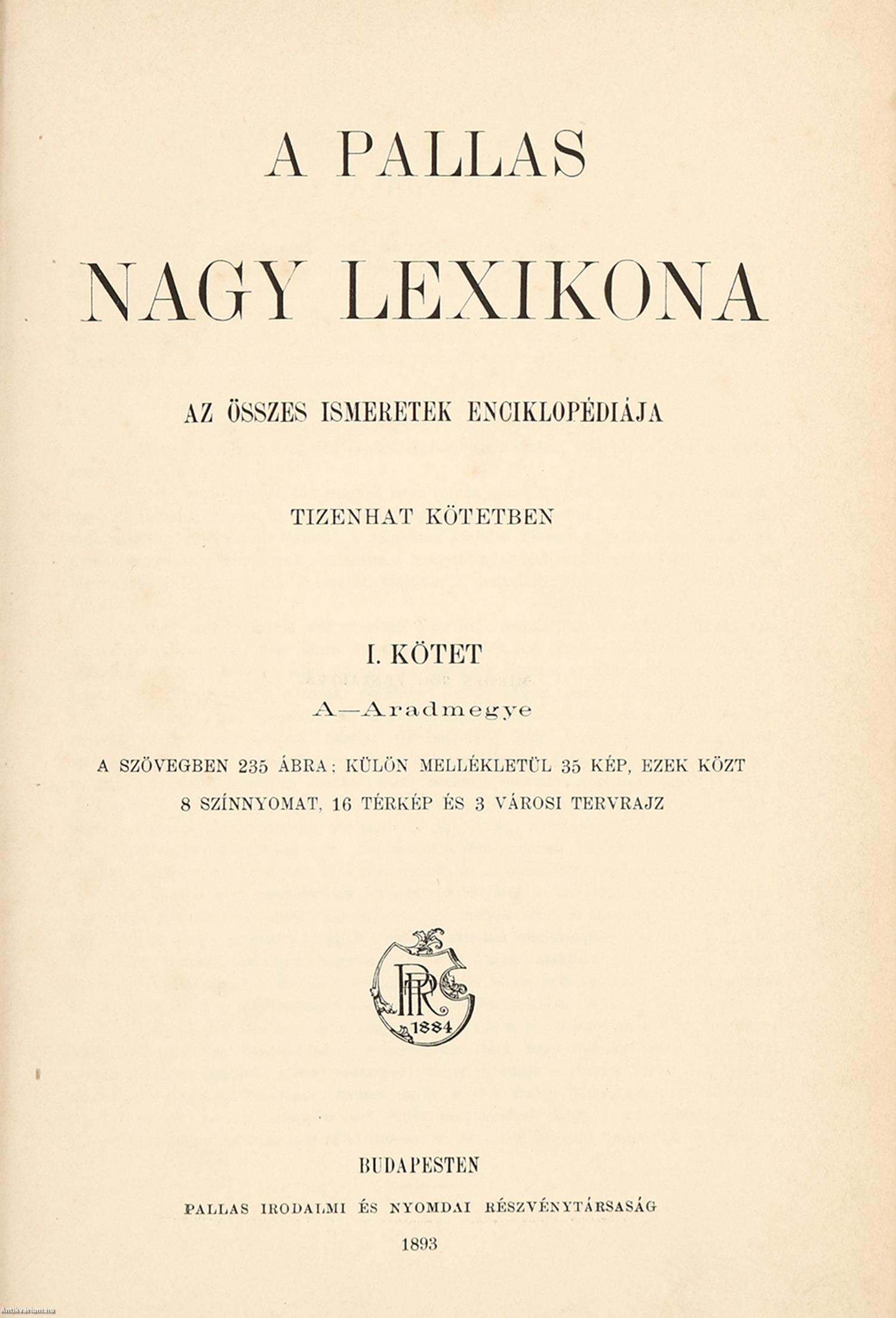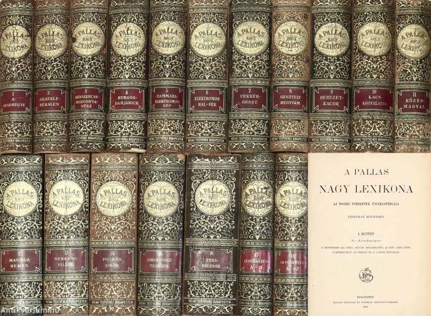 A Pallas Nagy Lexikona I-XVIII. Az összes ismeretek enciklopédiája tizenhat kötetben. Központi szerkesztő: dr. Bokor József