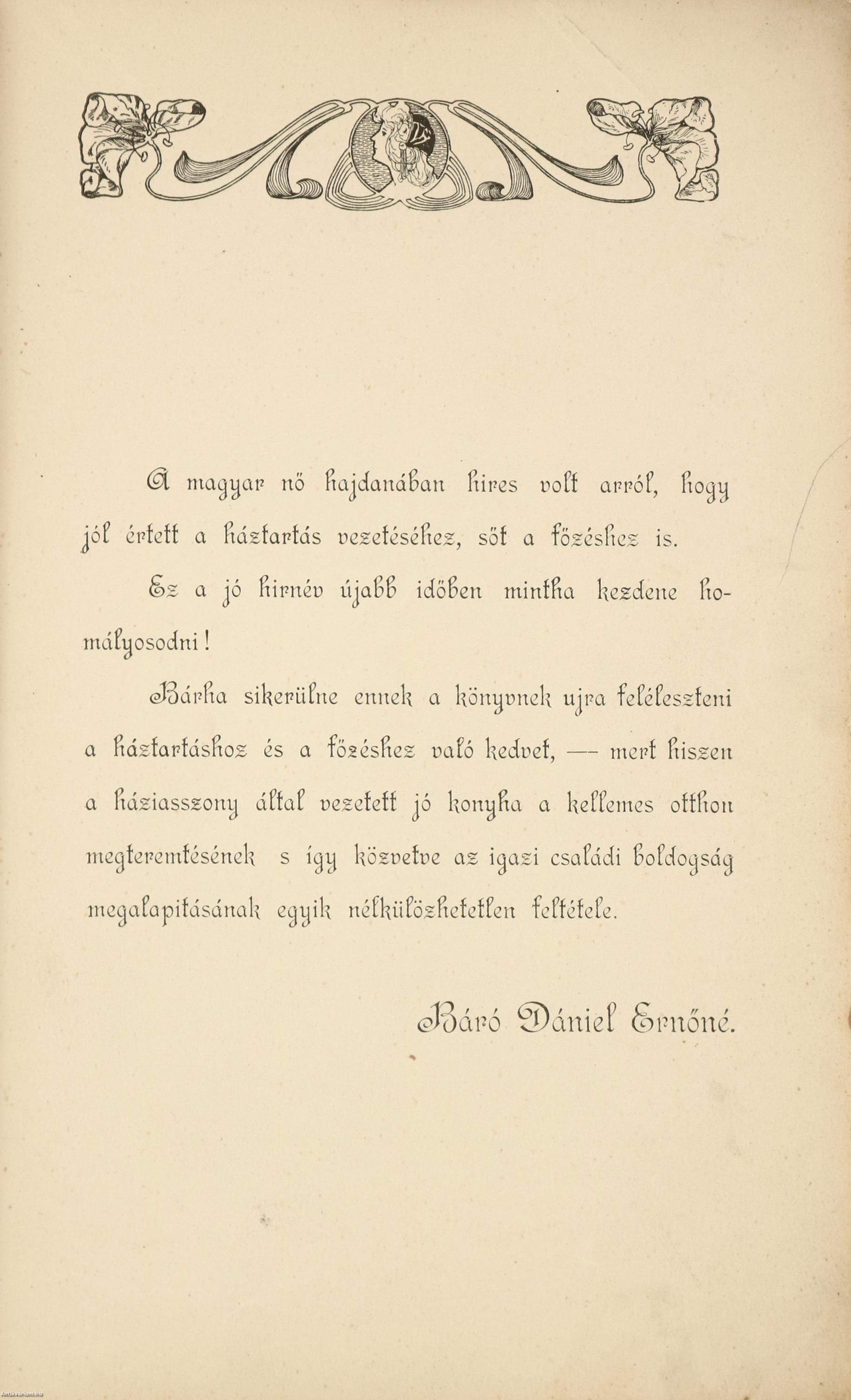 A Magyar Háztartási Iskola fözöiskolája volt bölcsője a könyvnek, melyet szerzője im útnak bocsájt s melyet mint a Magyar Háztartási Iskola egyik eszméjének gyakorlati megtestesülését üdvözlök....