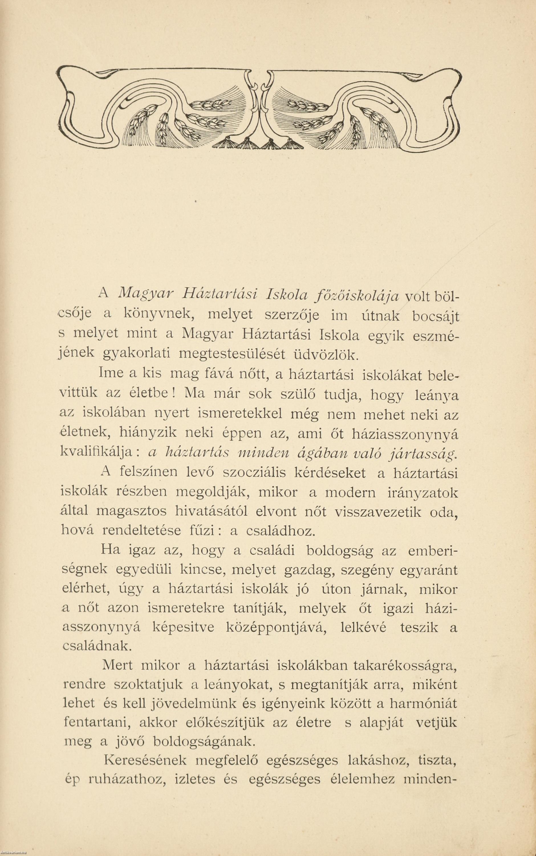 A Magyar Háztartási Iskola fözöiskolája volt bölcsője a könyvnek, melyet szerzője im útnak bocsájt s melyet mint a Magyar Háztartási Iskola egyik eszméjének gyakorlati megtestesülését üdvözlök.