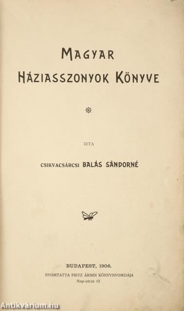 Első kiadás. Magyar háziasszonyok könyve. Írta: csikvacsárcsi Balás Sándorné. Néhány fekete-fehér könyvdísszel díszített, valamint Báró Dániel Ernőné és Dr. Ágh Géza (Magyar Háztartási Iskola igazgatója) előszavával, bevezetéssel, könyvhirdetésekkel, illetve részletes tartalomjegyzékkel kiegészített kötet. Nyomtatta Fritz Ármin Könyvnyomdája, Budapesten. Könyvkötői egészvászon kötésben lévő példány feliratozatlan címfedéllel, hátlappal és könyvgerinccel, új előzéklapokkal, néhány foltos lappal, hiánytalan állapotban. Egy recept a könyvből: "Paprikás szarvas-húsból. Grillade de cerf. Összeapritva szép egyenlő darabokra jó sok hagymát vágunk finomra, 2 kiló húshoz 2 nagy fél hagymát egy negyed kiló zsírban. Ha halvány rózsaszin, beletehető a hús, 1 kávéskanál paprikával, fél óráig igy pároljuk, azután vizet öntünk reá folyton egy-egy keveset, mig jó puha nem lesz és tarhonyával körözve tálaljuk. Ha pedig mártással óhajtjuk, ugy fél liter tejfelt 1 kanál liszttel elhabarunk, azt negyed liter vizzel felöntjük a húsra. Zsírban sült héjjazott burgonyával tálaljuk".