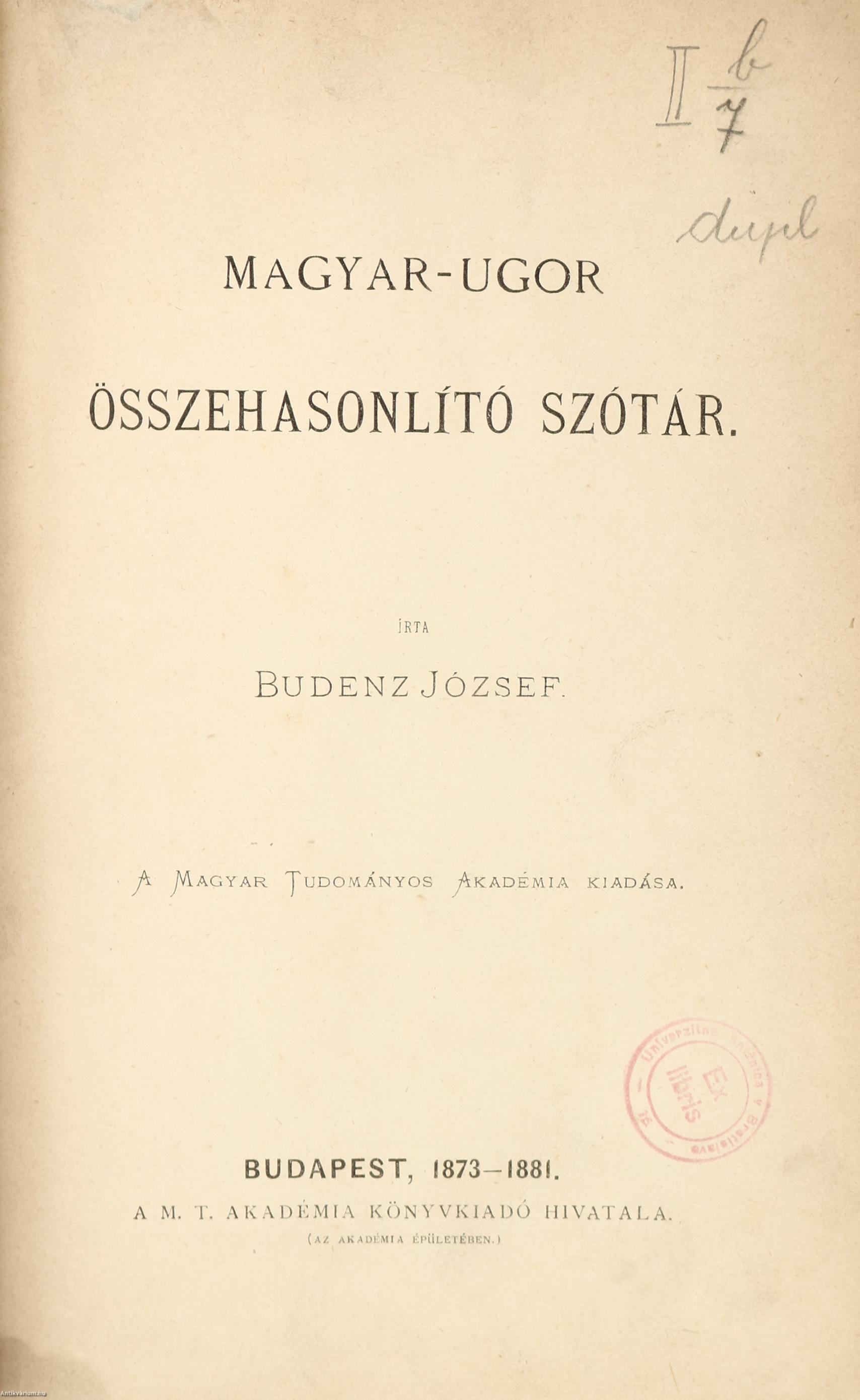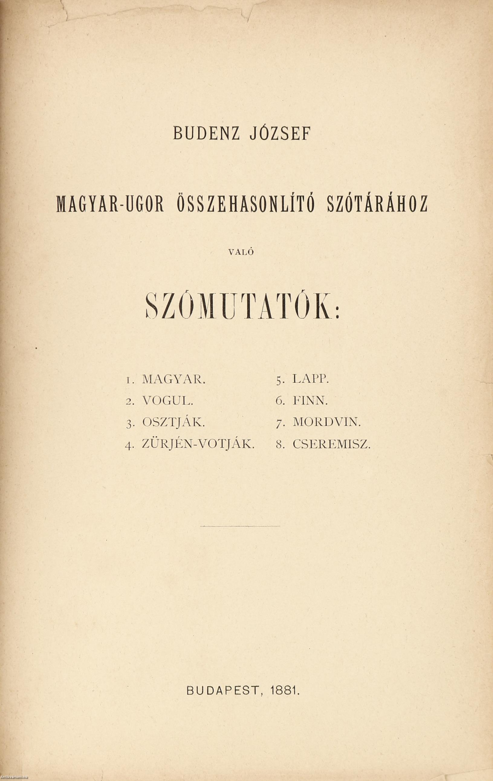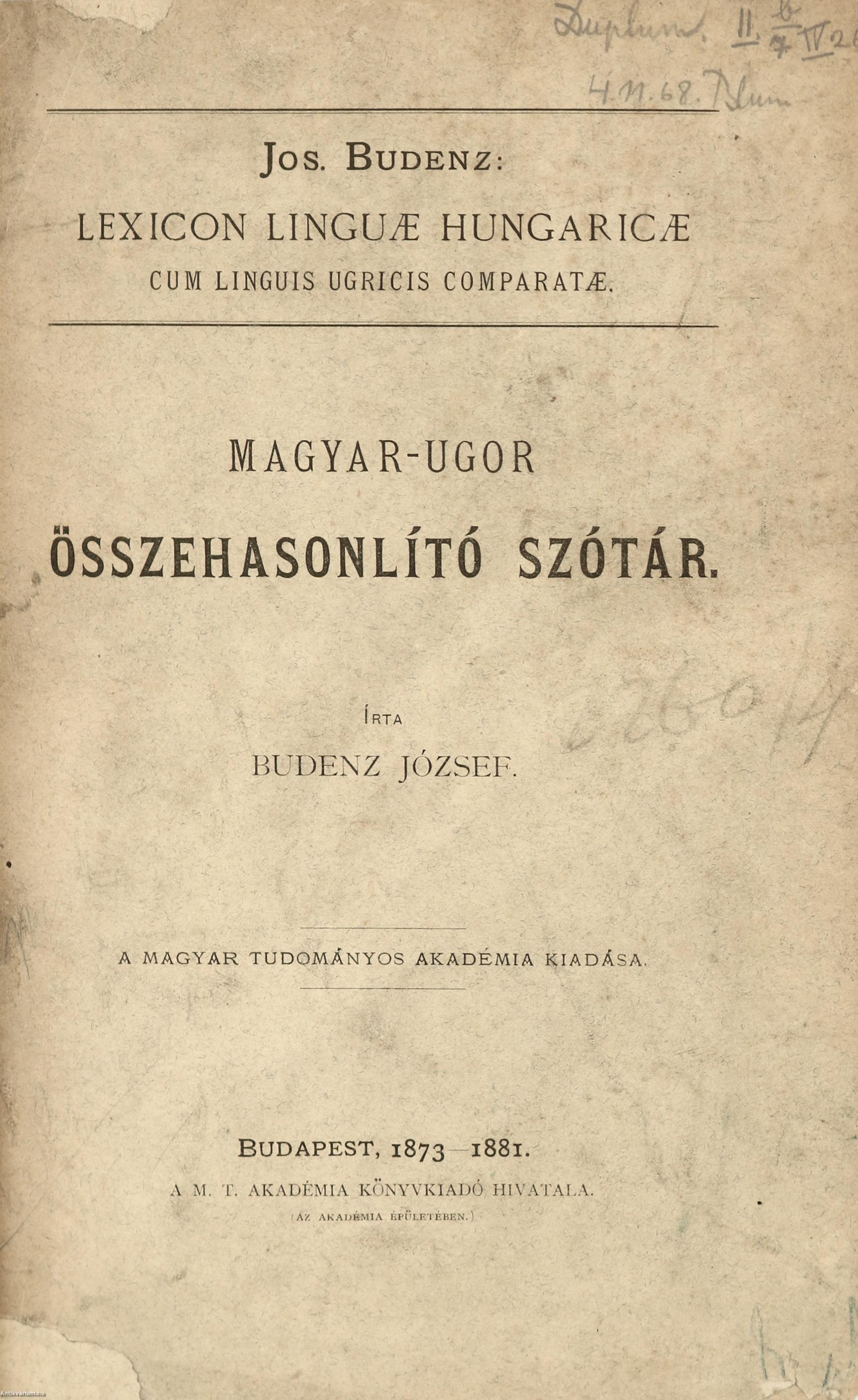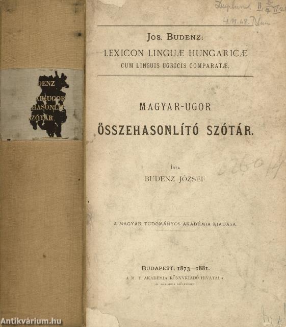 Előszóval, egyéb tudnivalókkal (források, írásmód és átírás, rövidítések), sajtóhibák jegyzékével és pótlásokkal kiegészített kötet. A könyv szerepelt az ÁKV 1980. évi, XIV. aukciójának 65. tételeként (címke a hátlap felőli előzéklapon). A kiadói címfedélen és a címlapon ceruzával írt tulajdonosi bejegyzés, valamint szintén a címlapon tulajdonosi bélyegzés látható. Könyvkötői egészvászon kötésben lévő példány feliratozatlan címfedéllel és hátlappal, kopott feliratozású (aranyozott) könyvgerinccel, az eredeti, feliratozott, pótolt, kiadói címfedél megtartásával, hiánytalan állapotban. A kötet szerzője, Budenz József (Rasdorf, Németország, 1836. június 13. – Budapest, 1892. április 15.) német származású magyar nyelvtudós, egyetemi tanár, a Magyar Tudományos Akadémia tagja. Indogermanisztikát tanult, de később az urál-altáji nyelvcsaládot kutatta. Később Magyarországra költözött, majd a székesfehérvári Ciszterci Szent István Gimnáziumban tanított német és görög nyelvet, utána pedig az MTA Könyvtárának segédkönyvtárosa lett. Teljes erejét az ugor nyelvhasonlításra fordította. Az újonnan felállított „ural-altáji”, azaz Finnugor Összehasonlító Nyelvészeti Tanszék tanára lett, ez idő alatt egész iskolát nevelt fel. A hetvenes években alkotta meg legnagyobb munkáját, a "Magyar-Ugor Összehasonlító Szótárt" (1873–1881), melyet az Akadémia nagydíjjal tüntetett ki. Ebben a magyar szókincs legrégibb rétegét elemezte összevetve a rokon nyelvek megfelelő szavaival. E nagy műhöz sorakozott utóbb "Az ugor nyelvek összehasonlító alaktana" c. műve, ami a nyelvtani alakok magyarázatát adta, ez azonban befejezetlen maradt. A munka hátrahagyott töredékekeit tanítványa, Simonyi Zsigmond jelentette meg.