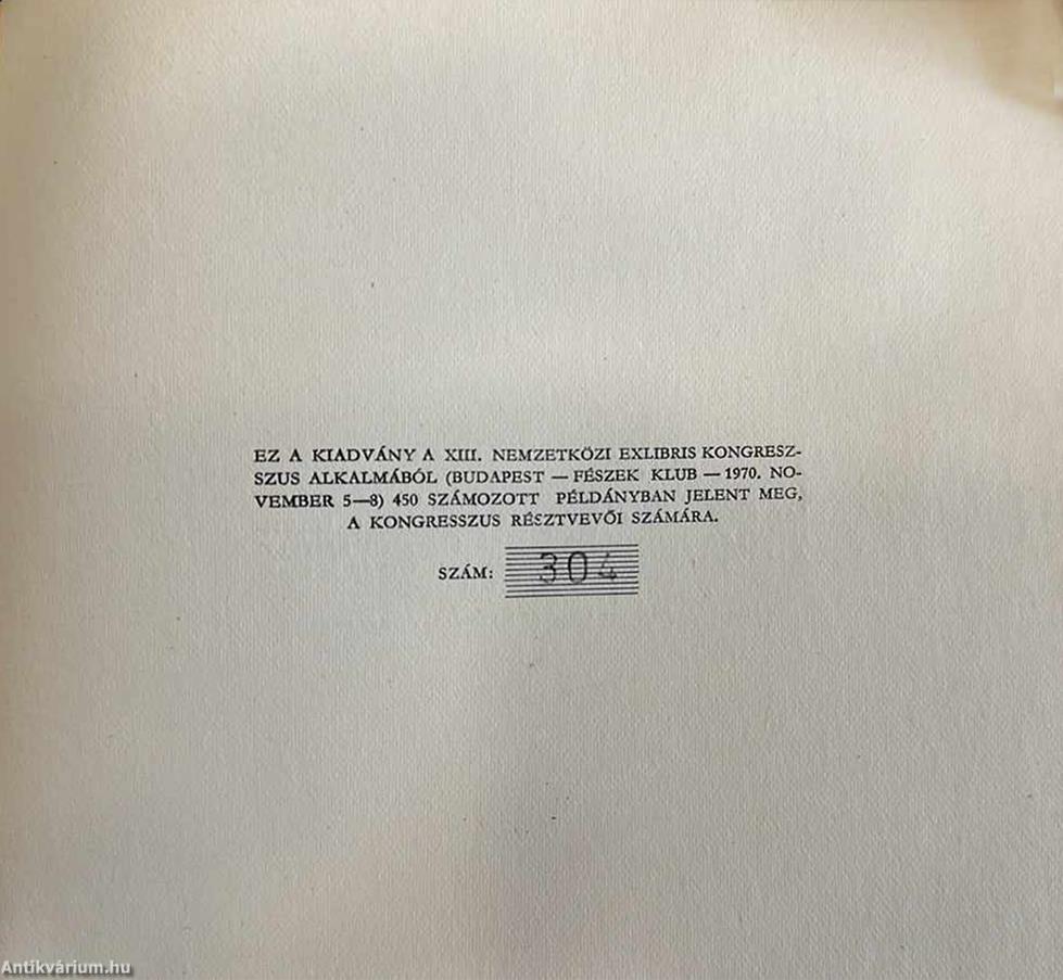 "Ez a kiadvány a XIII. Nemzetközi Exlibris Kongresszus alkalmából (Budapest - Fészek klub - 1970. november 5-8.) 450 számozott példányban jelent meg, a kongresszus résztvevői számára".