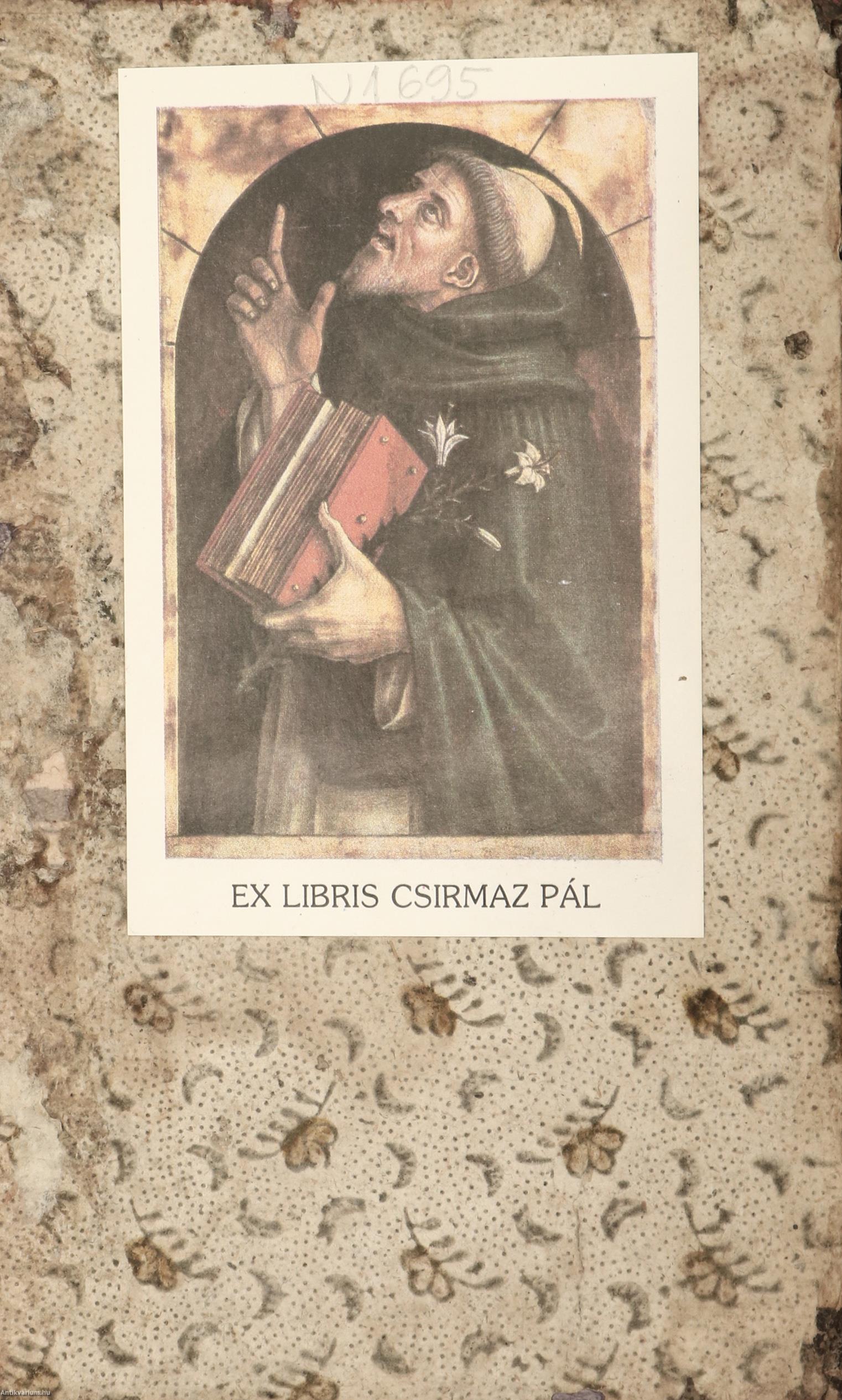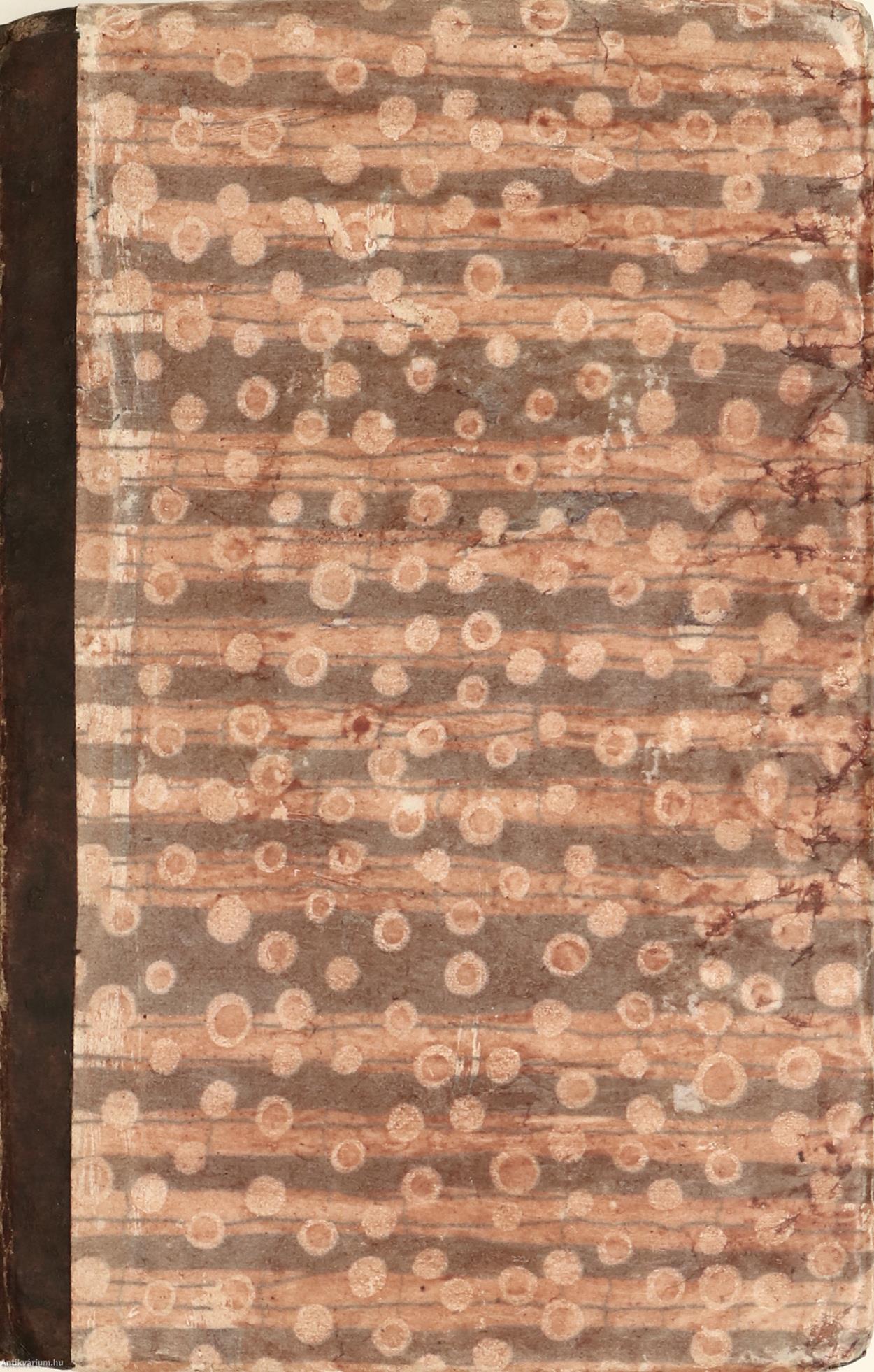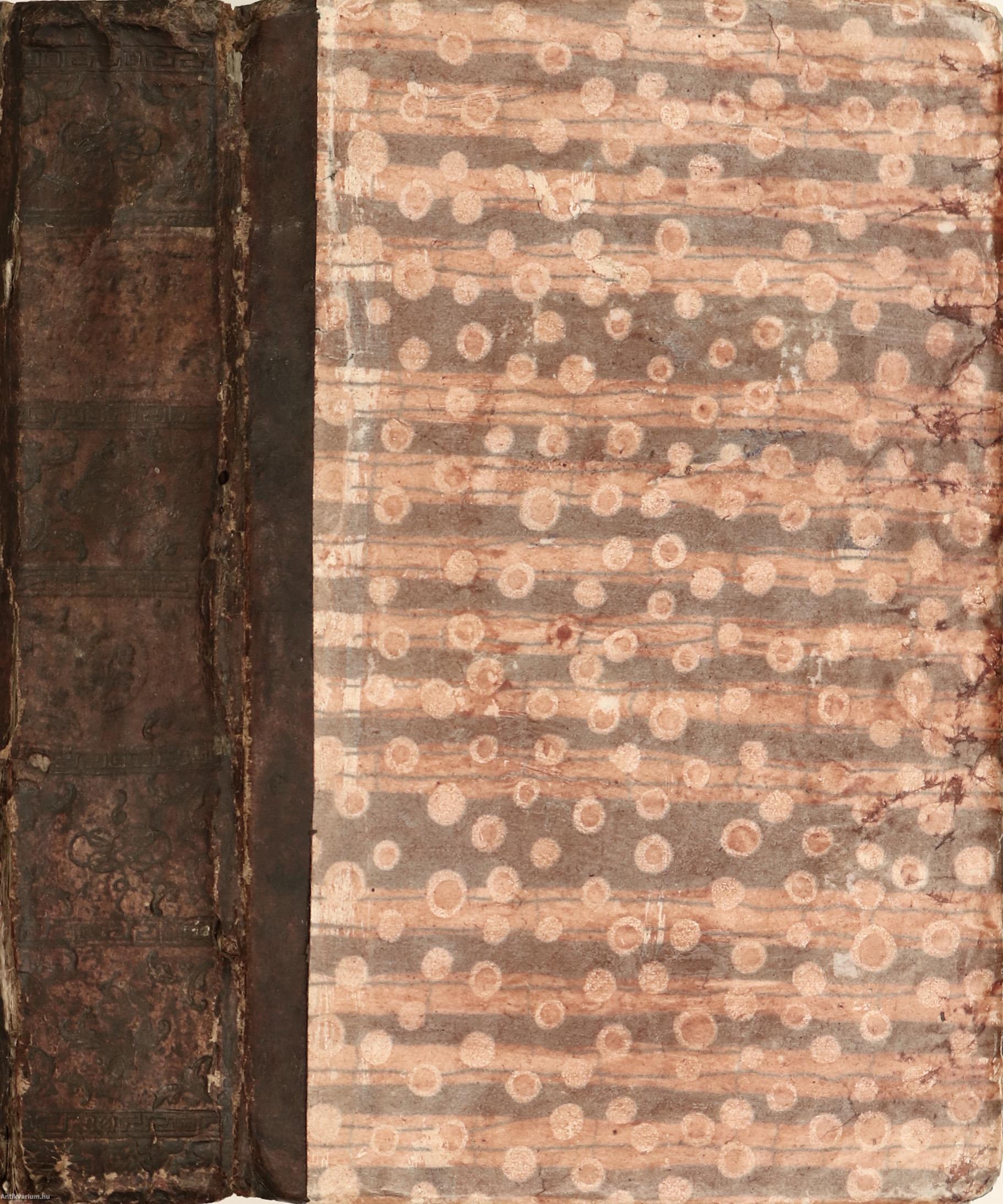 Korabeli félbőr kötésben lévő példány feliratozatlan, színes, mintás címfedéllel és hátlappal, feliratos, vaknyomással díszített, sérült könyvgerinccel, színes, mintázott, sérült előzéklapokkal, színezett lapélekkel, tiszta belívekkel, hiánytalan állapotban.