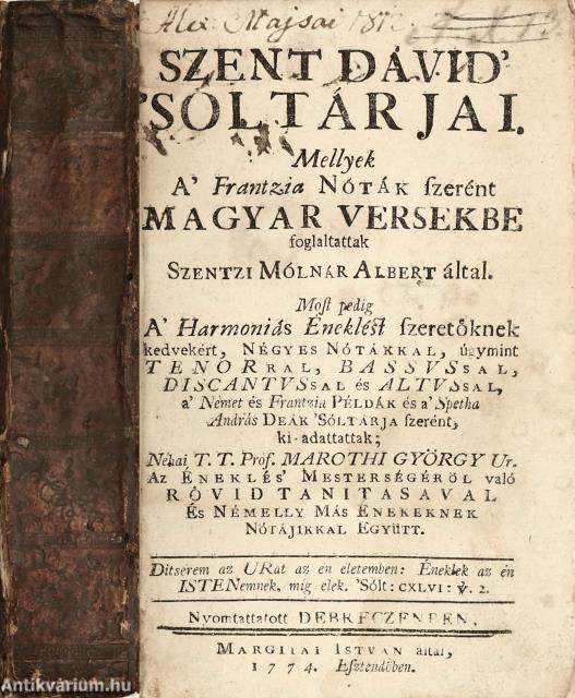 Szent Dávid' 'Sóltárjai. Mellyek A' Frantzia Nóták szerént Magyar Versekbe foglaltattak Szentzi Molnár Albert által. Most pedig a' Harmóniás Éneklést szeretőknek kedvekért Négyes Nótákkal ... ki-adattattak; ... Marothi György Ur, az Éneklés' Mesterségéről való Rövid Tanitásával És Némely Más Énekeknek Nótájikkal Együtt.