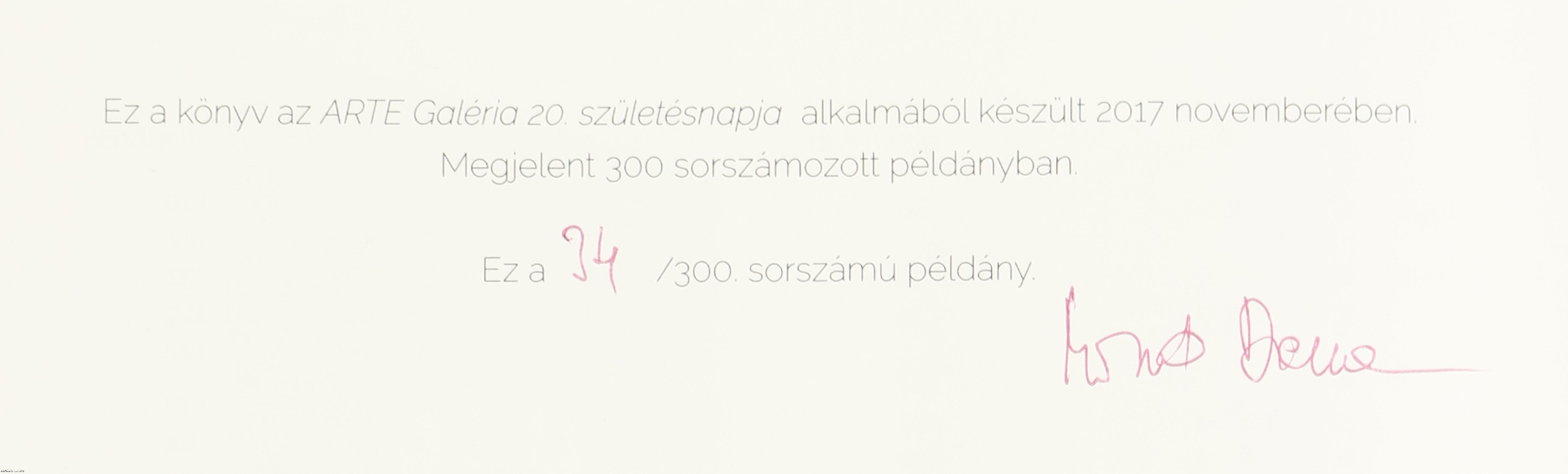 Szerkesztő által aláírt, számozott példány grafikusművész által aláírt melléklettel. ARTE20. Galéria és Aukciós Iroda. A kiadványt szerkesztette, a szöveget gondozta: Marsó Diana. Angol fordítás: Maximillian MacInnes.