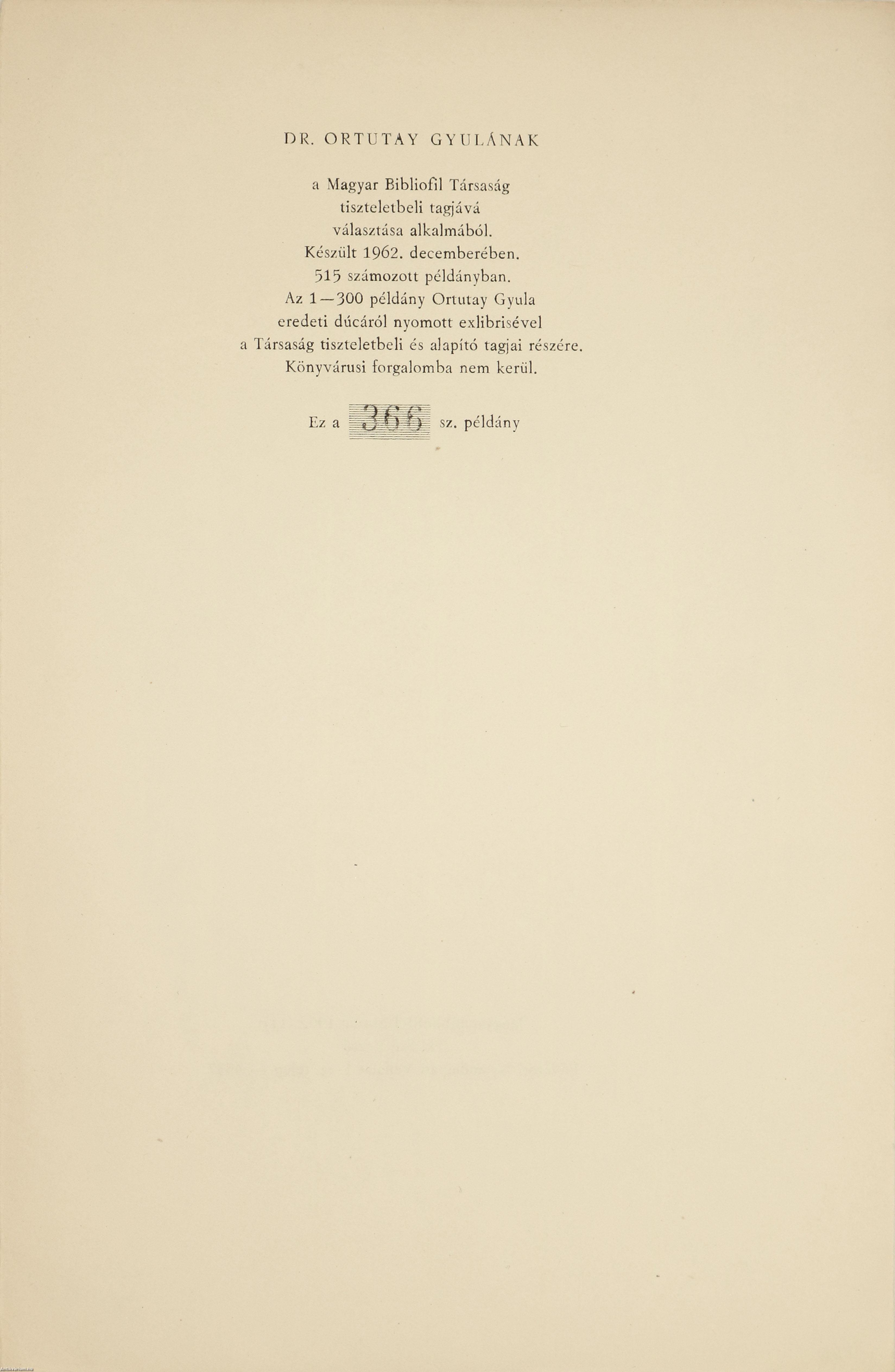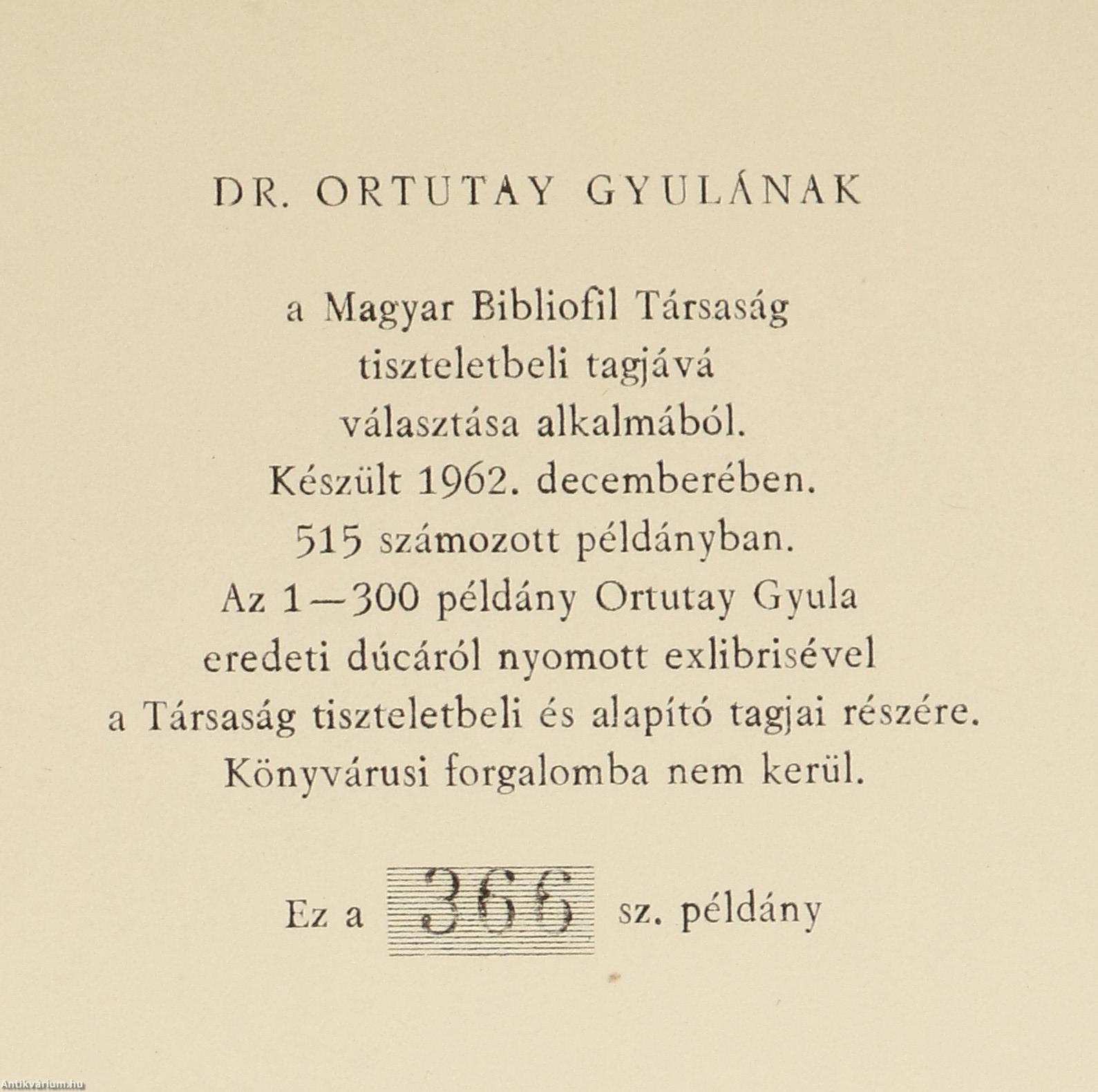 Budapest, 1962, Magyar Bibliofil Társaság (Fővárosi Nyomdaipari Vállalat, Bp.), [6] p.