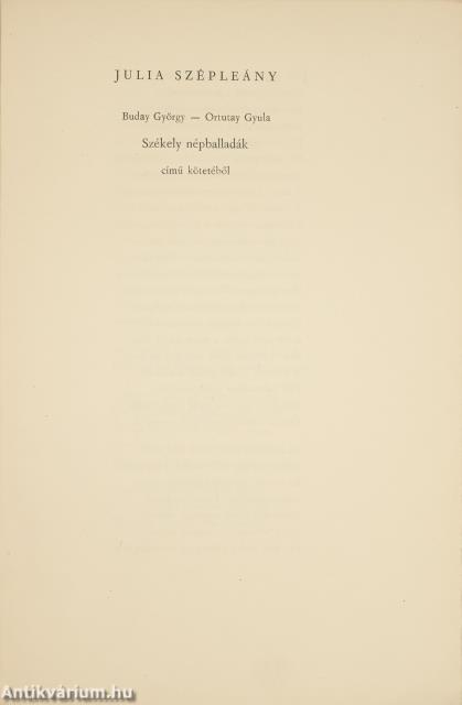 Számozott, bibliofil kiadvány. Julia szépleány. Buday György - Ortutay Gyula: Székely népballadák c. kötetéből. "Dr. Ortutay Gyulának a Magyar bibliofil Társaság tiszteletbeli tagjává választása alkalmából. Készült 1962. decemberében. 515 számozott példányban. Az 1-300 példány Ortutay Gyula eredeti dúcáról nyomott exlibrisével a Társaság tiszteletbeli és alapító tagjai részére. Könyvárusi forgalomba nem kerül. Ez a 366. sz. példány."