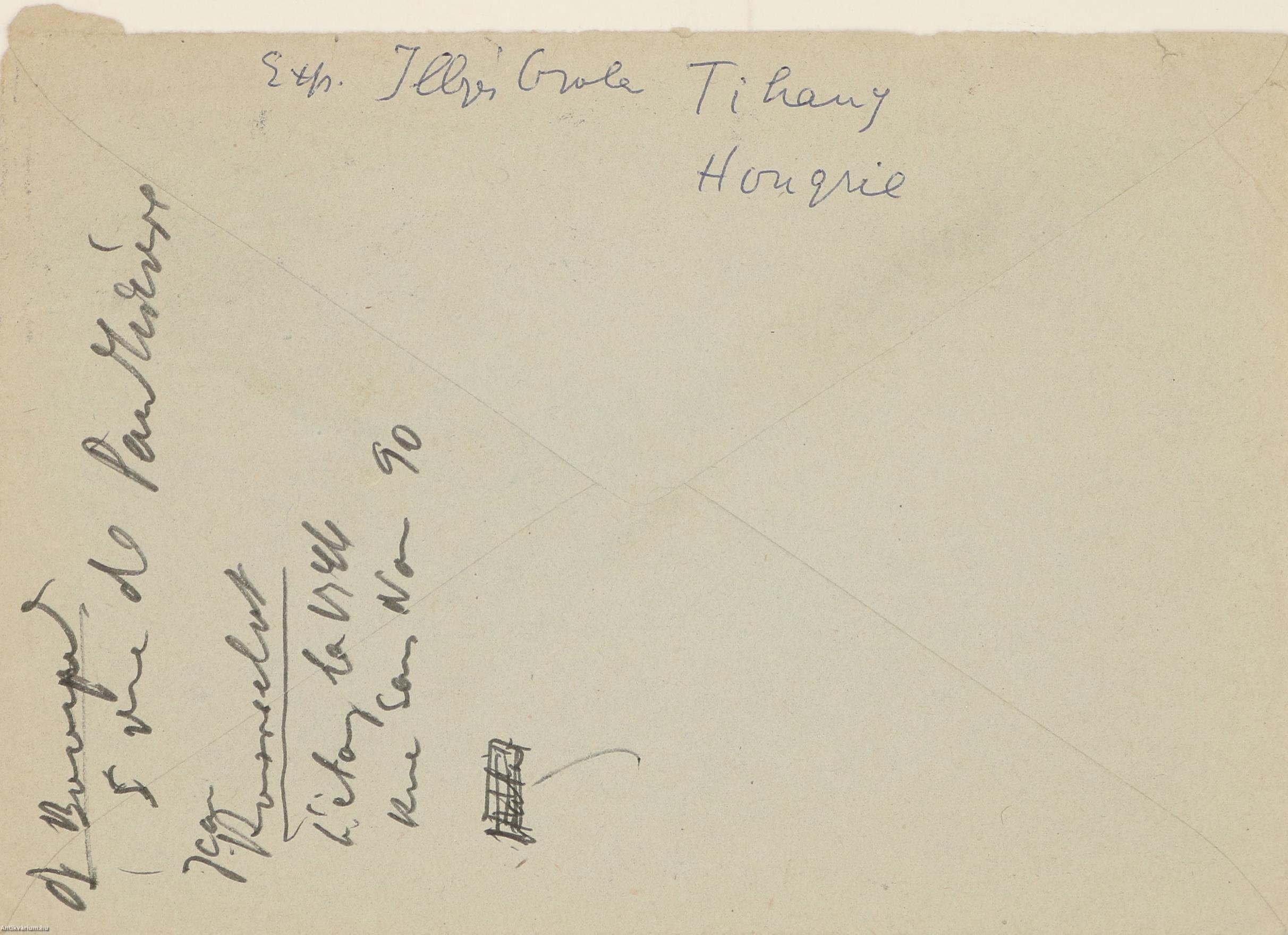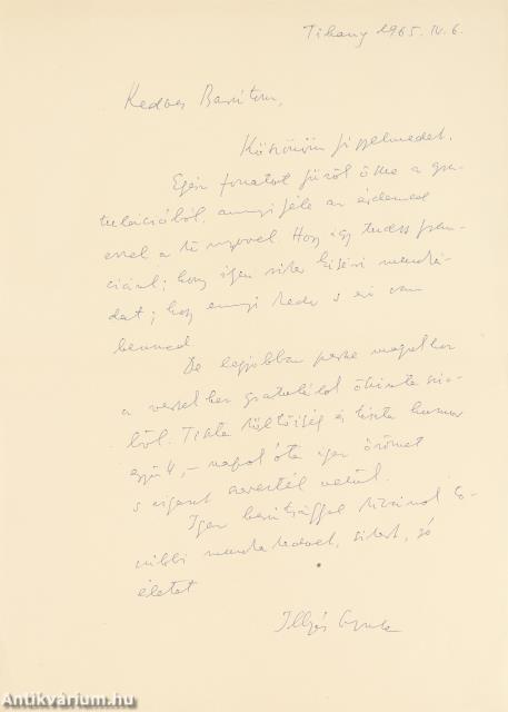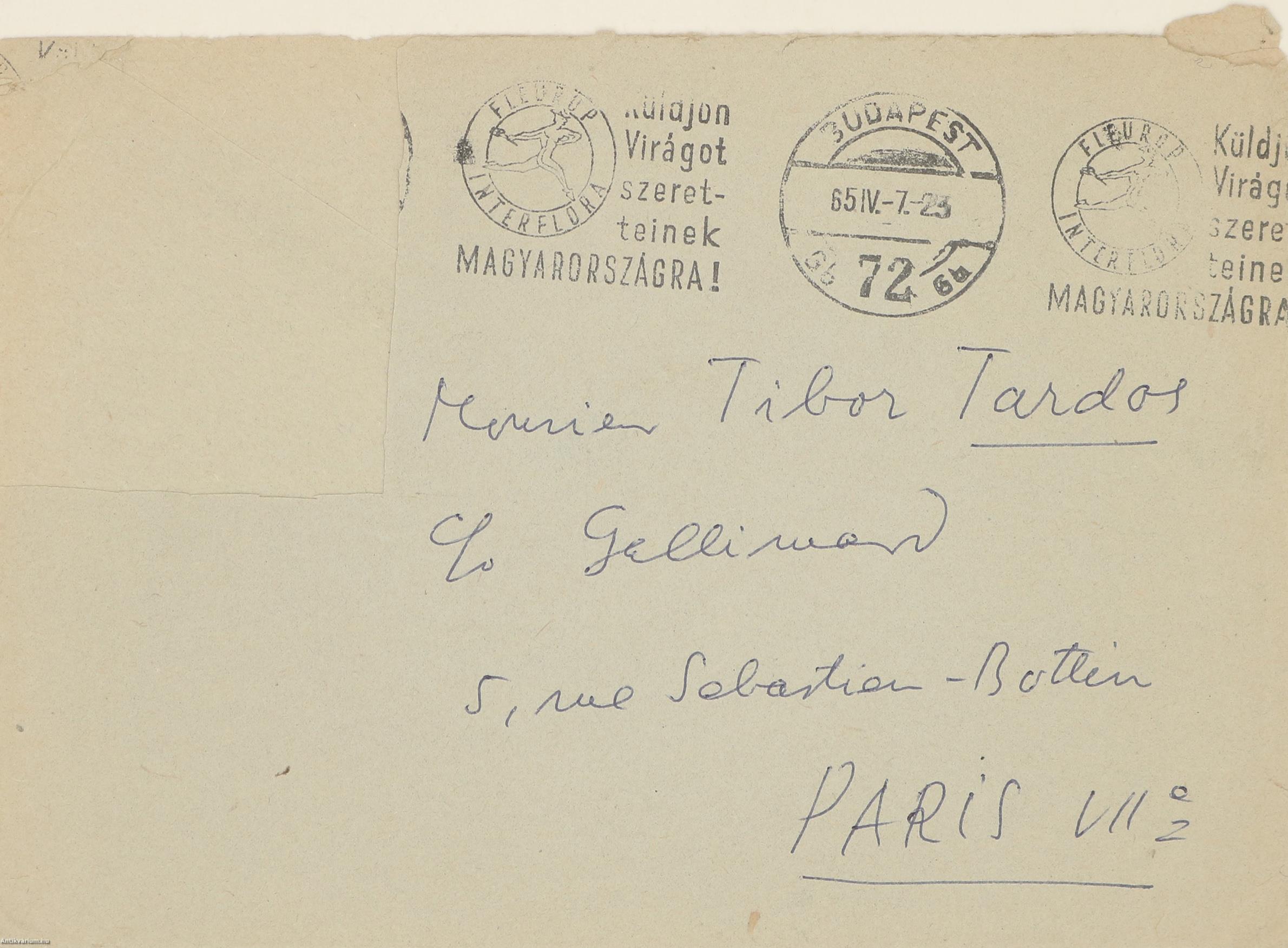 Kézzel írt, keltezéssel ellátott (Tihany, 1965. IV. 6.), jó állapotú magánlevél, eredeti, kézzel címzett, francia nyelvű feljegyzéssel és három postai bélyegzéssel ellátott, hiányos borítékban.