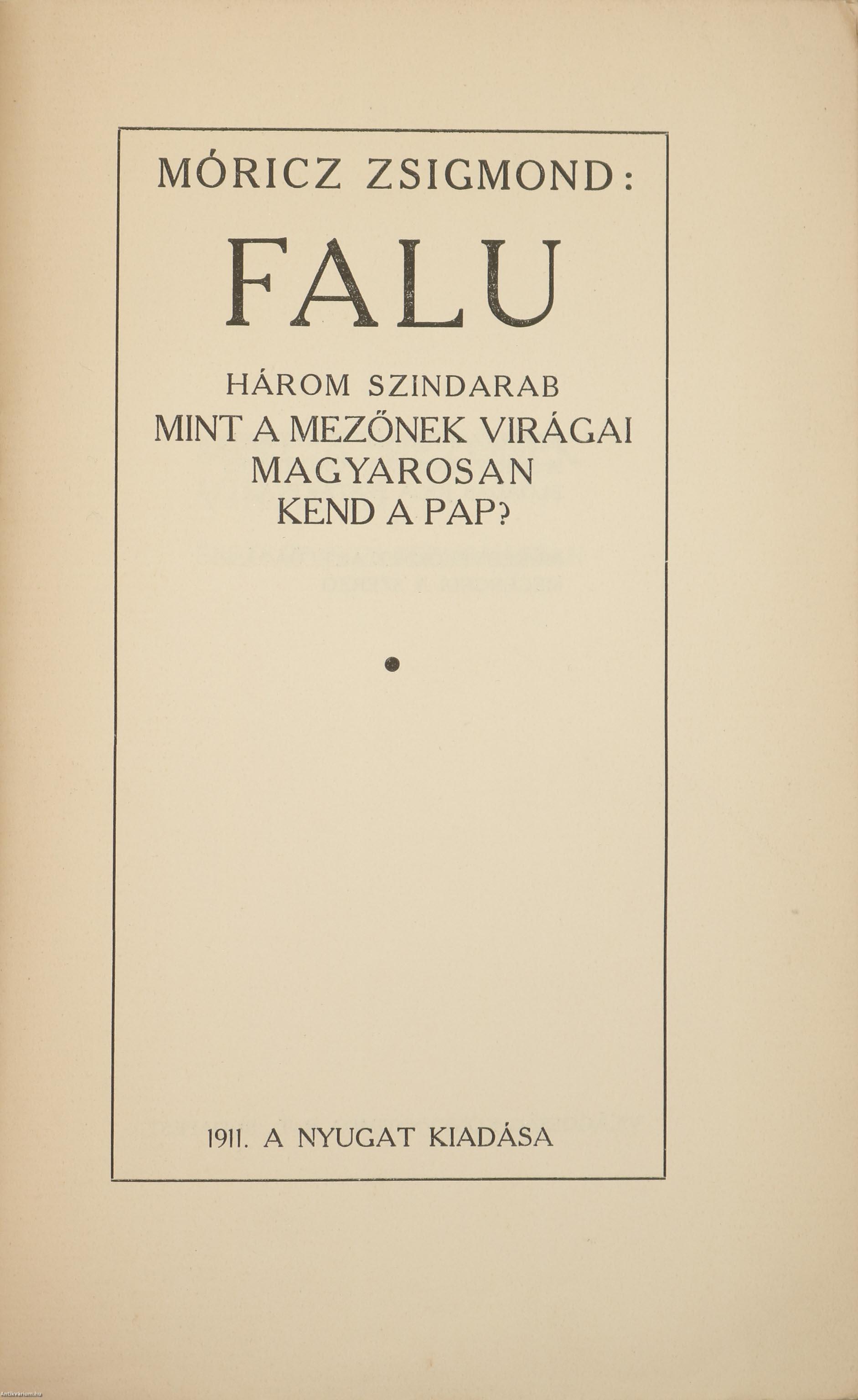 A Falu című könyvet pedig már másnap (!), április 8-án hirdették a lapokban: „A Nyugat kiadásban megjelent Móricz Zsigmond Falu. Három színdarab. A Nemzeti Színház nagysikerű újdonsága.” (Pesti Hírlap, 1911. ápr. 8. 22.) Azaz a könyv és a darab előkészületei egyszerre történtek, a nyomdai folyamatok és a próbák egy időben zajlottak.