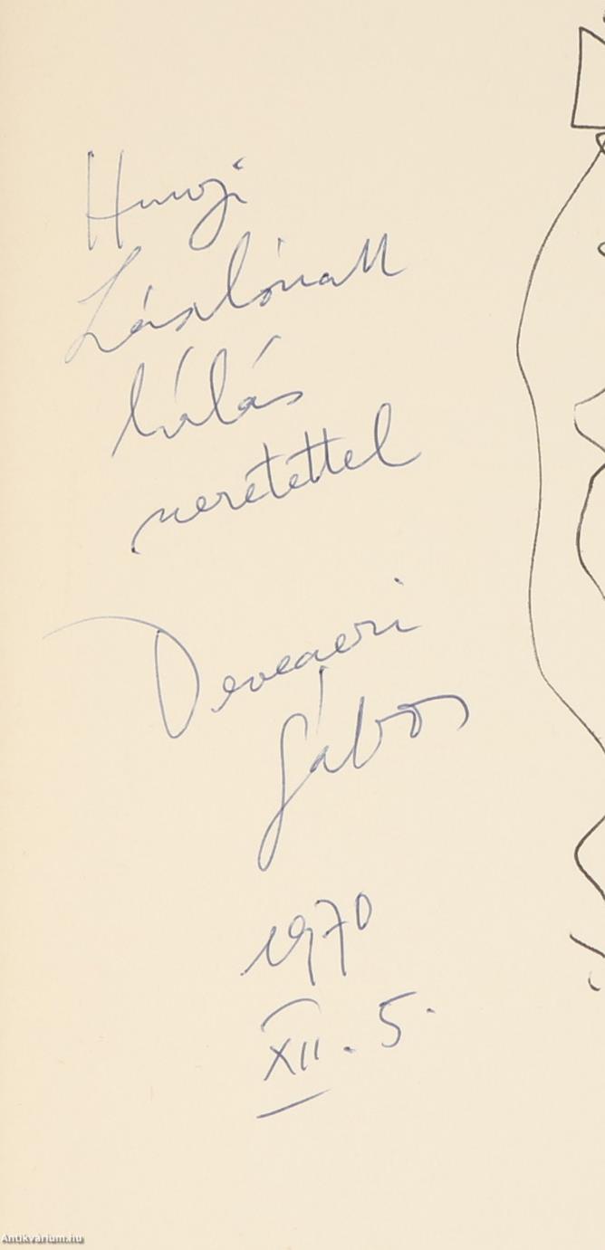Az előzéklapon a szerző, Devecseri Gábor tollal beírt dedikációja olvasható: "H. L.-nak hálás szeretettel Devecseri Gábor. 1970. XII. 5."
