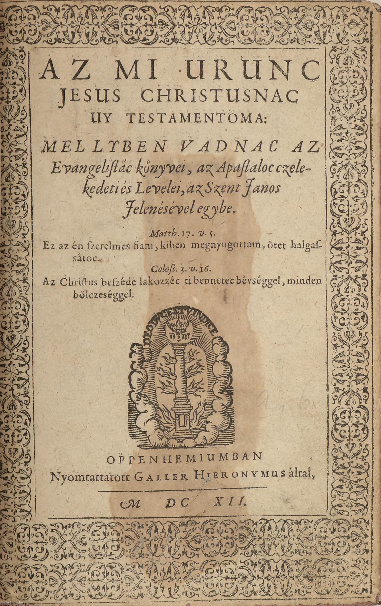 Az mi urunc Jesus Christusnac uy testamentoma: mellyben vadnac az Evangelistác könyvei, az Apastaloc czelekedeti és Levelei, az Szent Janos Jelenésével egybe. / Szent Davidnac soltari az franciai notaknac es verseknec módgyokra magyar versekre forditattac és rendeltettec Az Szenci Molnar Albert által. Egyéb régi szokott Psalmosockal és válogatott lelki énekeckel: Catechismussal, közönséges imátságoknac, és Egyházi ceremoniaknac formáival egyetemben.