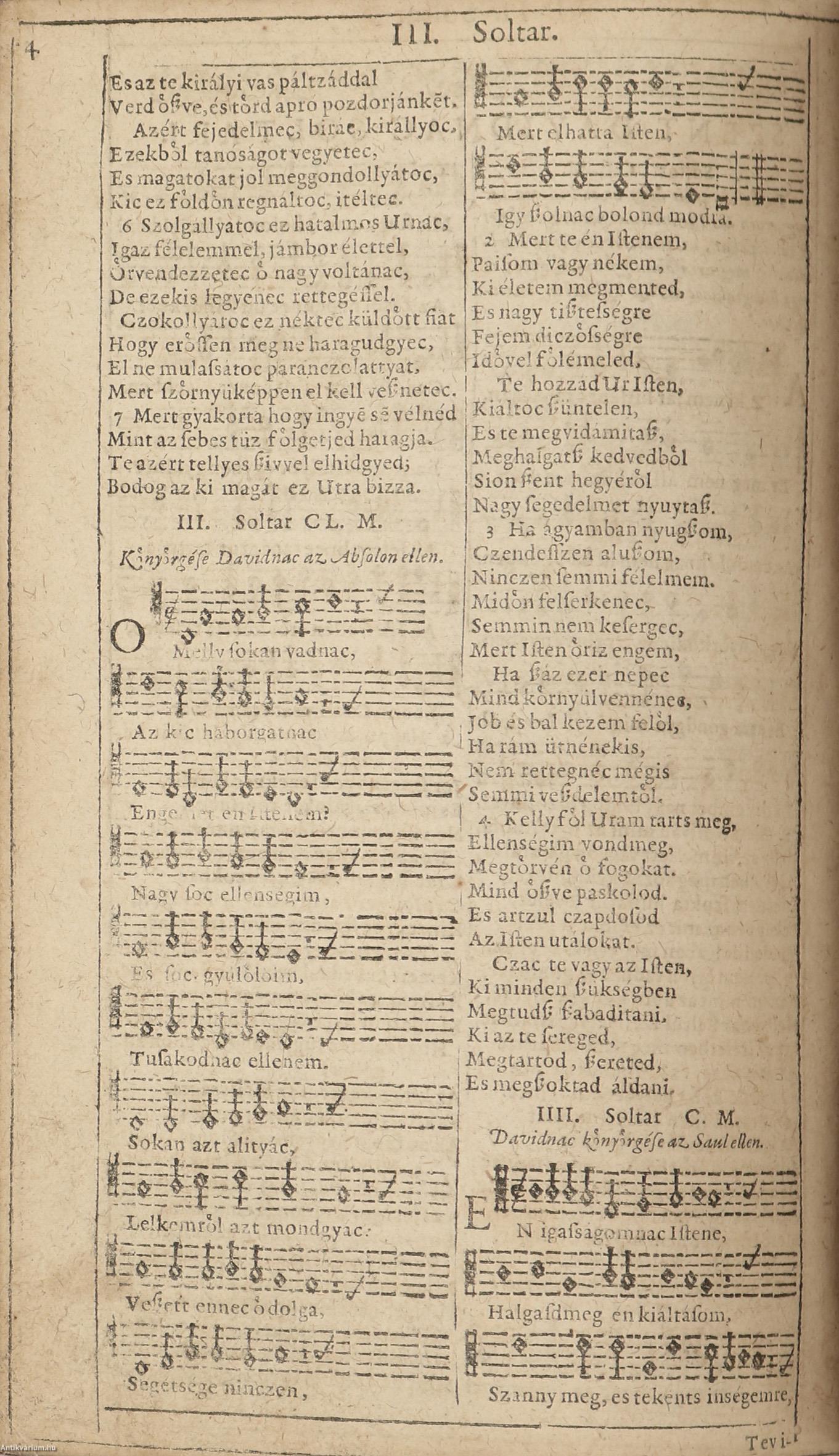 Későbbi bőrkötésben lévő példány feliratozatlan címfedéllel és hátlappal, a könyvgerincre kasírozott, eredeti, aranyozott feliratozású, korabeli könyvgerinccel, foltos címlappal, néhány restaurált, valamint néhány másolattal pótolt (A "Szent Davidnac soltari..." c. mű 143-190. oldala és az utolsó számozatlan lapja) lappal, színezett lapélekkel. A könyvtest vágása miatt néhány lapon a széljegyzet, valamint egy-két restaurált oldal esetében a szöveges rész hiányos.