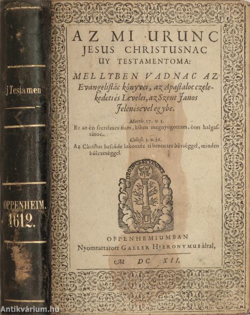 Jelen kötet az Újtestamentumot és a Szent Davidnac soltari... c. zsoltároskönyvet tartalmazza, nincs benne az Ótestamentum. A címfedél verzóján 7 cm x 10,5 cm méretű színes, kézzel írt számozással ellátott Ex-libris címkéje található meg, a készítő megjelölése nélkül. A kötetet Szénásiné Katalin restaurálta 1981-ben. A 133-142. oldalak tollal számozottak. Nyomtattatott Galler Hieronymus által, 1612-ben, Oppenhemiumban.
